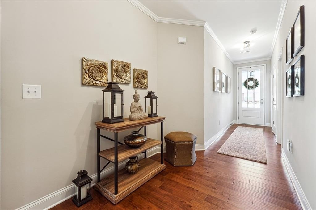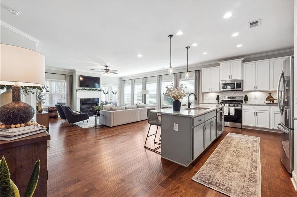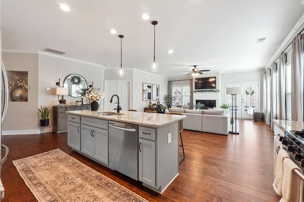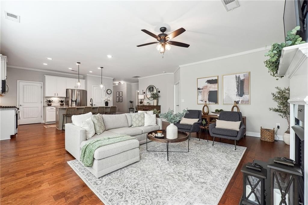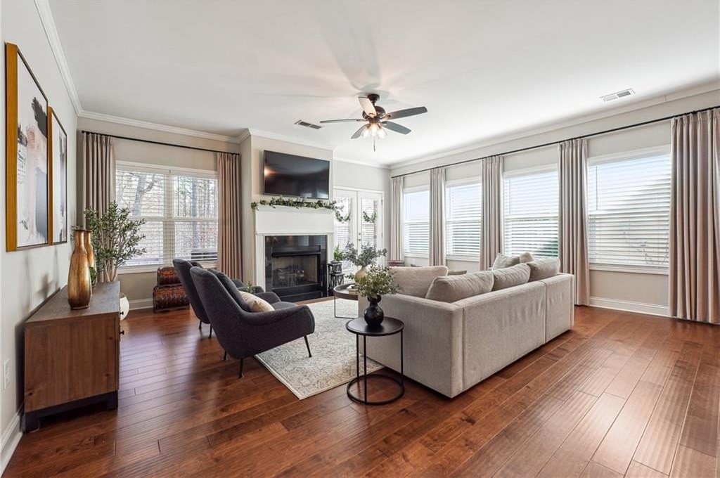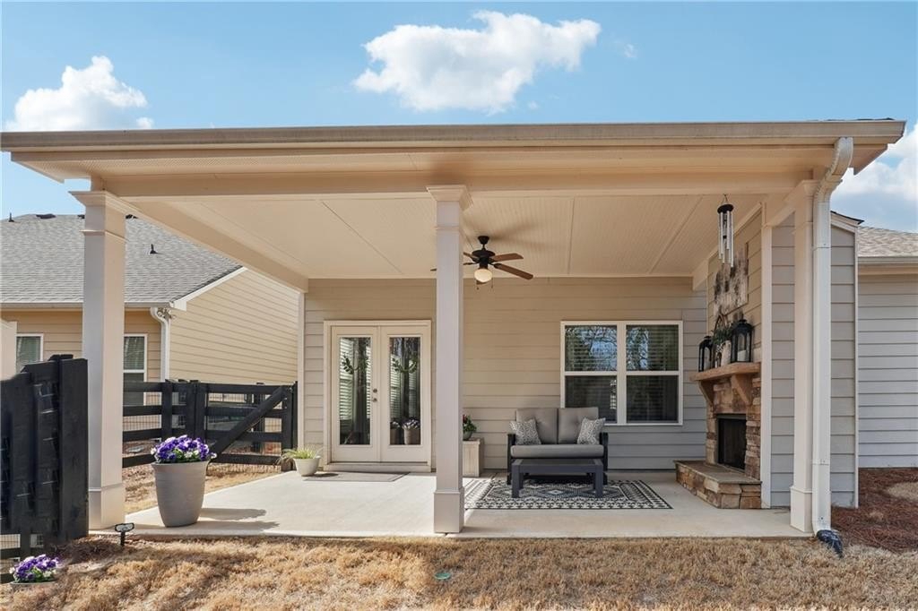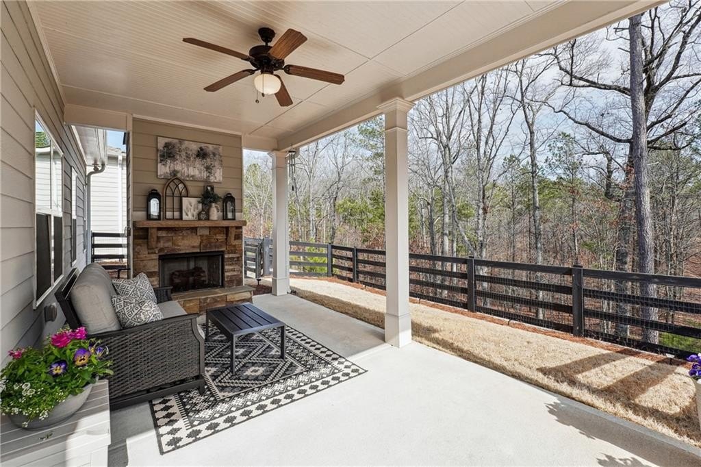 Welcome to this beautifully appointed 3 bedroom, 2 bath, single-level home in the highly sought-after NatureWalk active adult section of a vibrant, amenity-rich community. Blending comfort, style, and low-maintenance living, this home boasts rich hardwood floors, crown molding, and tasteful designer accents throughout. The open-concept layout is light-filled and inviting, anchored by a spacious great room with a cozy gas fireplace and upgraded lighting. The chef’s kitchen is a showstopper—featuring pristine white cabinetry, granite countertops, stainless steel appliances, a walk-in pantry, and elegant finishes that flow seamlessly into the dining and living areas. The primary suite is a true retreat, complete with a tray ceiling, two walk-in closets, and a spa-like bath offering dual vanities, a tiled shower, and beautiful tile flooring. A laundry/mud room with a built-in drop-zone bench adds everyday convenience, while two additional bedrooms provide flexible space for guests, an office, or hobbies.Step outside to a private, fenced backyard where a covered porch with a stunning stone fireplace overlooks peaceful wooded views—the perfect setting for relaxing or entertaining year-round. A two car garage, professional landscaping and exceptional curb appeal complete the package. Residents enjoy a low-maintenance lifestyle with lawn care, trash service and a full calendar of planned social events included. Community amenities abound—clubhouse, walking trails, golf cart paths, dog park, junior Olympic pool, pickleball and tennis courts, basketball courts, and a full-time lifestyle director. This is more than a home—it’s a lifestyle you’ll love coming back to every day.