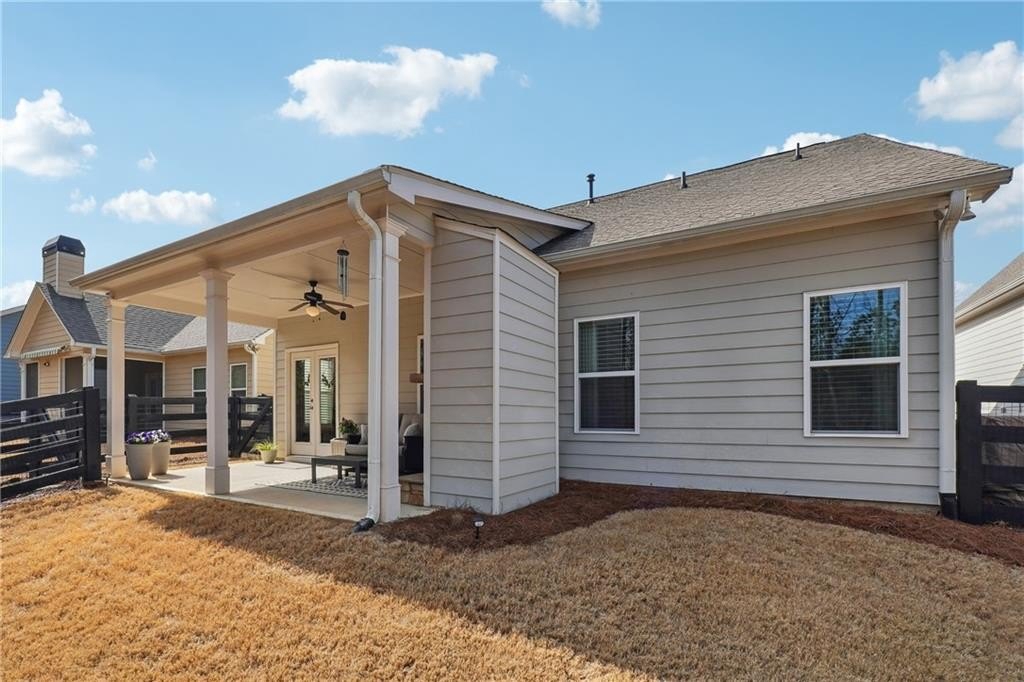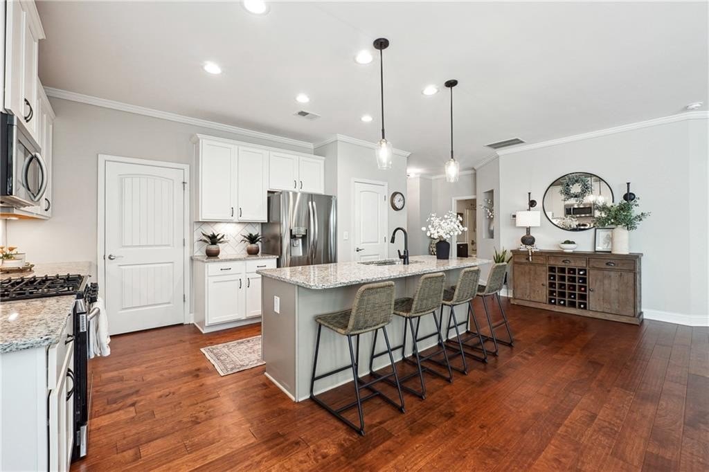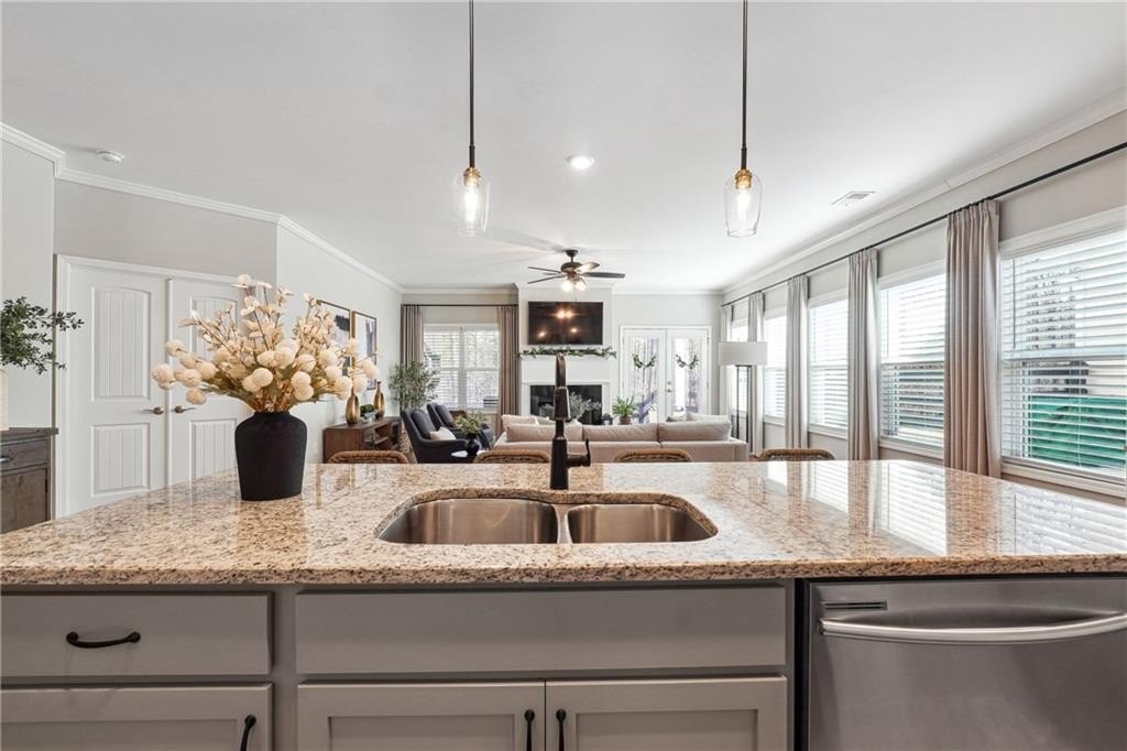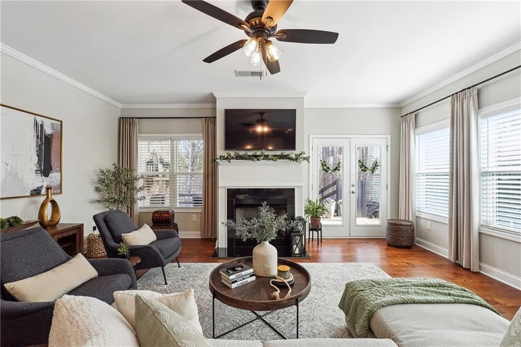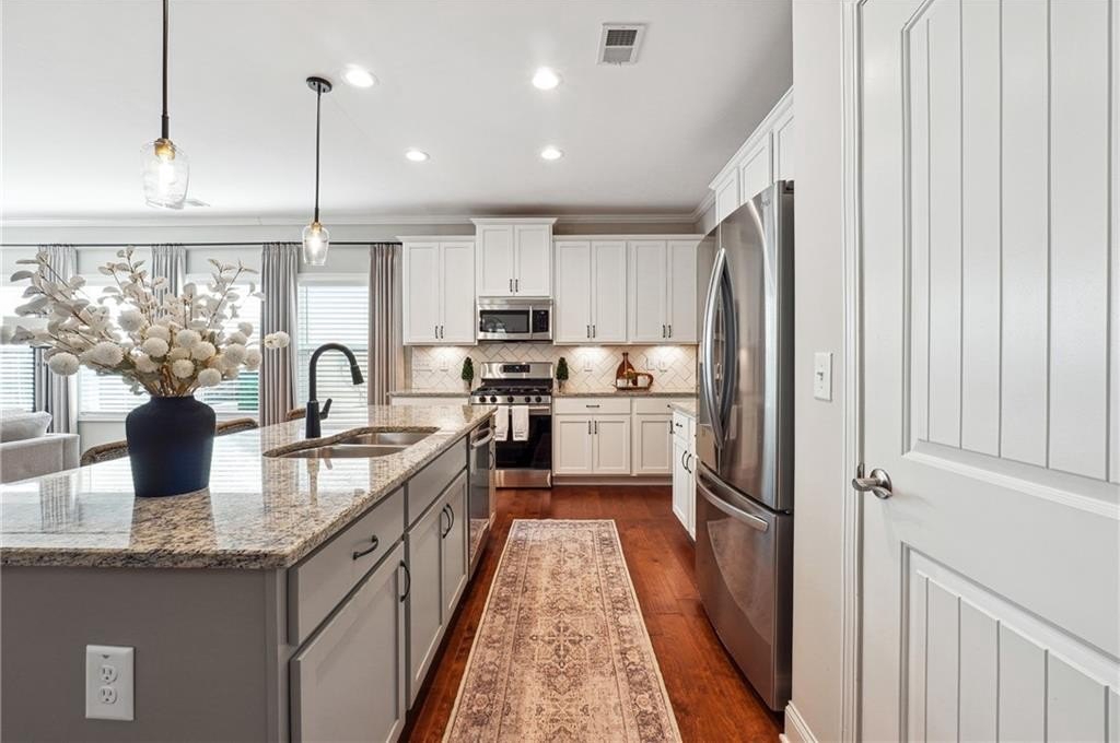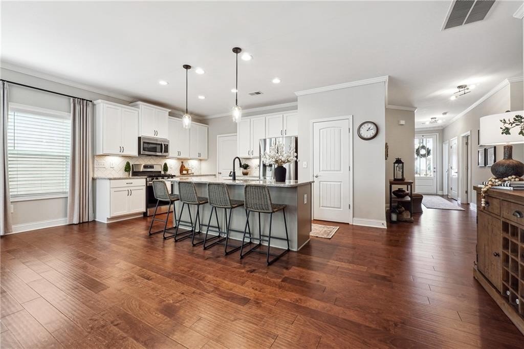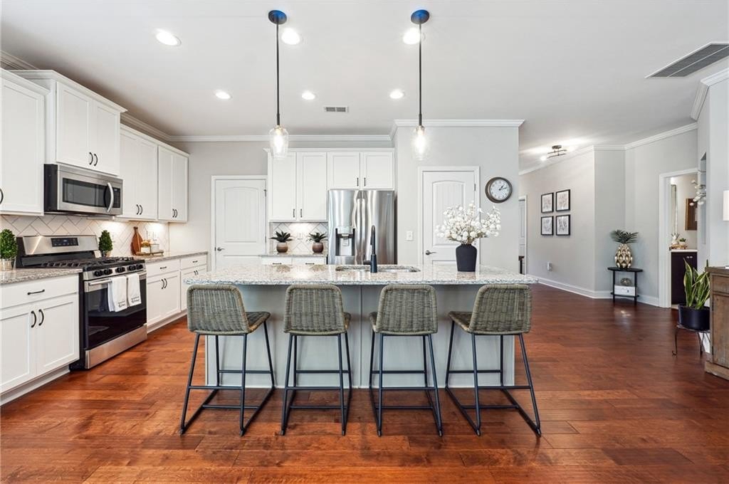 Welcome to this beautifully appointed 3 bedroom, 2 bath, single-level home in the highly sought-after NatureWalk active adult section of a vibrant, amenity-rich community. Blending comfort, style, and low-maintenance living, this home boasts rich hardwood floors, crown molding, and tasteful designer accents throughout. The open-concept layout is light-filled and inviting, anchored by a spacious great room with a cozy gas fireplace and upgraded lighting. The chef’s kitchen is a showstopper—featuring pristine white cabinetry, granite countertops, stainless steel appliances, a walk-in pantry, and elegant finishes that flow seamlessly into the dining and living areas. The primary suite is a true retreat, complete with a tray ceiling, two walk-in closets, and a spa-like bath offering dual vanities, a tiled shower, and beautiful tile flooring. A laundry/mud room with a built-in drop-zone bench adds everyday convenience, while two additional bedrooms provide flexible space for guests, an office, or hobbies.Step outside to a private, fenced backyard where a covered porch with a stunning stone fireplace overlooks peaceful wooded views—the perfect setting for relaxing or entertaining year-round. A two car garage, professional landscaping and exceptional curb appeal complete the package. Residents enjoy a low-maintenance lifestyle with lawn care, trash service and a full calendar of planned social events included. Community amenities abound—clubhouse, walking trails, golf cart paths, dog park, junior Olympic pool, pickleball and tennis courts, basketball courts, and a full-time lifestyle director. This is more than a home—it’s a lifestyle you’ll love coming back to every day.