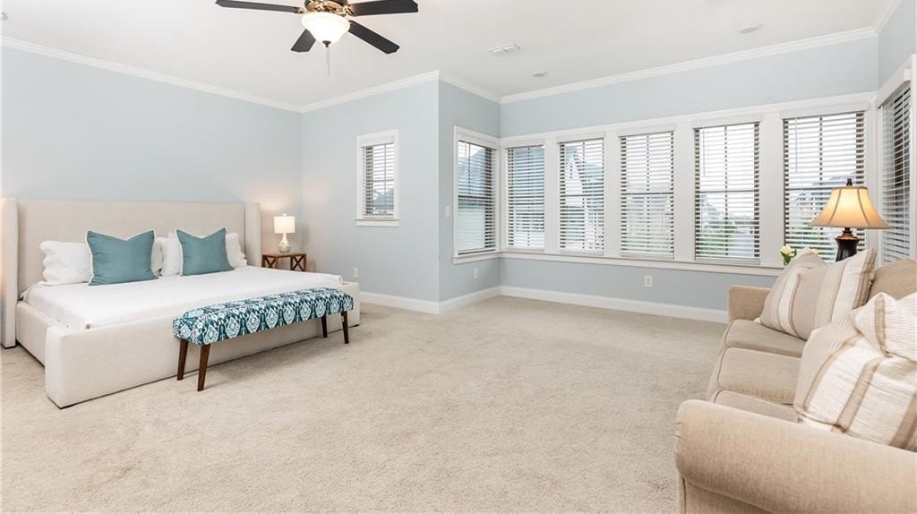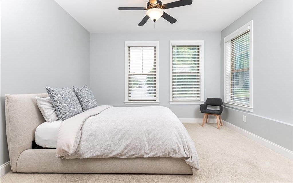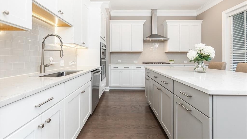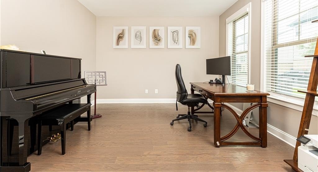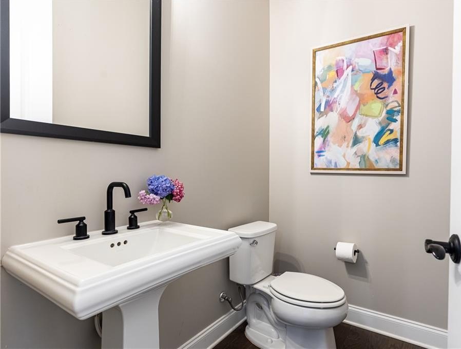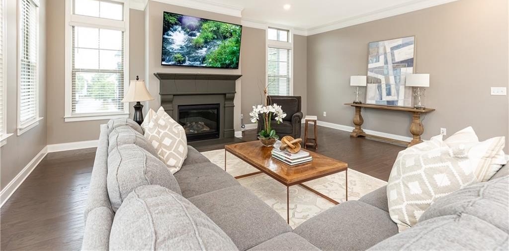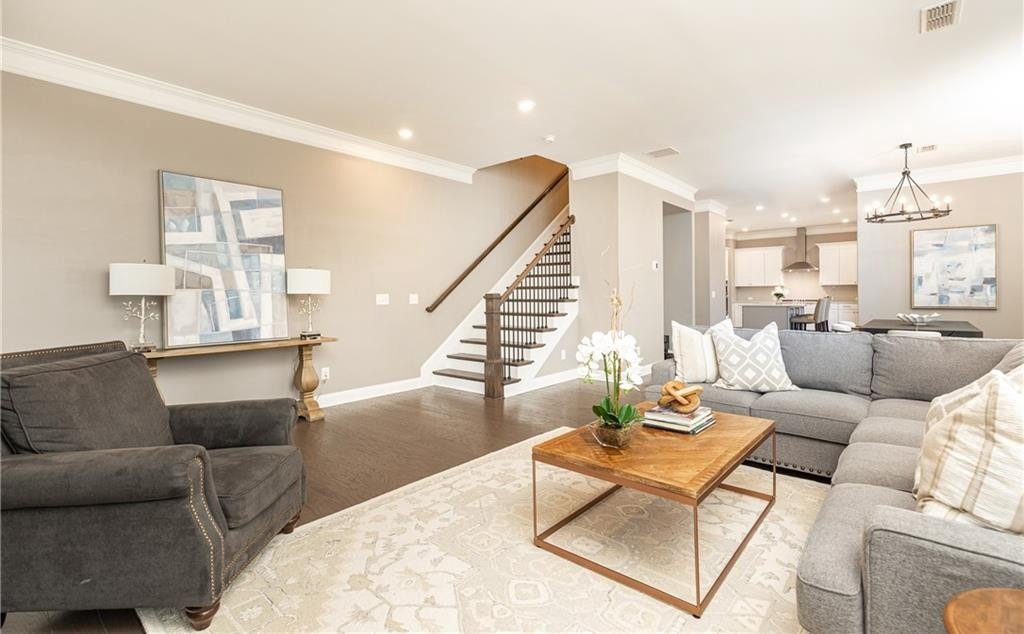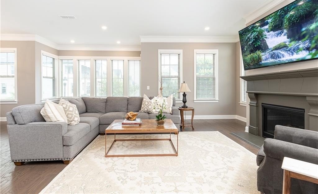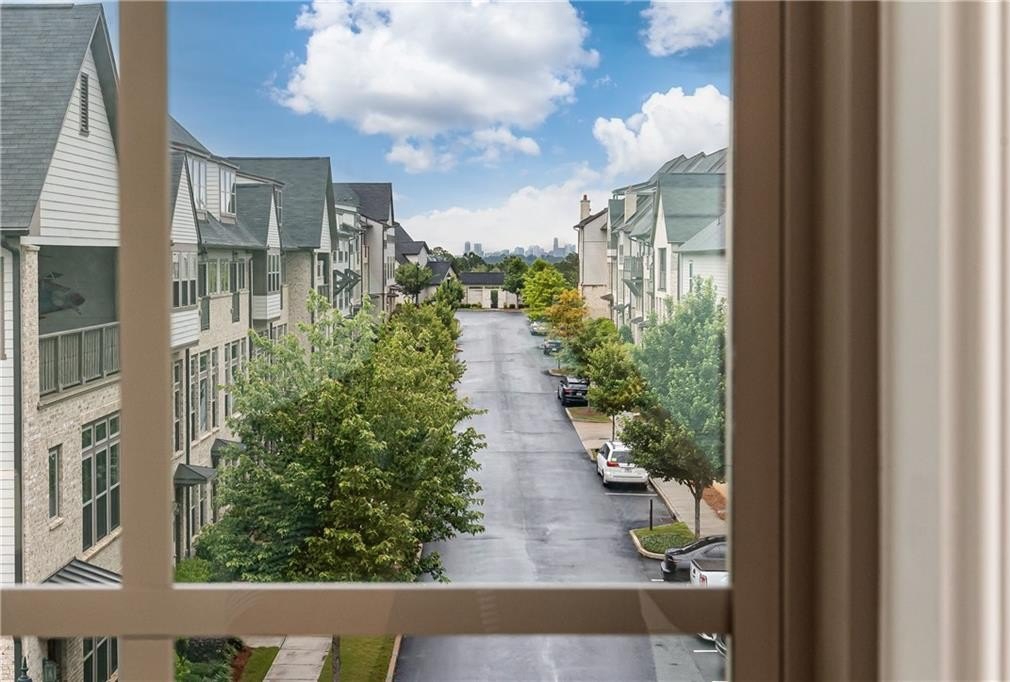 Gorgeous end-unit townhome in the gated Reverie on Cumberland, featuring one of the largest floor plans in the community with stunning skyline views of Atlanta! This 3BR/3.5BA home offers a step-less entry featuring elegant living across three spacious floors. The open main level boasts 10’ ceilings, hardwood floors, a chef’s kitchen with quartz countertops, stainless steel appliances, island with counter seating, formal dining, and a fireside family room. Enjoy Atlanta skyline views from the large covered terrace and oversized windows. The spacious primary suite features a soaking tub, dual vanities, walk-in shower, and custom closet. An additional ensuite bedroom and large laundry room complete the top level. The terrace level offers a private ensuite bedroom and dedicated home office with 2-car garage and abundant storage with built-in shelving storage. Ideally located in the community across from the pool with plenty of guest parking and one of the few units with a private front yard/greenspace just outside your front door. This bright and airy townhome will surprise and delight you as it lives so much like a single family home with plenty of open family living and private spaces with huge closests and abundant storage. Enjoy the resort-style amenities including large pool, clubhouse with terrace patio and fire pit, and fitness center, —all within a secure, gated community. This home delivers contemporary sophistication, comfort, and unbeatable location just minutes to Vinings Jubilee, Truist Park, The Battery, wonderful dining, shopping & the Silver Comet Trail and offers easy interstate/highway access.