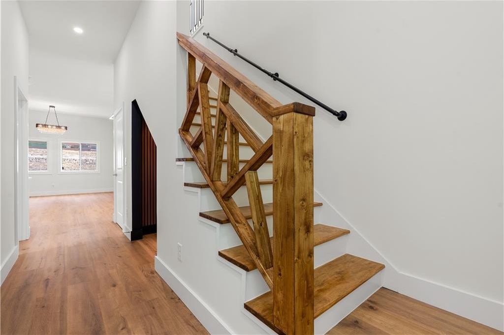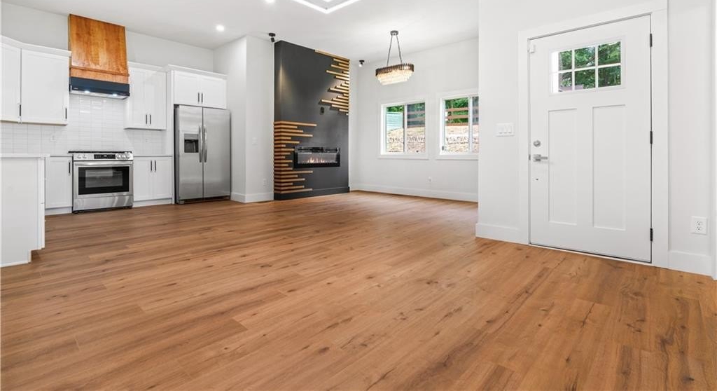 Designer kitchen includes quartz countertops, 42" custom cabinets, handcrafted hood, gas range, and walk-in pantry. Features luxury waterproof flooring, handmade stair railings, and modern lighting throughout.