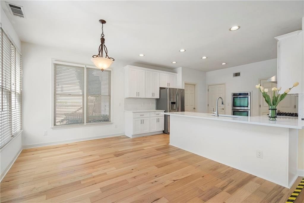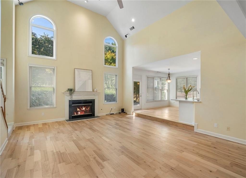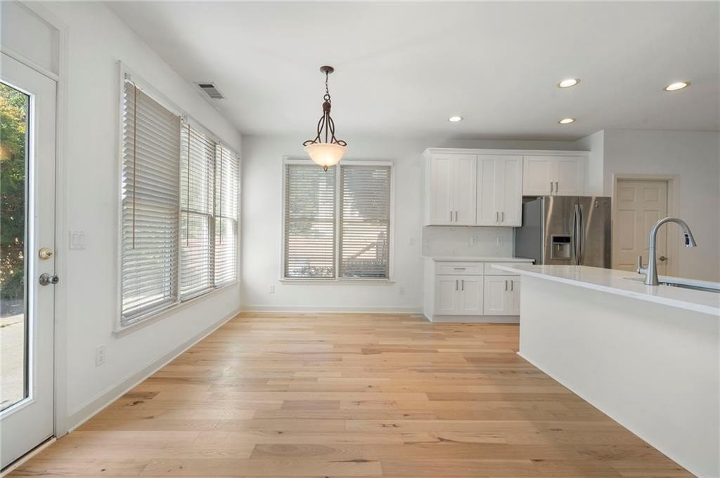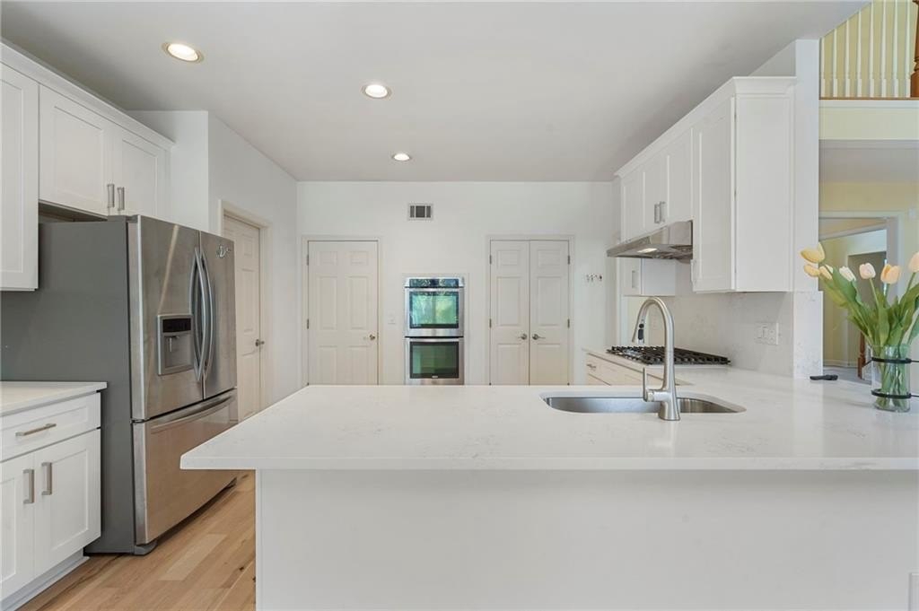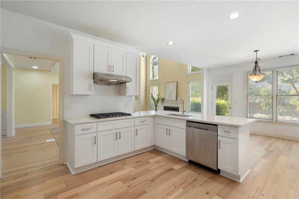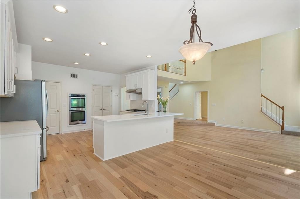 The very open and functional floor plan includes a soaring two-story family room filled with natural light. The kitchen boasts quartz countertops with a matching backsplash, new cabinetry, a brand-new gas cooktop with a vented hood, and opens to a bright breakfast area.