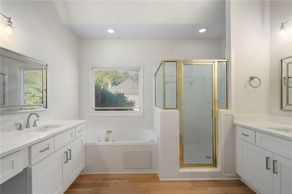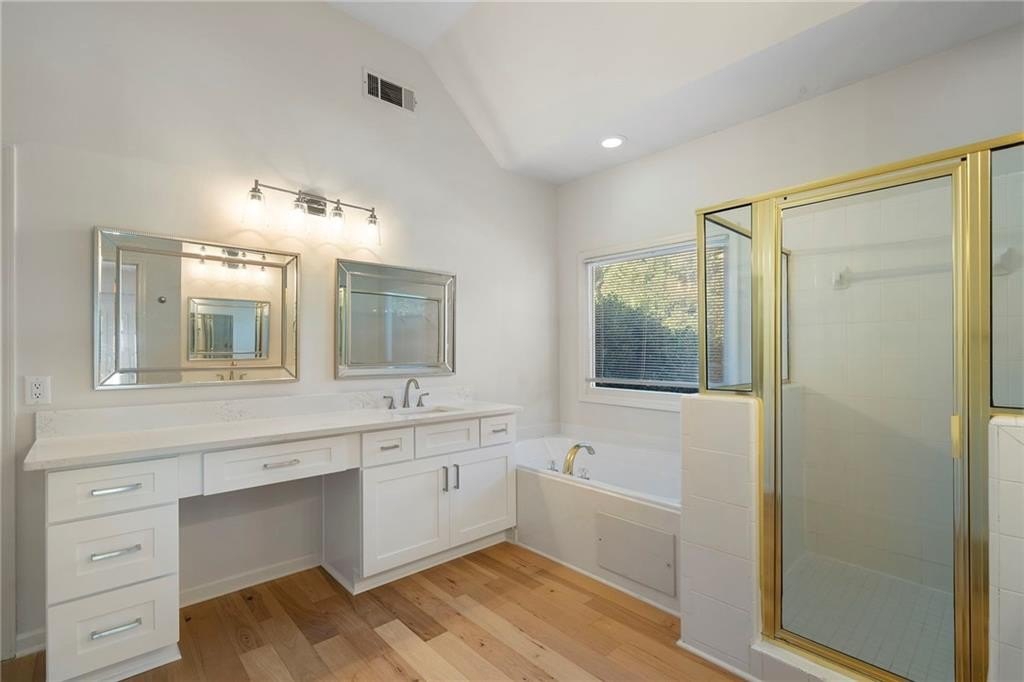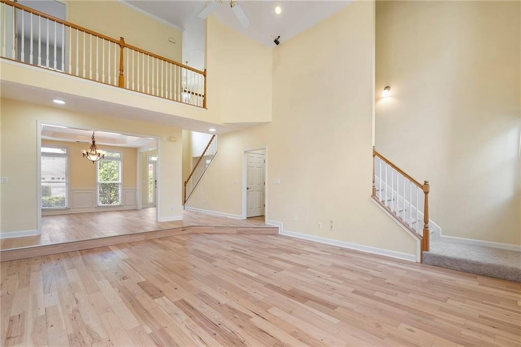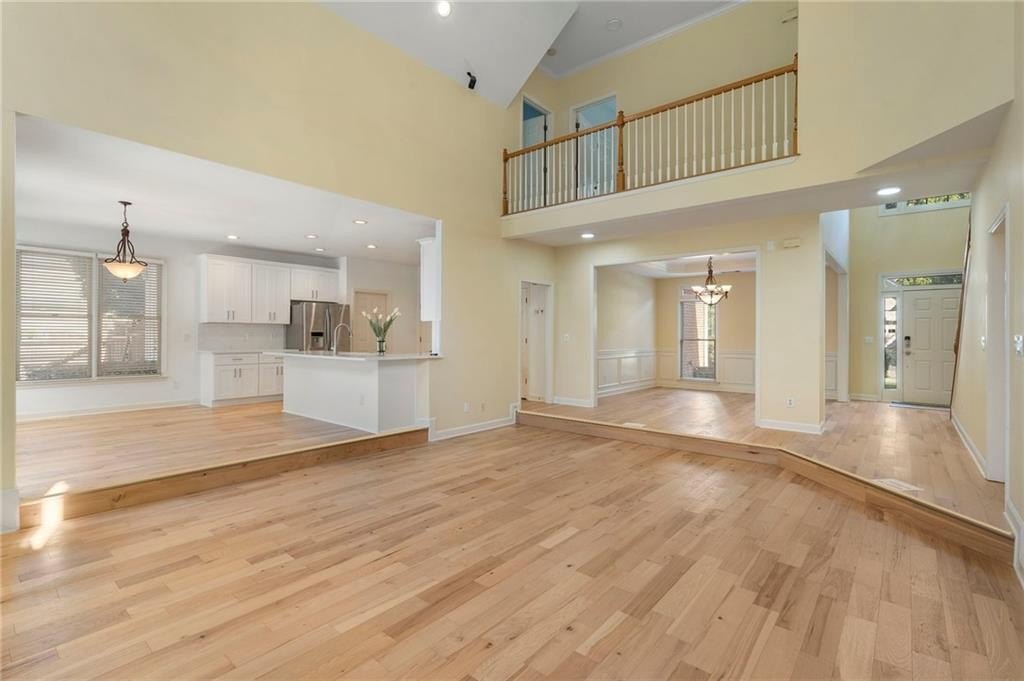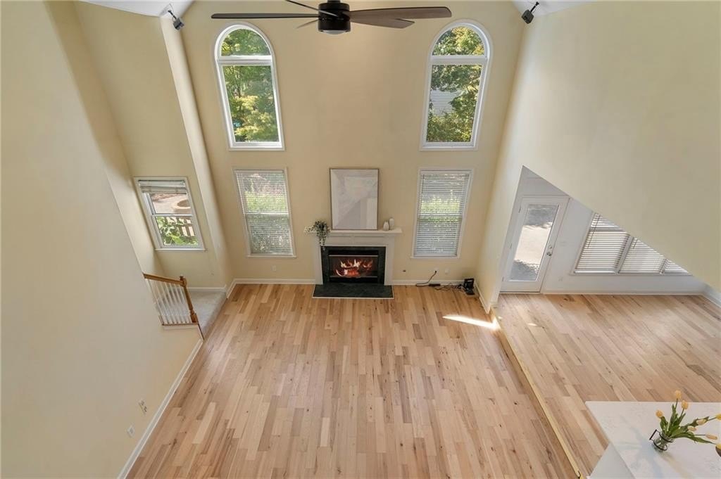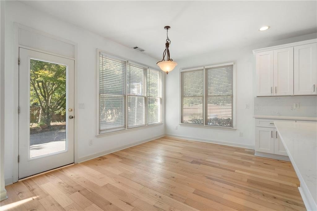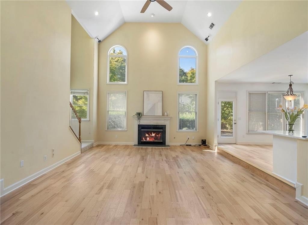 The very open and functional floor plan includes a soaring two-story family room filled with natural light. The kitchen boasts quartz countertops with a matching backsplash, new cabinetry, a brand-new gas cooktop with a vented hood, and opens to a bright breakfast area.