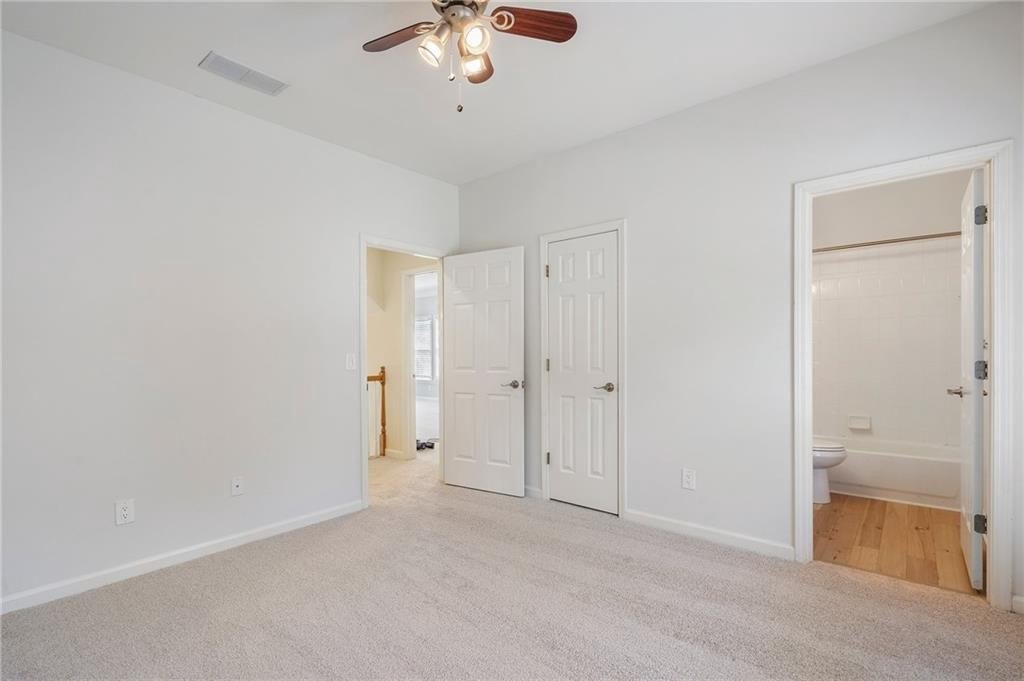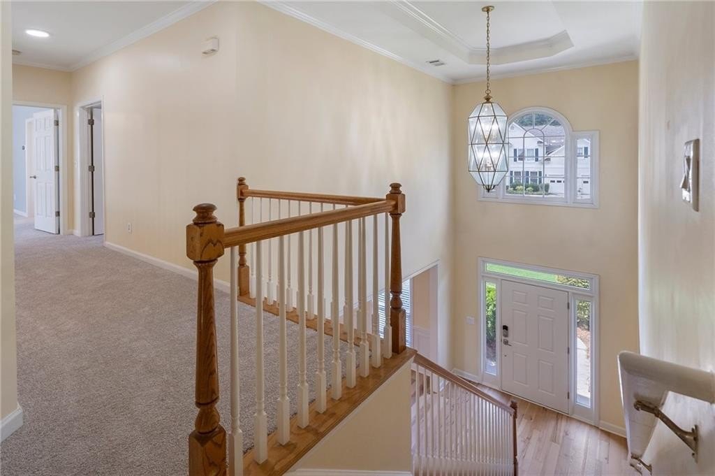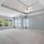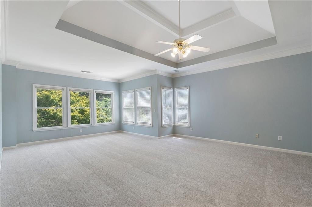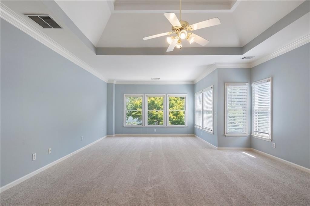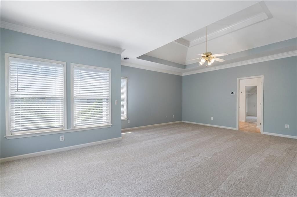 Upstairs, the spacious owner’s suite features a deep tray ceiling, a sitting area, a jetted tub, a walk-in shower, and a generous walk-in closet. All three secondary bedrooms are well-sized with high ceilings; one includes its own private en-suite bath.