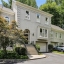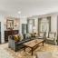 Inside, the living room features a wall of windows and French doors opening to a balcony with wooded view, built-in bookcases, a mirrored bar and glass shelving, two Sub-Zero refrigerator drawers and a Scotsman nugget ice maker. Behind custom doors, you’ll also find a chic built-in desk nook with file drawers—perfect for a compact home office setup.