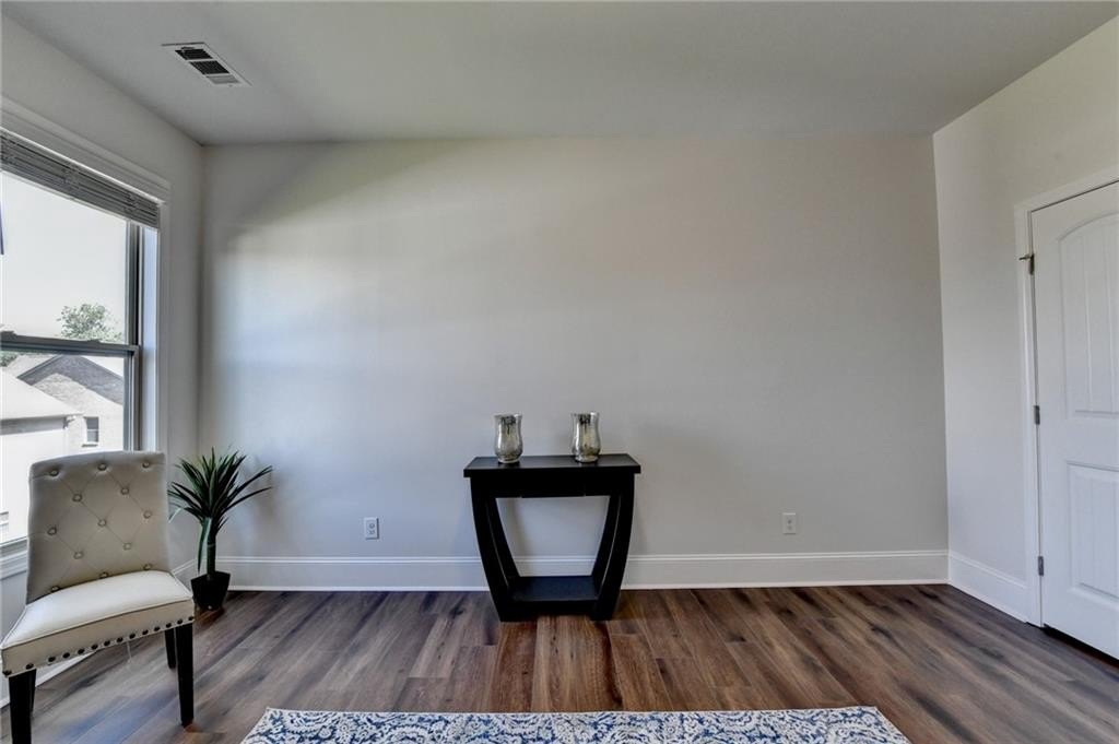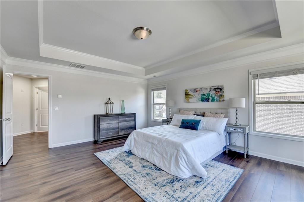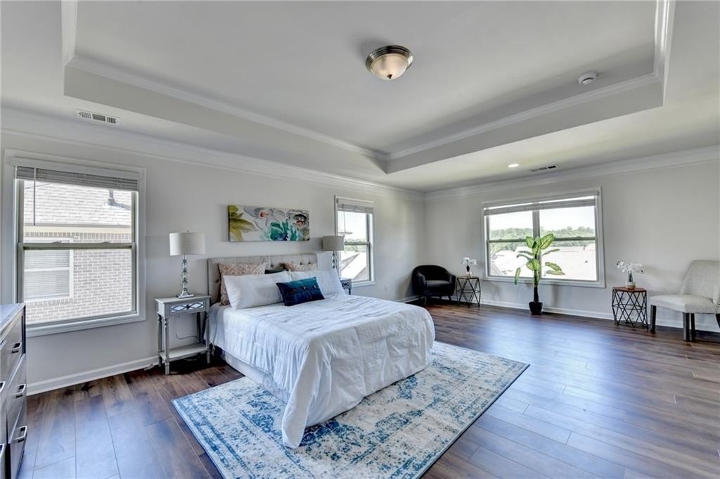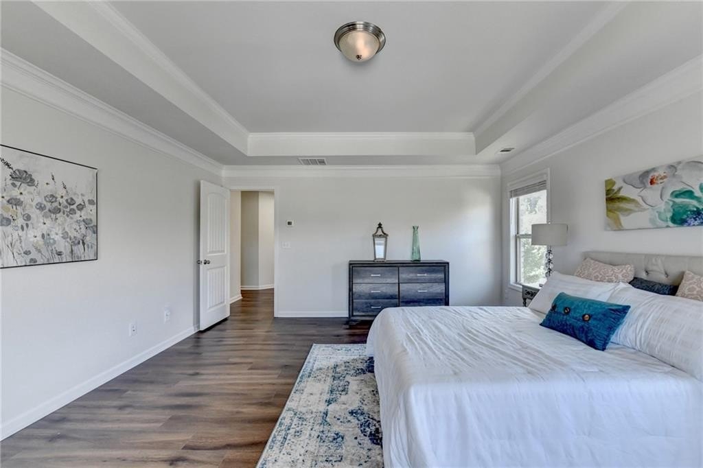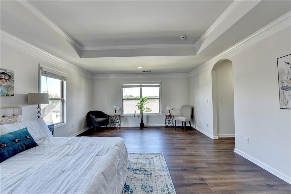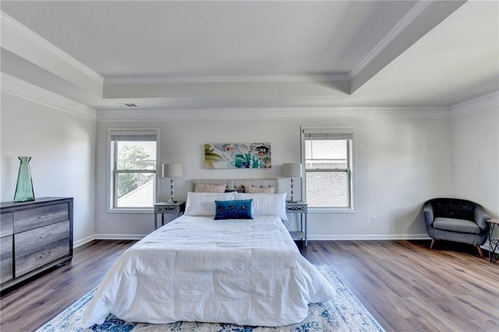 Upstairs, retreat to the expansive primary suite featuring tray ceilings and a cozy sitting area, perfect for a private lounge or media space. The spa-like en-suite bath includes dual vanities, a garden tub, separate shower, and a large walk-in closet. Three additional generously sized bedrooms, a shared full bath, and a laundry room complete the upper level. Recent upgrades include over $25,000 in luxury vinyl plank (LVP) flooring and fresh interior paint.