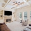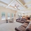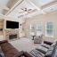 The main-level owner’s suite provides a peaceful retreat, complete with tray ceilings, a spacious layout, and easy access to the main living areas. The living room impresses with soaring coffered ceilings, custom built-ins, built-in surround sound, and a gas/wood-burning fireplace—perfect for cozy nights or entertaining guests.