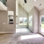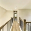 The living room showcases tall ceilings with an impressive sense of space, and an upstairs walkway overlooks the main living area, adding architectural character and creating a beautiful visual connection between floors.
