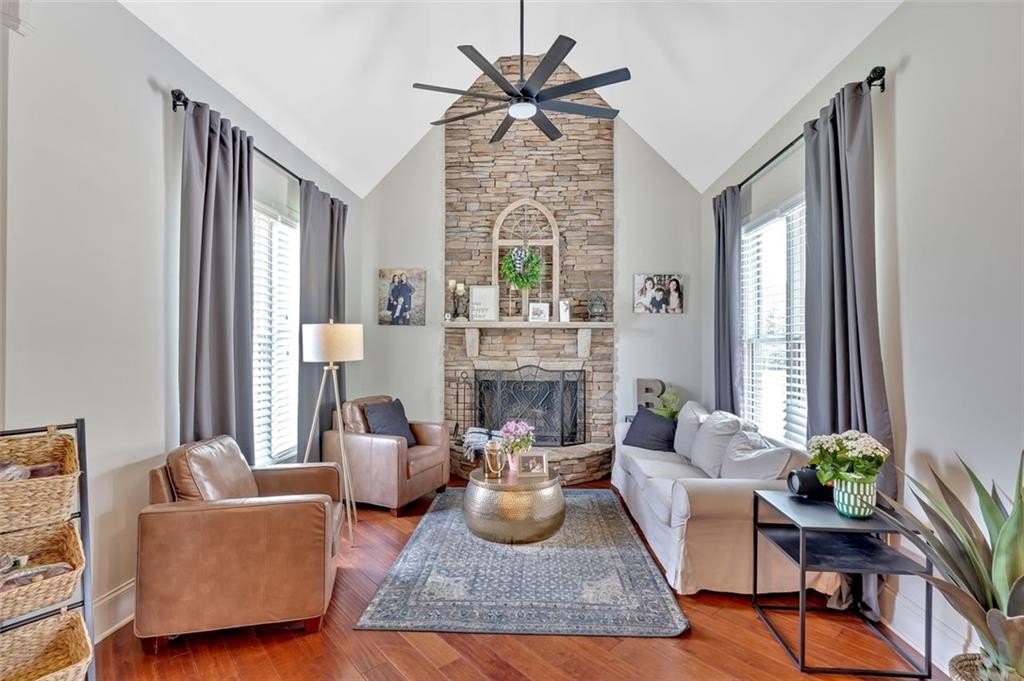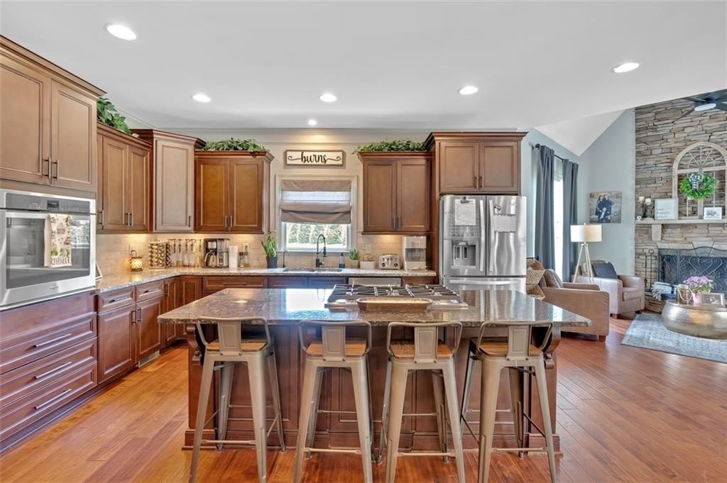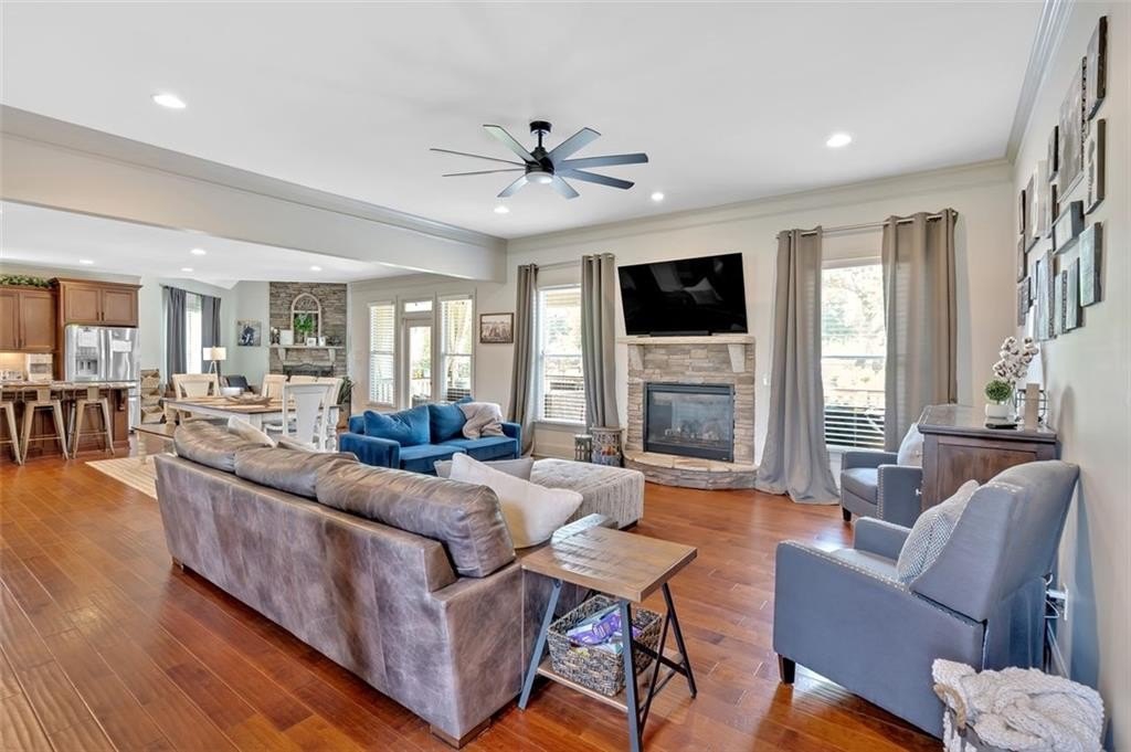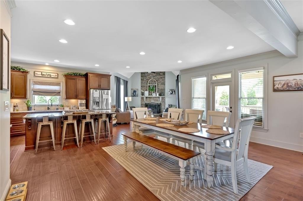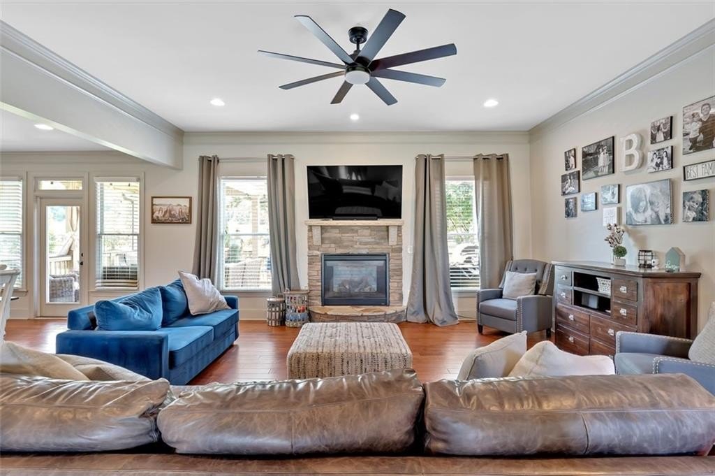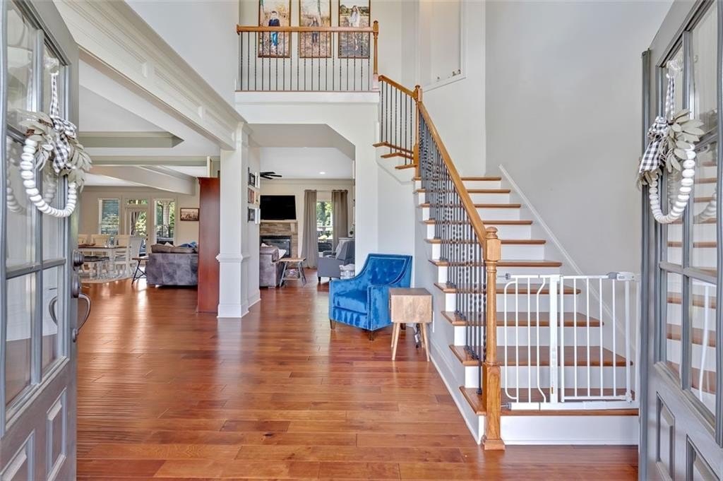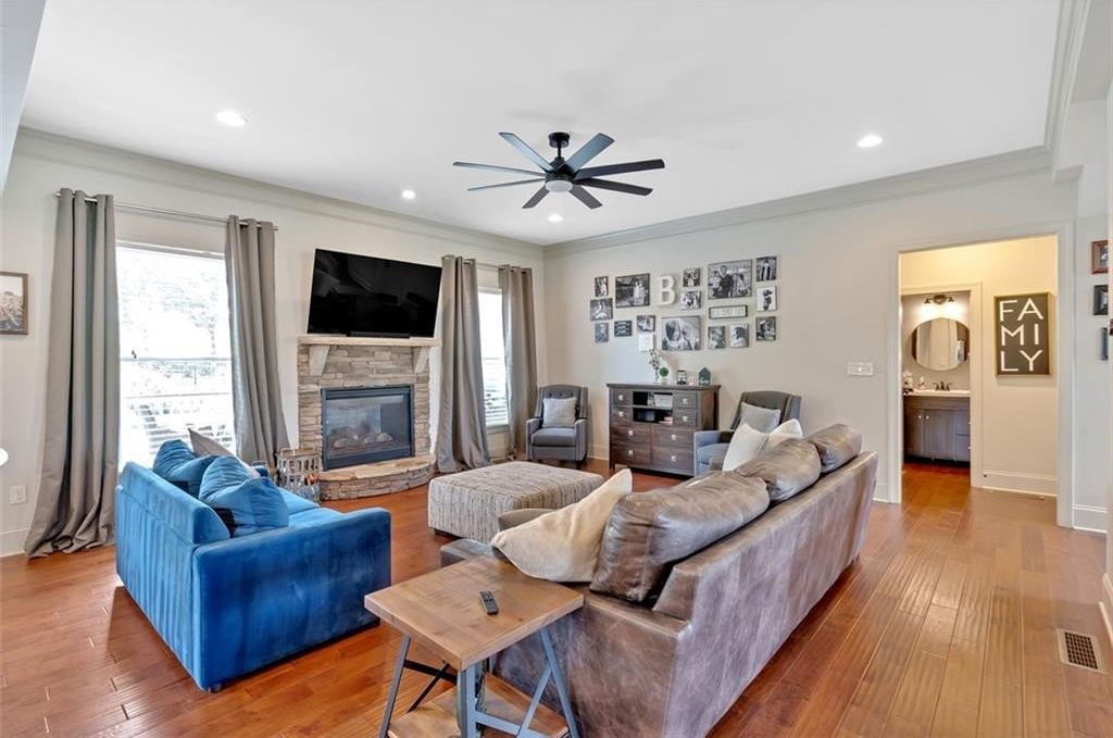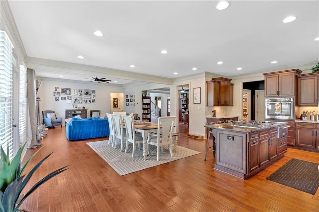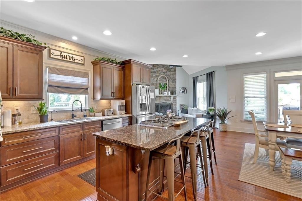 Inside, you’ll find nearly 4,000 square feet of refined living space with designer touches throughout. The dramatic main level boasts an open-concept layout with soaring ceilings, a chef’s kitchen featuring a gas cooktop, built-in oven, warming drawer, walk-in pantry, and wine fridge. Enjoy cozy evenings in the keeping room with wood-burning fireplace or unwind in the spacious living room with gas fireplace.