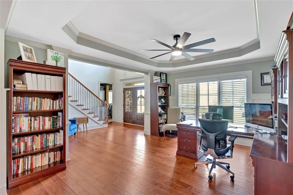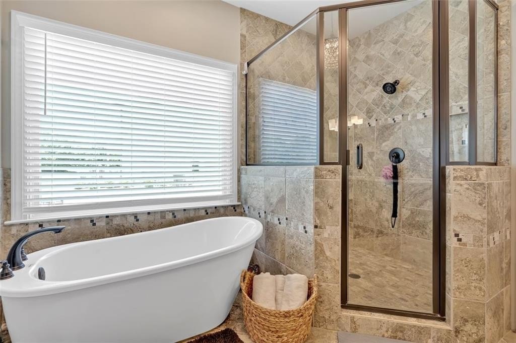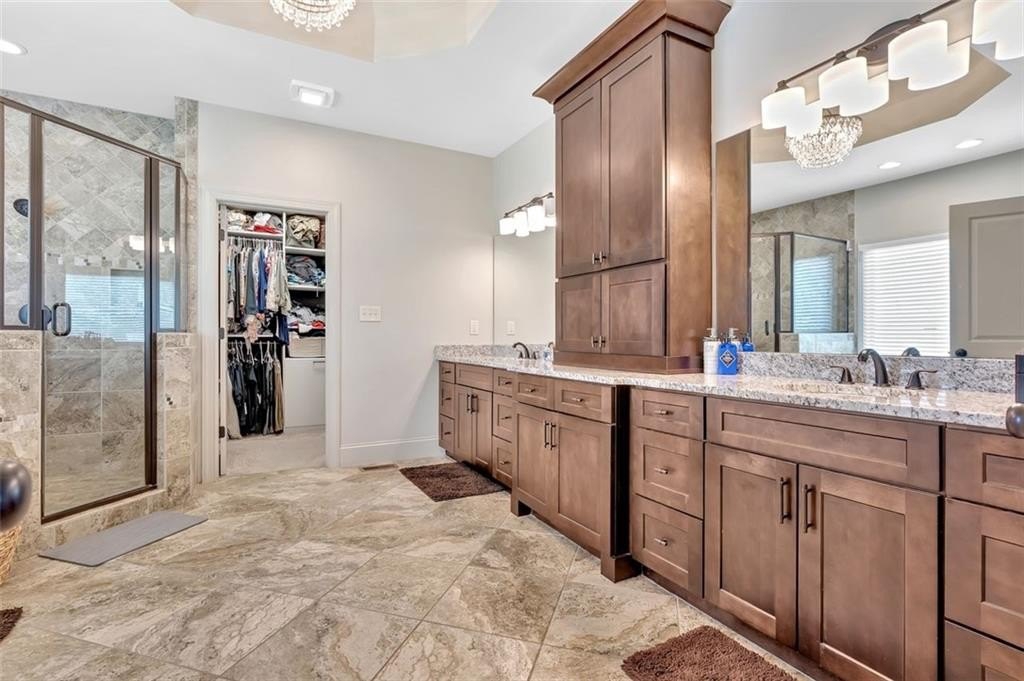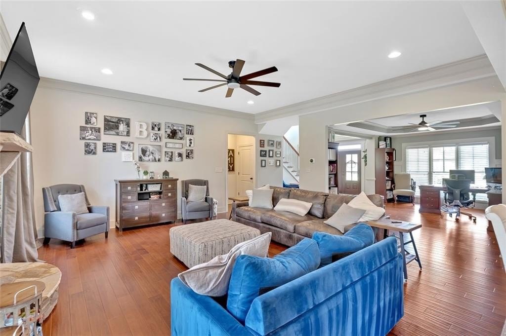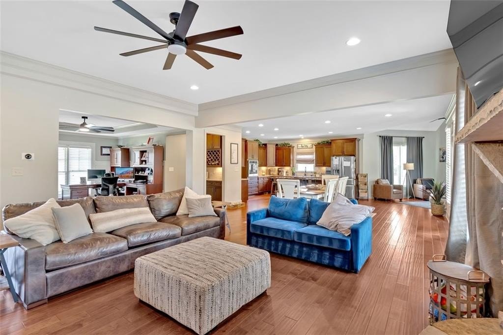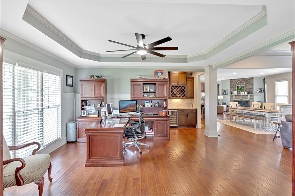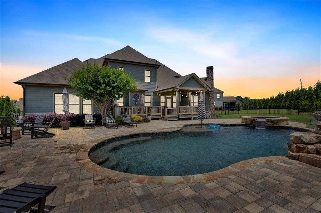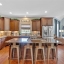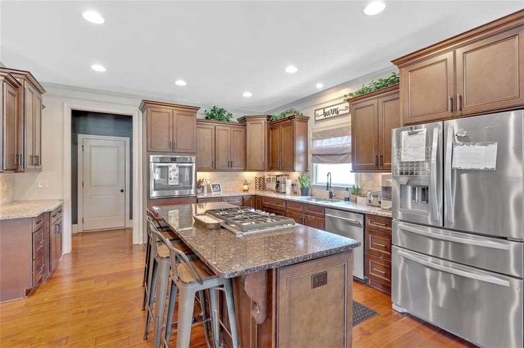 Inside, you’ll find nearly 4,000 square feet of refined living space with designer touches throughout. The dramatic main level boasts an open-concept layout with soaring ceilings, a chef’s kitchen featuring a gas cooktop, built-in oven, warming drawer, walk-in pantry, and wine fridge. Enjoy cozy evenings in the keeping room with wood-burning fireplace or unwind in the spacious living room with gas fireplace.