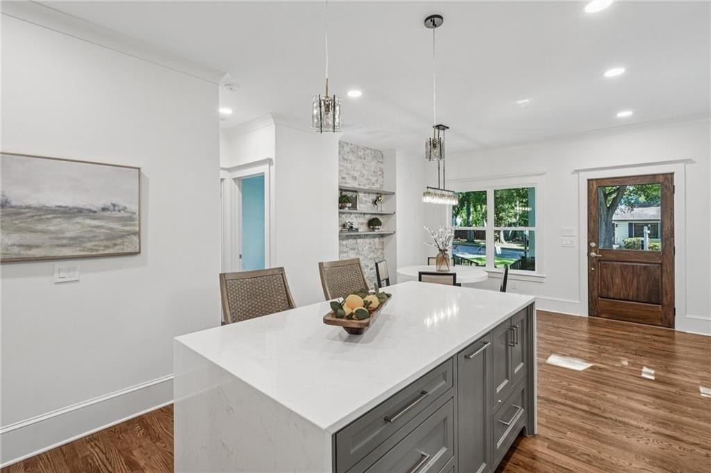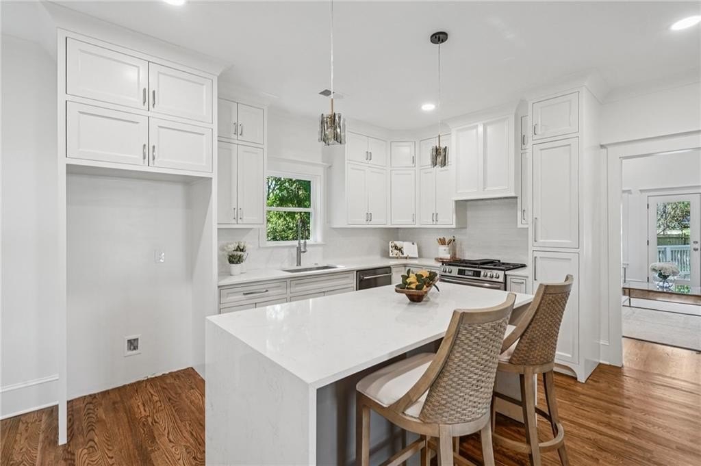 Step onto the expansive covered front porch and enter a light-filled interior featuring hardwood floors throughout. The gourmet kitchen boasts custom cabinets, a quartz waterfall island, and seamlessly flows into the family room with beamed ceilings and a built-in bar, ideal for entertaining.