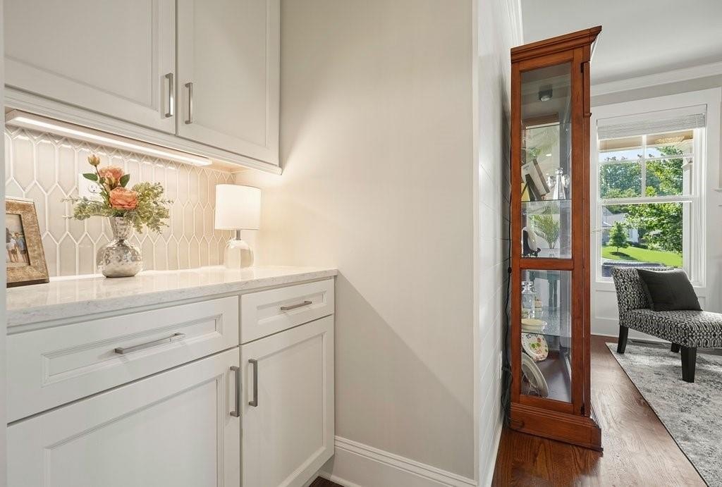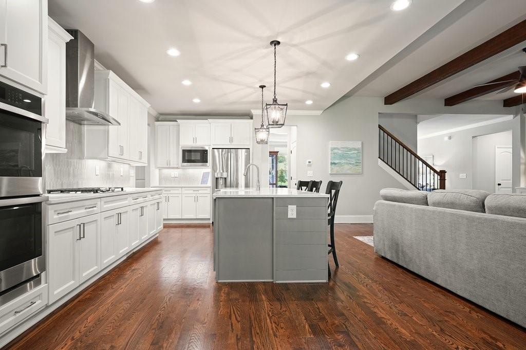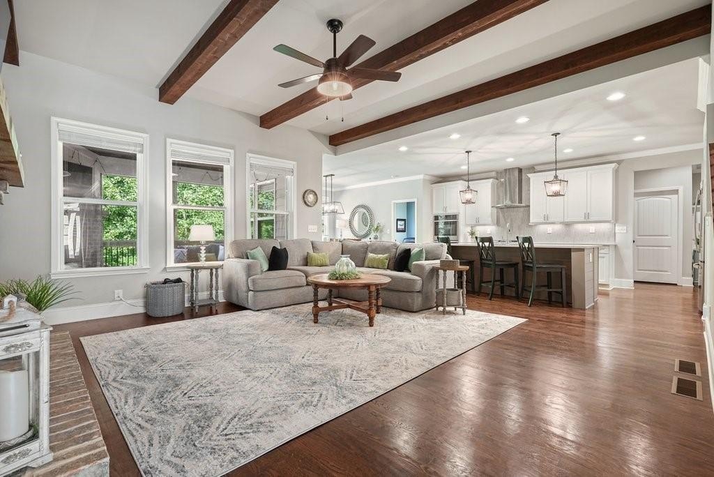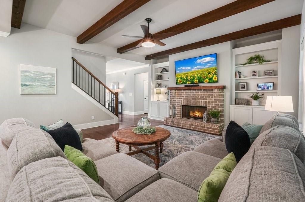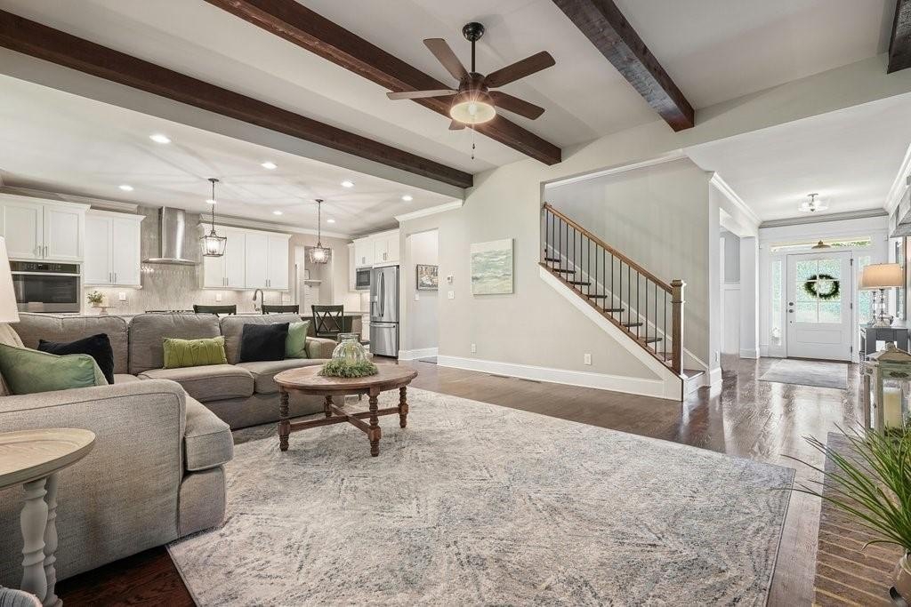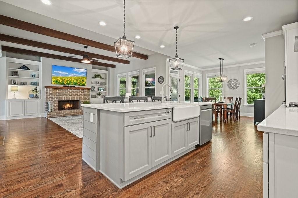 As you enter into the foyer you are welcomed to a sophisticated dining room or versatile sitting room with stunning hardwood floors. Then make your way into an open concept family room featuring a cozy brick gas lit fireplace, flanking custom built-ins. Along with rustic cedar ceiling beams. The open- concept kitchen is a chef's dream featuring gorgeous Quartz counters, double oven and gas cooktop. The large island with farmhouse sink, is an entertainers dream. A walk-in pantry cleverly hidden behind the kitchen. An elegant butler's pantry adds sophistication and ease for entertaining. A mudroom off the three-car garage with custom built-ins. An ample spaced laundry room, includes a convenient main-level laundry room with a sink. A powered room right off the kitchen is prefect for guest.