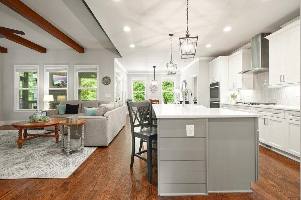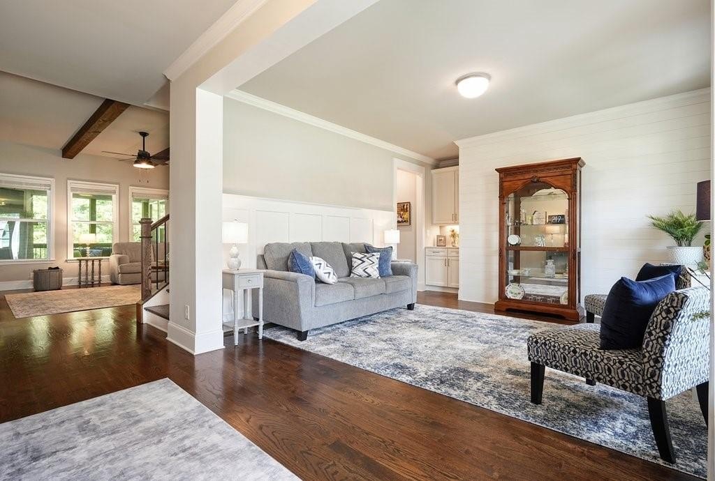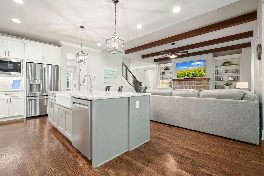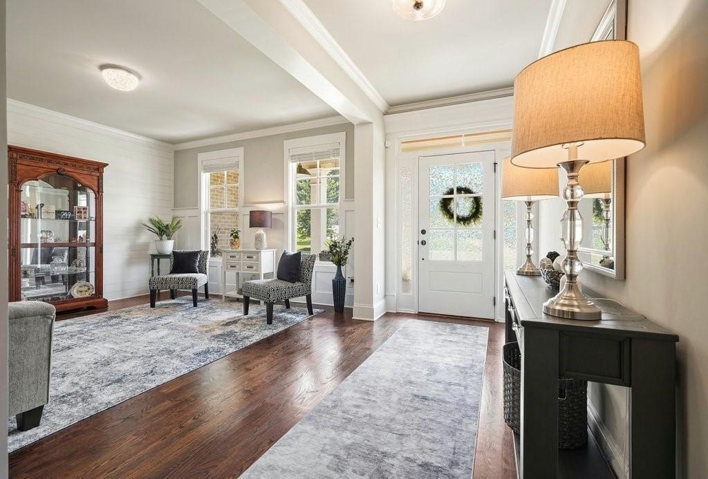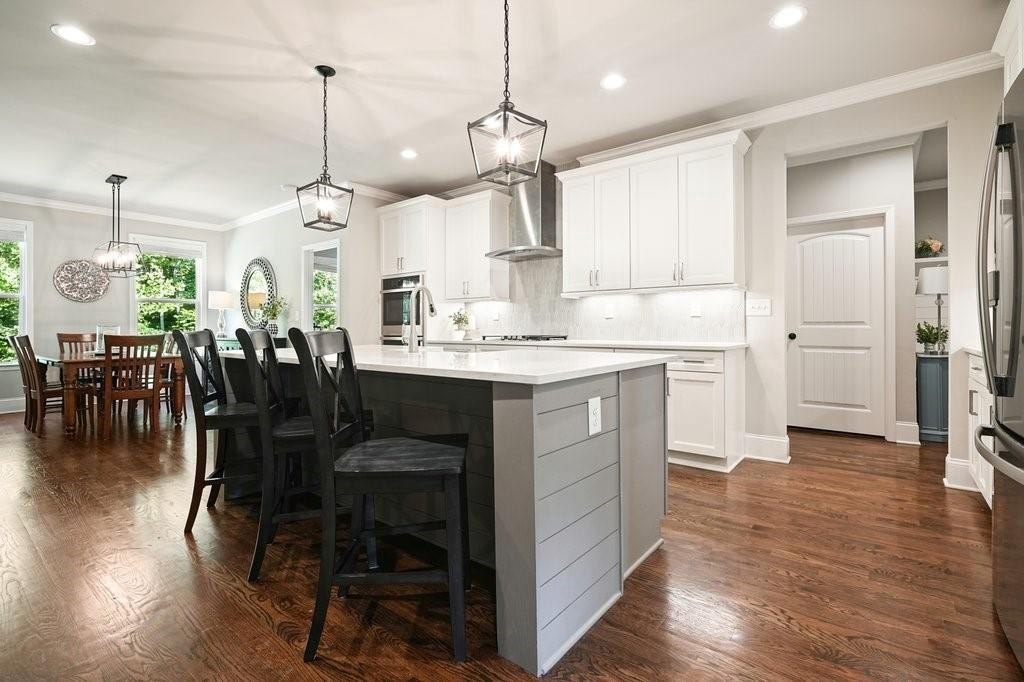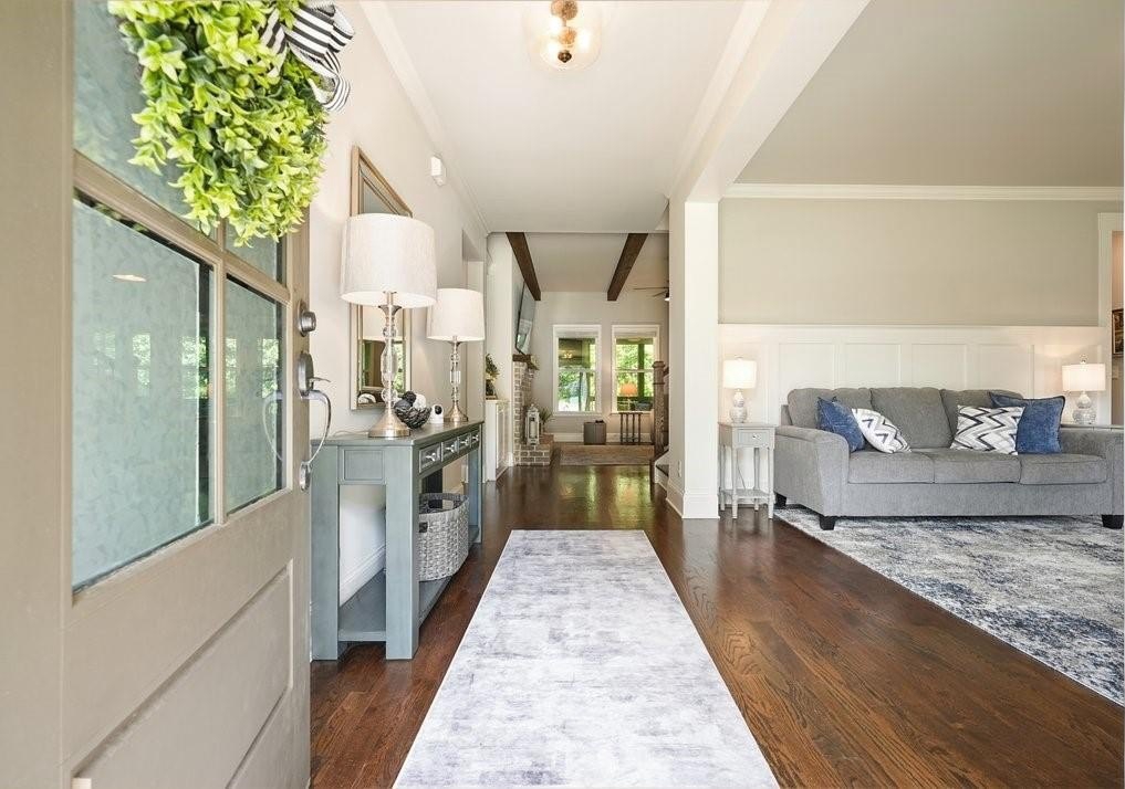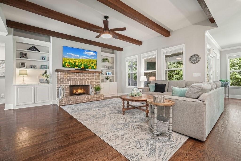As you enter into the foyer you are welcomed to a sophisticated dining room or versatile sitting room with stunning hardwood floors. Then make your way into an open concept family room featuring a cozy brick gas lit fireplace, flanking custom built-ins. Along with rustic cedar ceiling beams. The open- concept kitchen is a chef's dream featuring gorgeous Quartz counters, double oven and gas cooktop. The large island with farmhouse sink, is an entertainers dream. A walk-in pantry cleverly hidden behind the kitchen. An elegant butler's pantry adds sophistication and ease for entertaining. A mudroom off the three-car garage with custom built-ins. An ample spaced laundry room, includes a convenient main-level laundry room with a sink. A powered room right off the kitchen is prefect for guest.