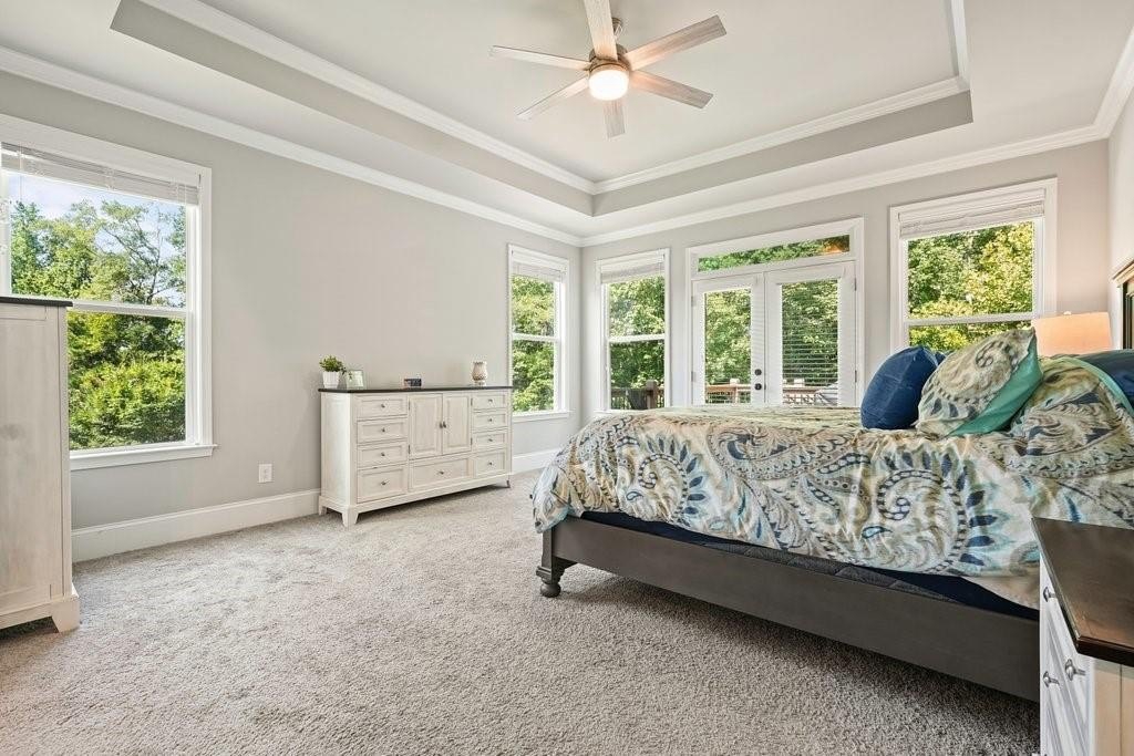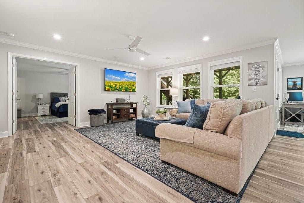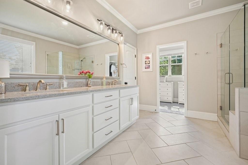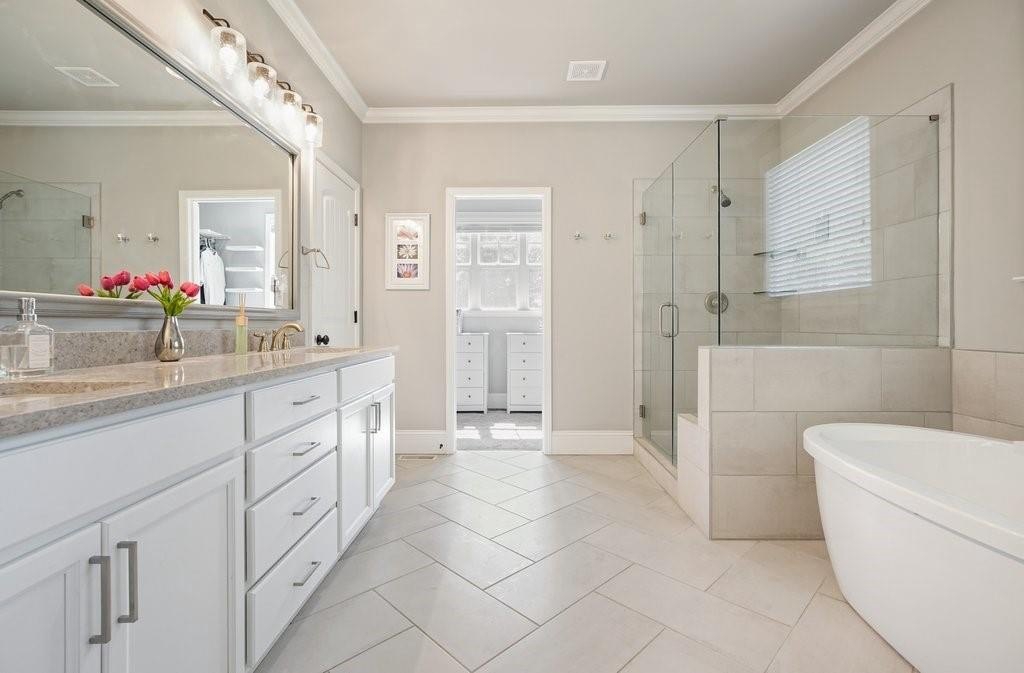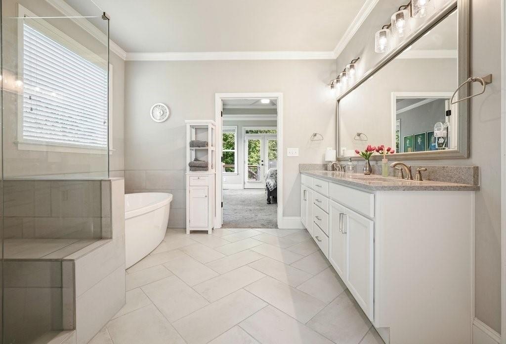 The airy, open layout showcases a lavish primary suite on the main level, complete with a serene bathroom featuring a frameless glass shower, freestanding tub, generous walk-in closet. Double French doors welcome you to enjoy your morning coffee and take in nature on the private deck.