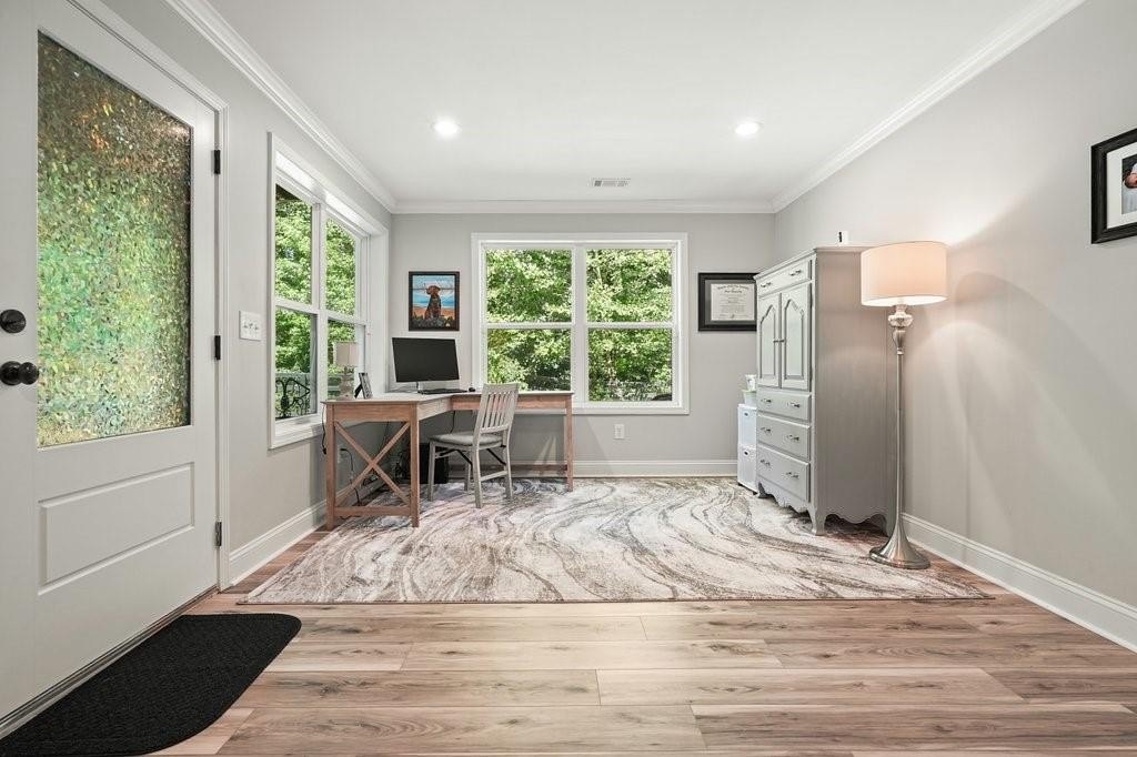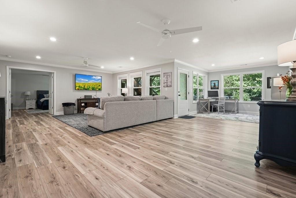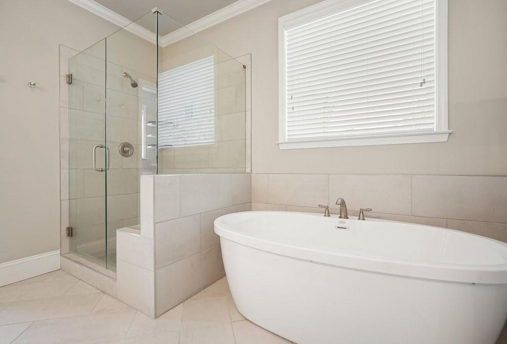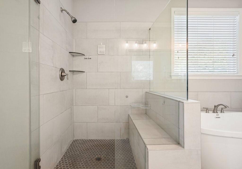 The airy, open layout showcases a lavish primary suite on the main level, complete with a serene bathroom featuring a frameless glass shower, freestanding tub, generous walk-in closet. Double French doors welcome you to enjoy your morning coffee and take in nature on the private deck.