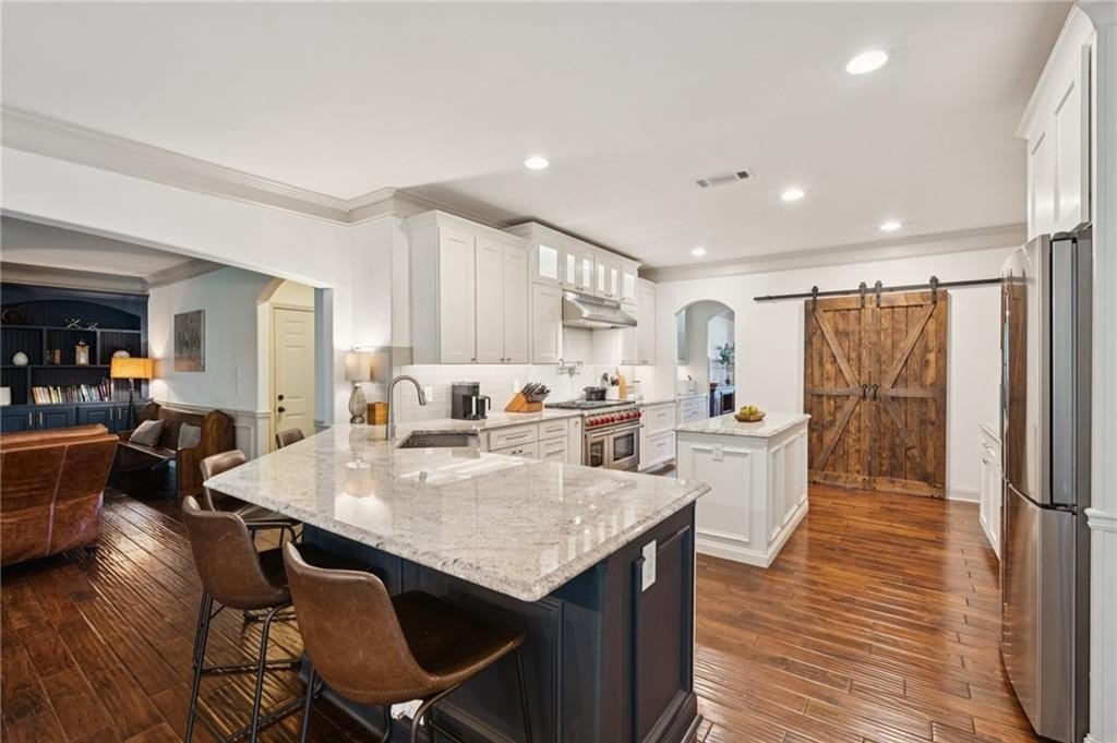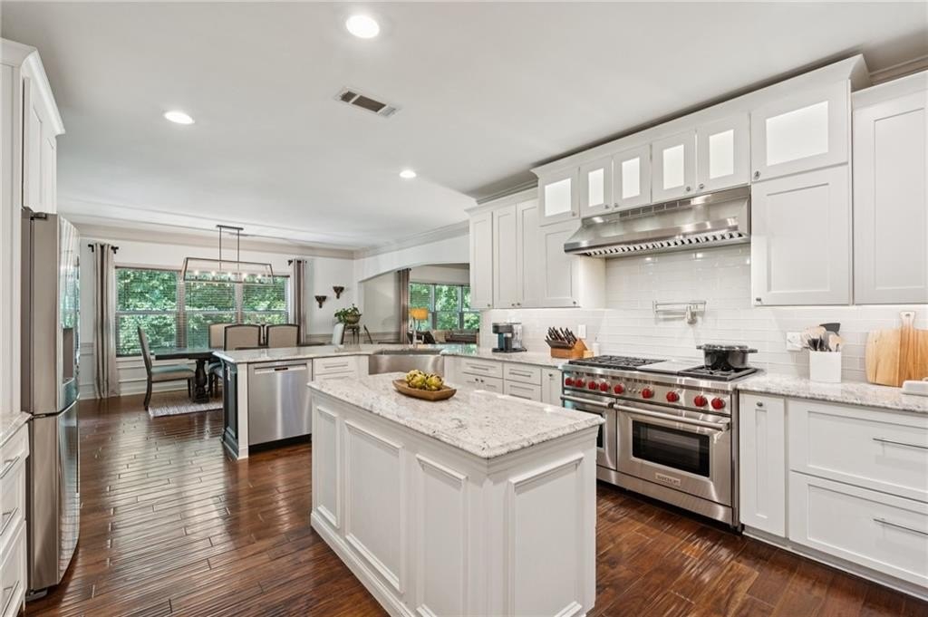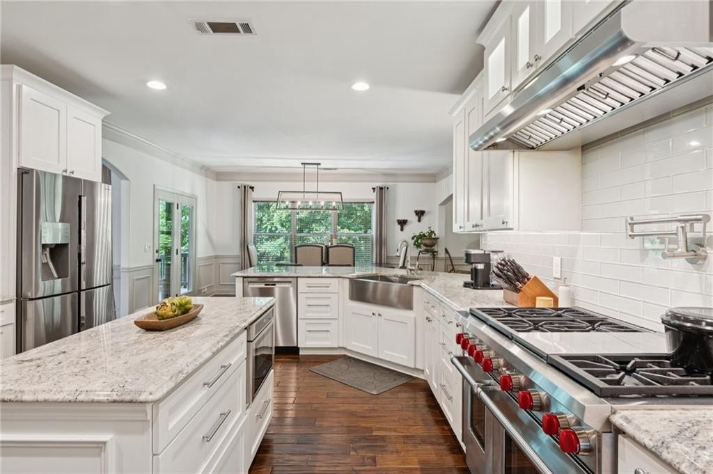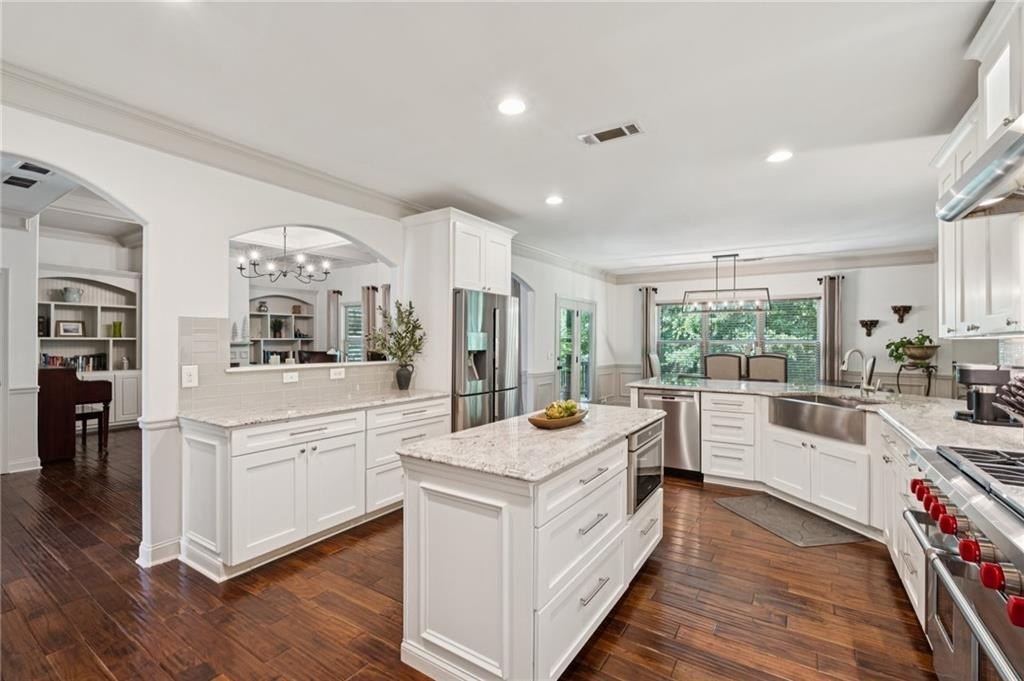 Step into the fully custom chef’s kitchen, a culinary showpiece featuring professional-grade appliances, custom cabinetry, an oversized island perfect for gatherings, and a walk-in pantry designed with both elegance and utility in mind. From intimate dinners to large-scale entertaining, this kitchen is both a statement and a sanctuary.