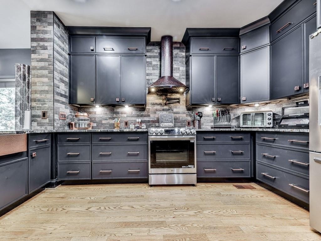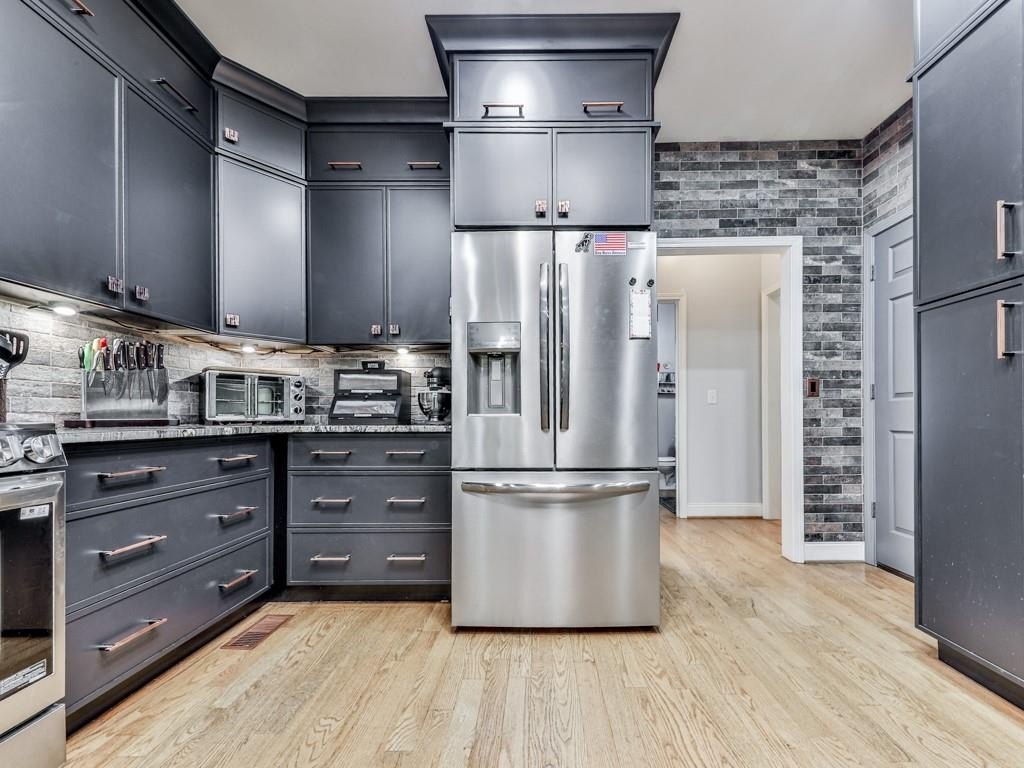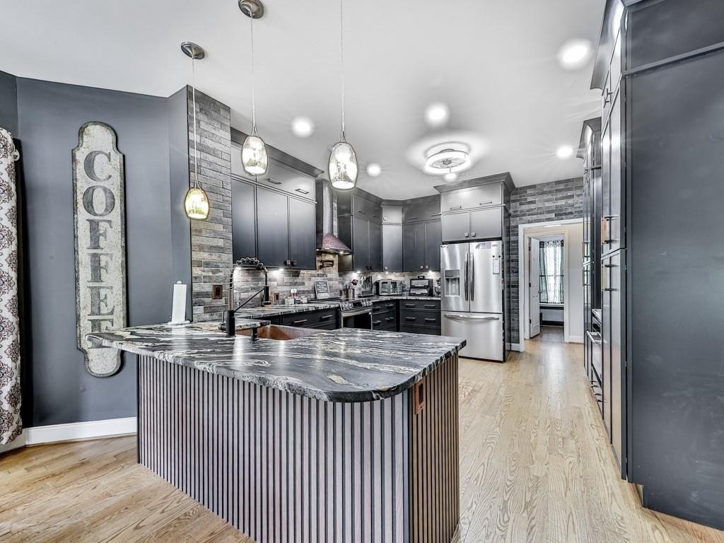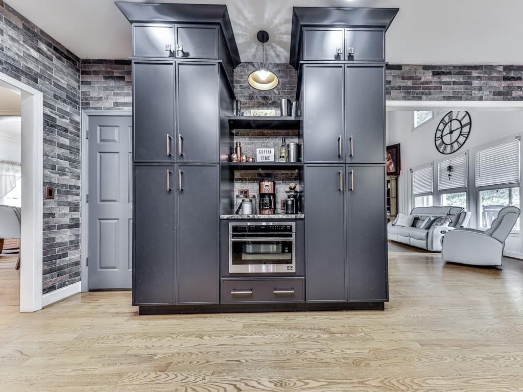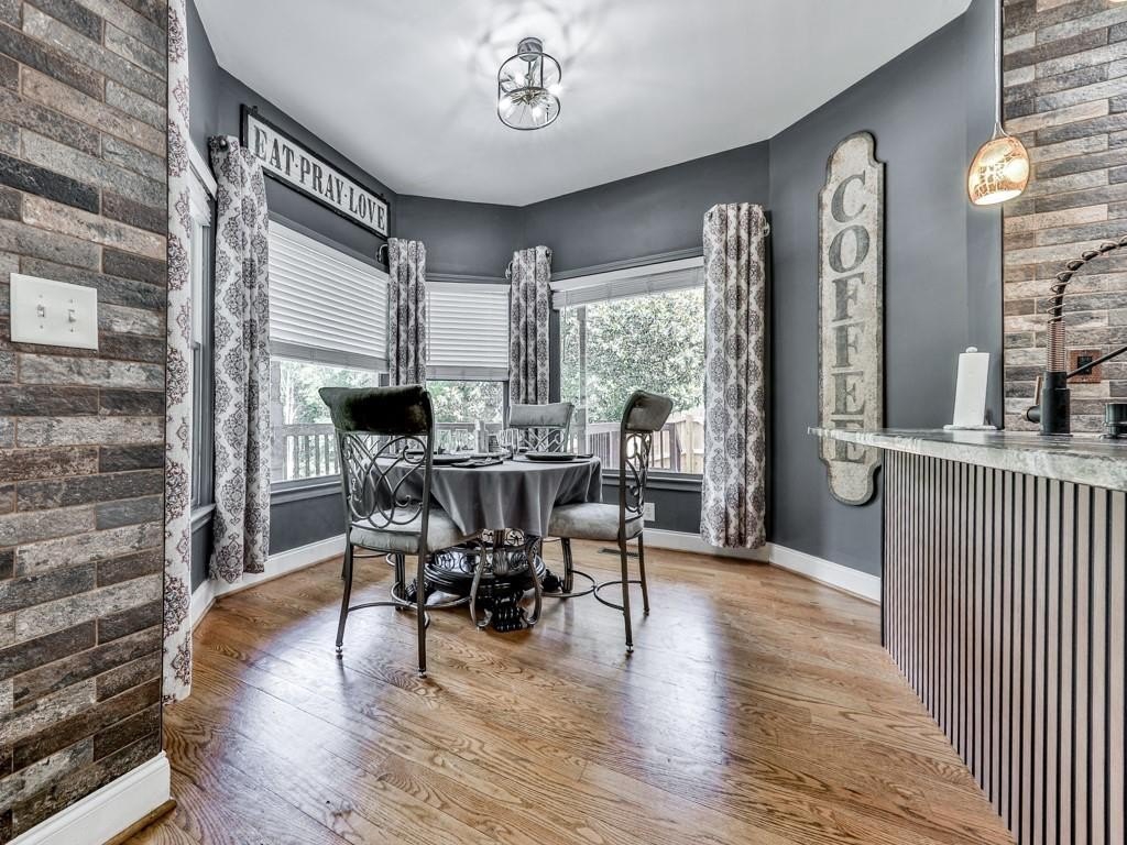 The grand two-story foyer leads you into a formal dining room, perfect for entertaining. The soaring two-story family room offers stunning views of your one-of-a-kind backyard oasis. The newly REMODELED kitchen is a true showstopper, featuring sleek black cabinets with gold accents, a farmhouse sink, breakfast bar, spacious eat-in area, and a charming coffee bar. Every detail in this kitchen is brand new, with plenty of storage to keep everything organized.