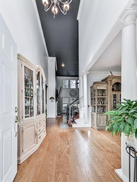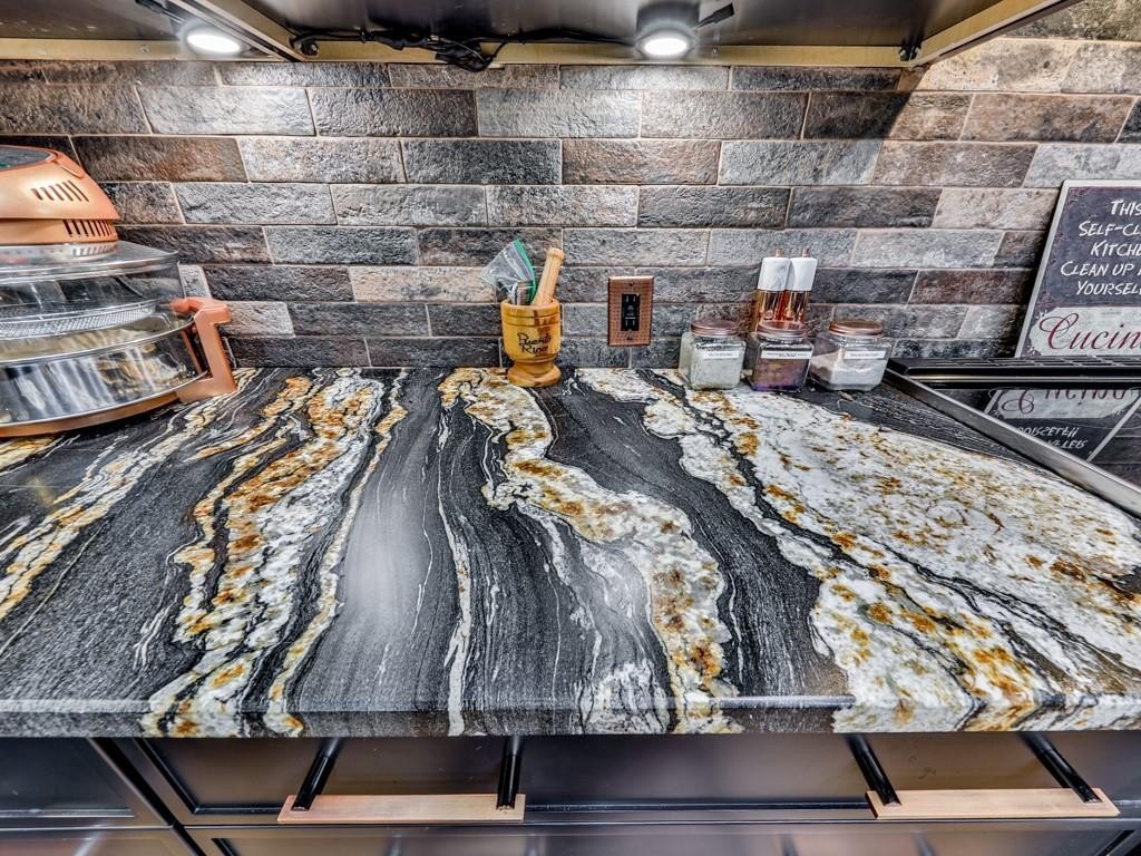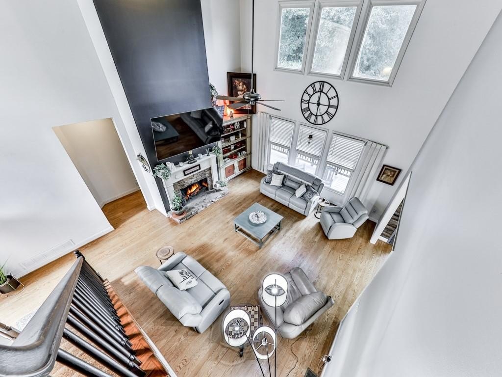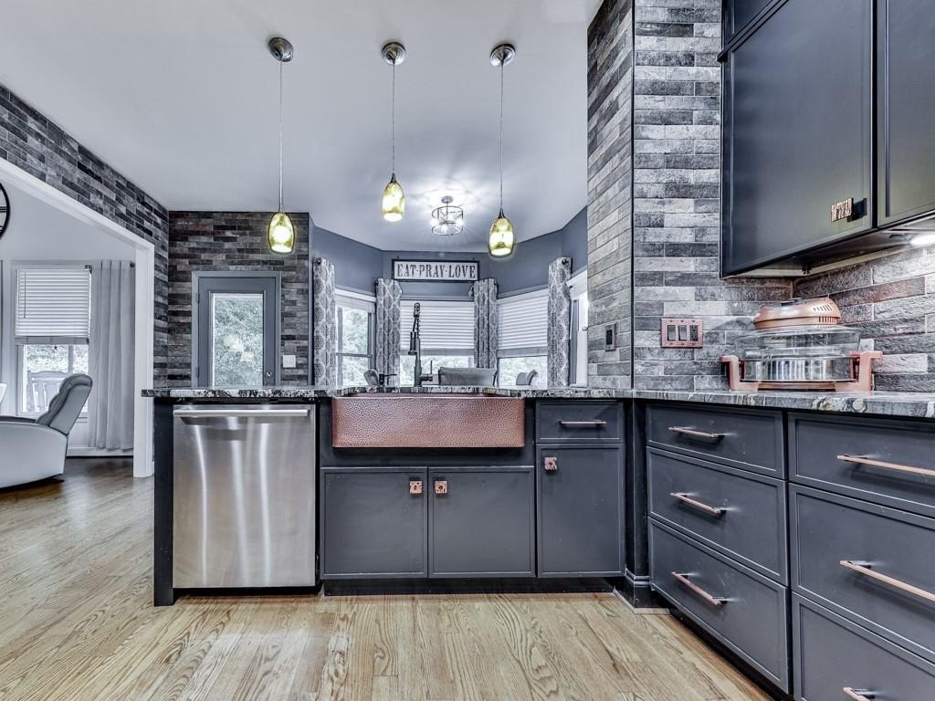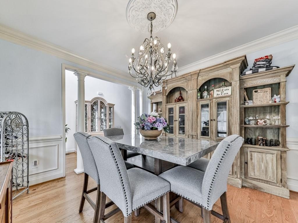 The grand two-story foyer leads you into a formal dining room, perfect for entertaining. The soaring two-story family room offers stunning views of your one-of-a-kind backyard oasis. The newly REMODELED kitchen is a true showstopper, featuring sleek black cabinets with gold accents, a farmhouse sink, breakfast bar, spacious eat-in area, and a charming coffee bar. Every detail in this kitchen is brand new, with plenty of storage to keep everything organized.