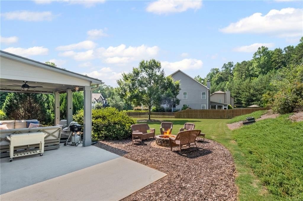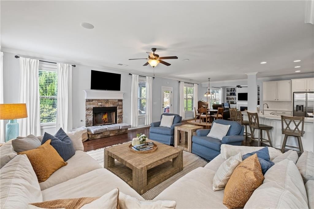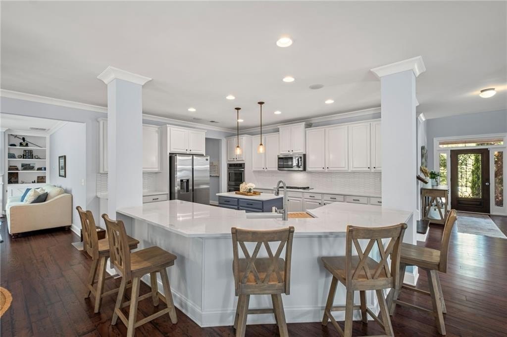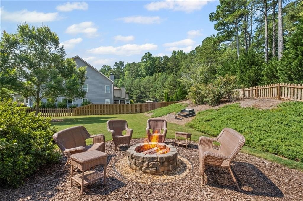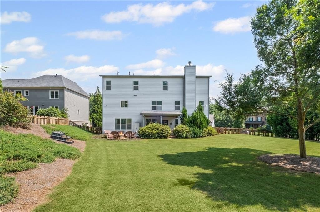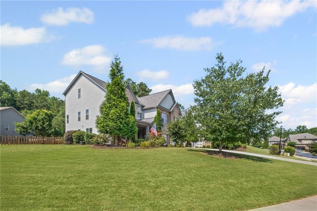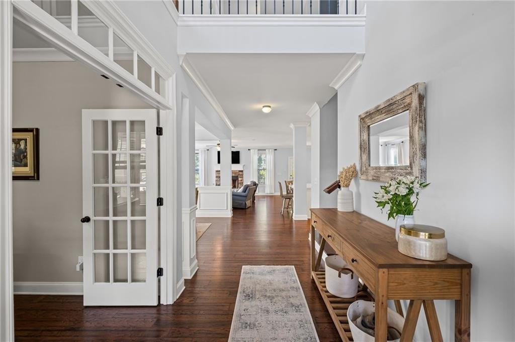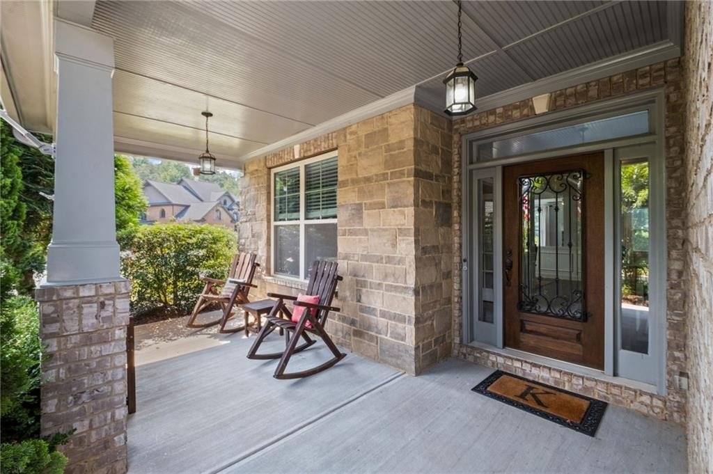 Welcome to this beautifully updated and impeccably maintained 6-bedroom, 5-bathroom home in Castille, an exclusive gated community of just 37 executive homes. Situated in a prime Alpharetta location with the benefit of top-rated Forsyth County schools and lower taxes, this home blends luxury, comfort, and convenience. The main level boasts an inviting open floor plan designed for both everyday living and entertaining. Step through the covered rocking chair front porch into a grand two-story foyer. Highlights include an executive home office, a formal dining room with coffered ceilings, a fireside family room, breakfast area, and a cozy fireside keeping room. The gourmet kitchen is a chef’s dream, featuring double ovens, stone countertops, stainless steel appliances, custom tile backsplash, two large islands, and ample workspace. A bedroom with a full bath and a mudroom completes the main floor. Upstairs, you'll find a charming reading nook with a custom window seat and built-in bookshelves, a large laundry room with cabinets and sink, four generously sized bedrooms and three full baths. The luxurious primary suite offers a private sitting area, two walk-in closets (including a custom-designed one), and a spa-like bath with a soaking tub, oversized tiled shower, and double vanity. The finished third level includes a full bath, flexible living space, a 6th bedroom, and the option for a 7th—perfect for a guest suite, media room, or home gym. Outdoor living is just as impressive, with covered front and back porches, an expanded patio, a fire pit, and a large, level fenced backyard—ideal for play or relaxation. Enjoy close proximity to Polo Fields, Vickery Village, Downtown Alpharetta, and GA 400—all while coming home to peaceful, private surroundings. With a brand-new roof and true move-in readiness, this home is the total package.