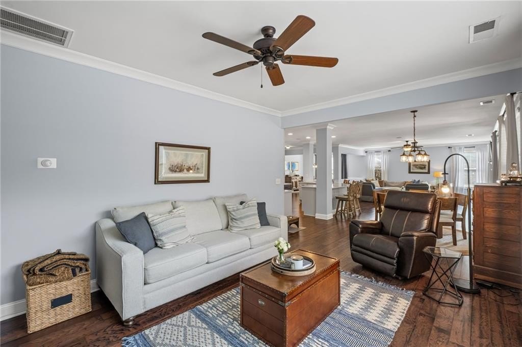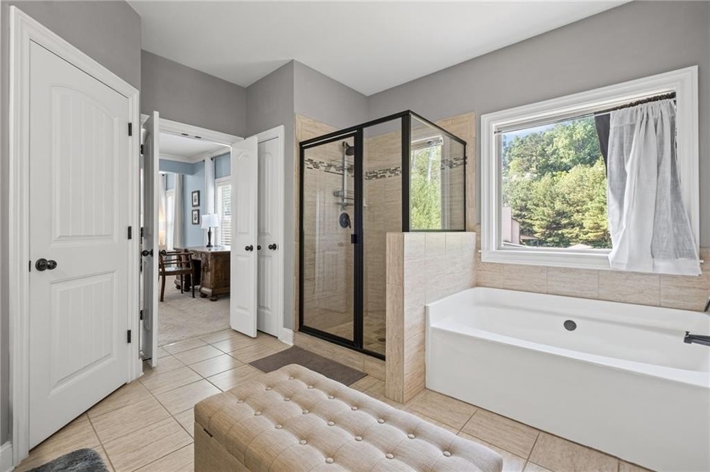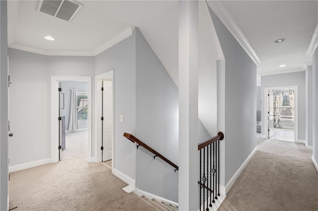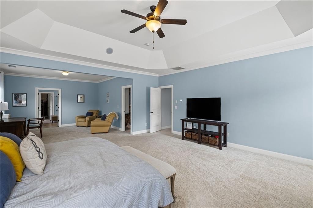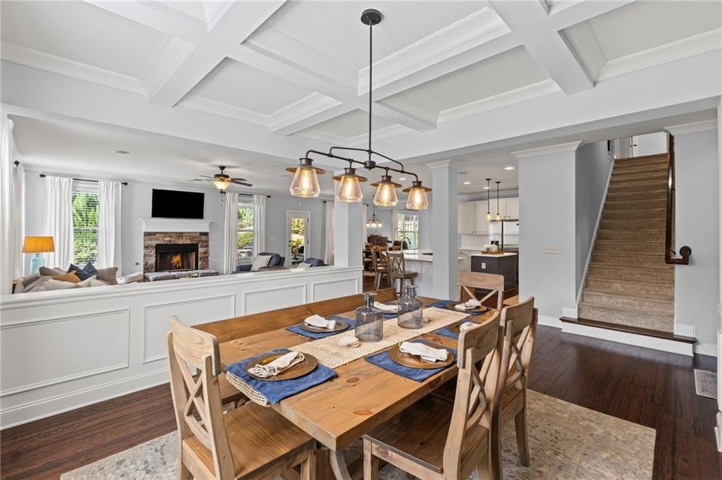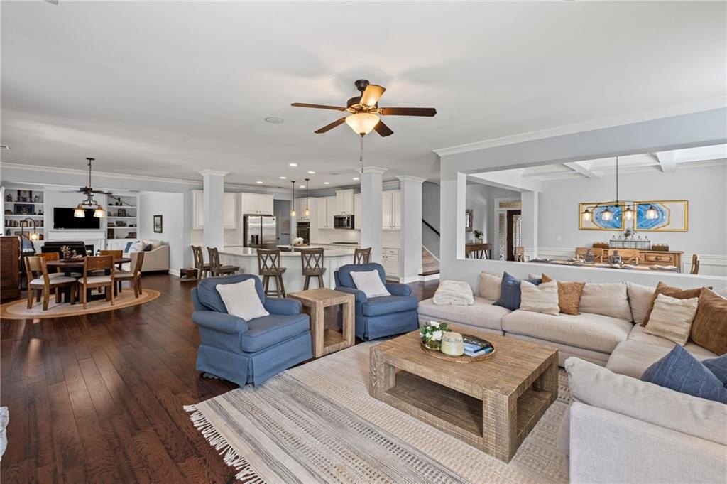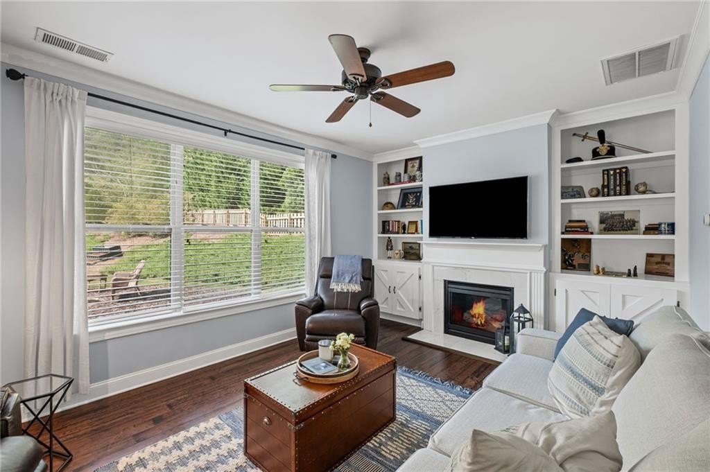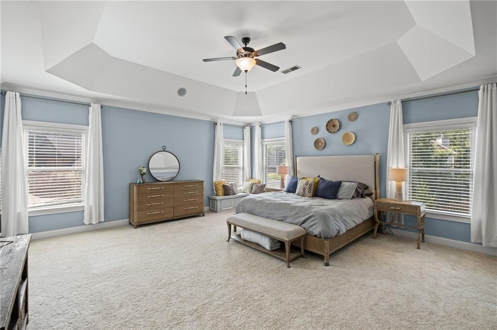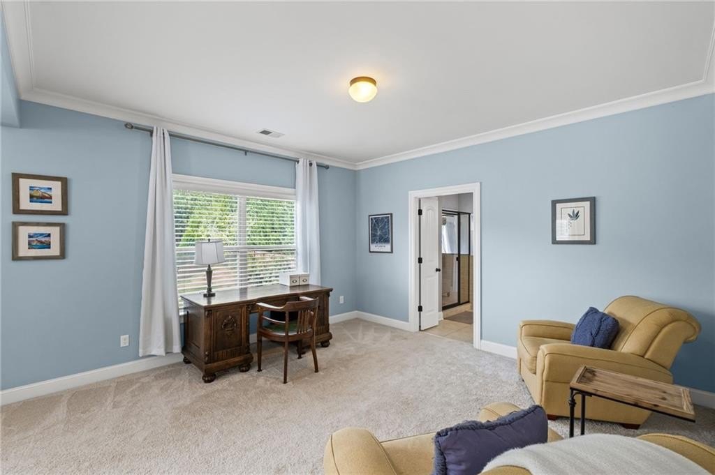 Welcome to this beautifully updated and impeccably maintained 6-bedroom, 5-bathroom home in Castille, an exclusive gated community of just 37 executive homes. Situated in a prime Alpharetta location with the benefit of top-rated Forsyth County schools and lower taxes, this home blends luxury, comfort, and convenience. The main level boasts an inviting open floor plan designed for both everyday living and entertaining. Step through the covered rocking chair front porch into a grand two-story foyer. Highlights include an executive home office, a formal dining room with coffered ceilings, a fireside family room, breakfast area, and a cozy fireside keeping room. The gourmet kitchen is a chef’s dream, featuring double ovens, stone countertops, stainless steel appliances, custom tile backsplash, two large islands, and ample workspace. A bedroom with a full bath and a mudroom completes the main floor. Upstairs, you'll find a charming reading nook with a custom window seat and built-in bookshelves, a large laundry room with cabinets and sink, four generously sized bedrooms and three full baths. The luxurious primary suite offers a private sitting area, two walk-in closets (including a custom-designed one), and a spa-like bath with a soaking tub, oversized tiled shower, and double vanity. The finished third level includes a full bath, flexible living space, a 6th bedroom, and the option for a 7th—perfect for a guest suite, media room, or home gym. Outdoor living is just as impressive, with covered front and back porches, an expanded patio, a fire pit, and a large, level fenced backyard—ideal for play or relaxation. Enjoy close proximity to Polo Fields, Vickery Village, Downtown Alpharetta, and GA 400—all while coming home to peaceful, private surroundings. With a brand-new roof and true move-in readiness, this home is the total package.