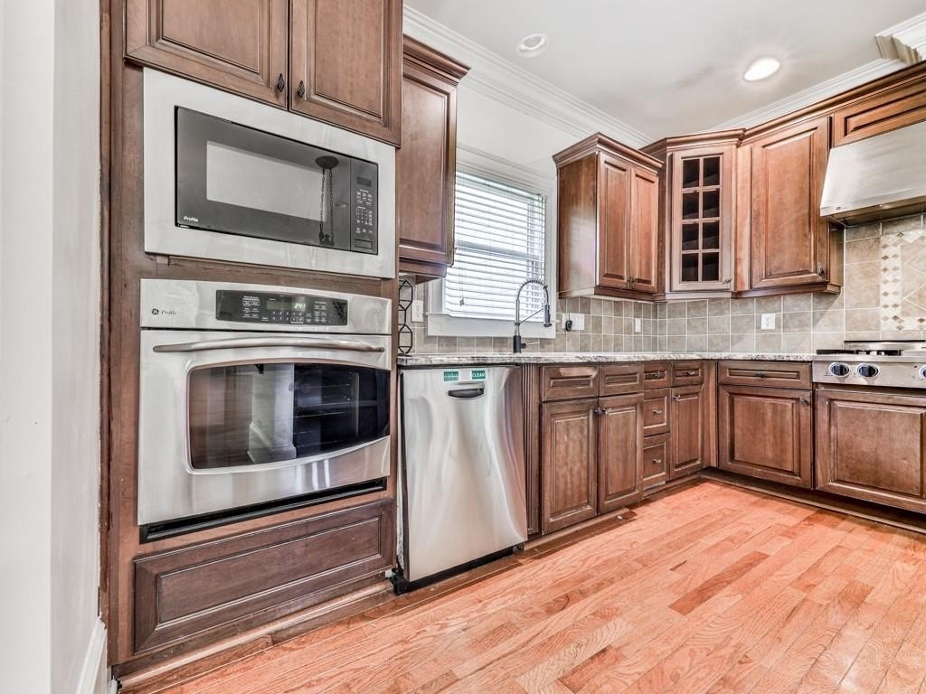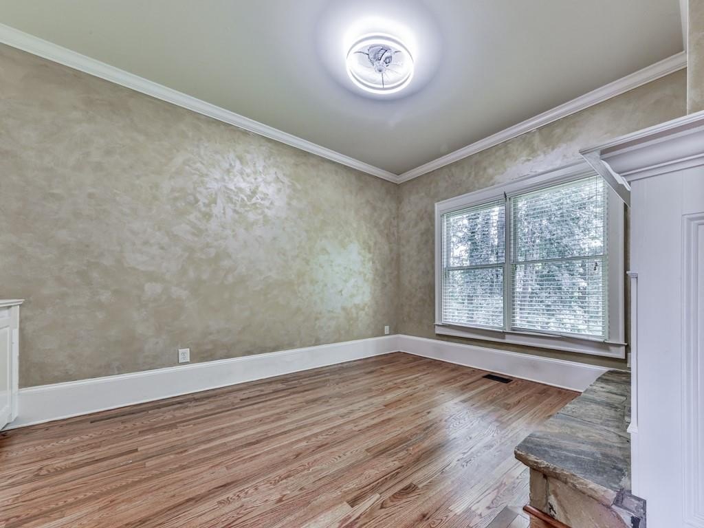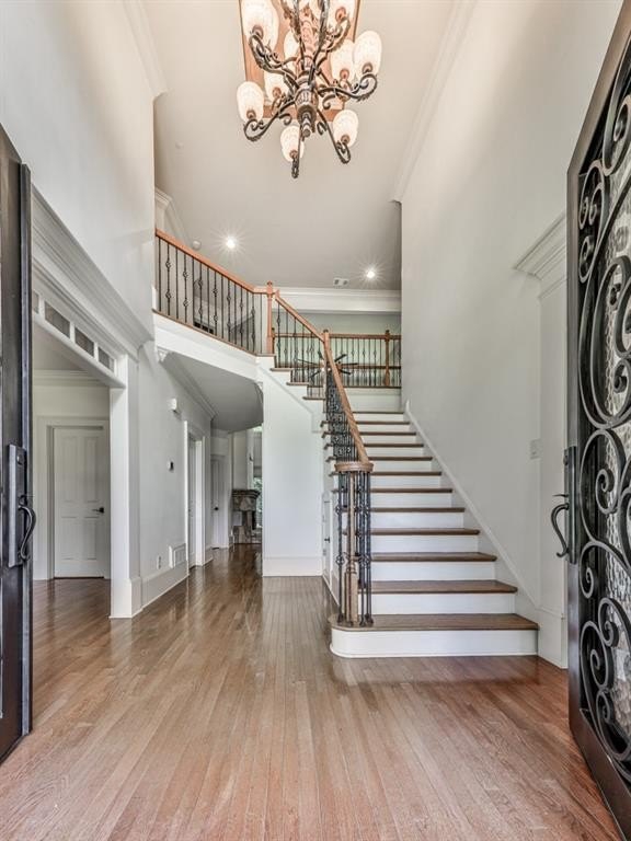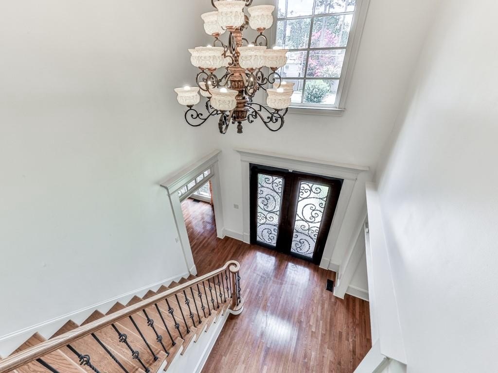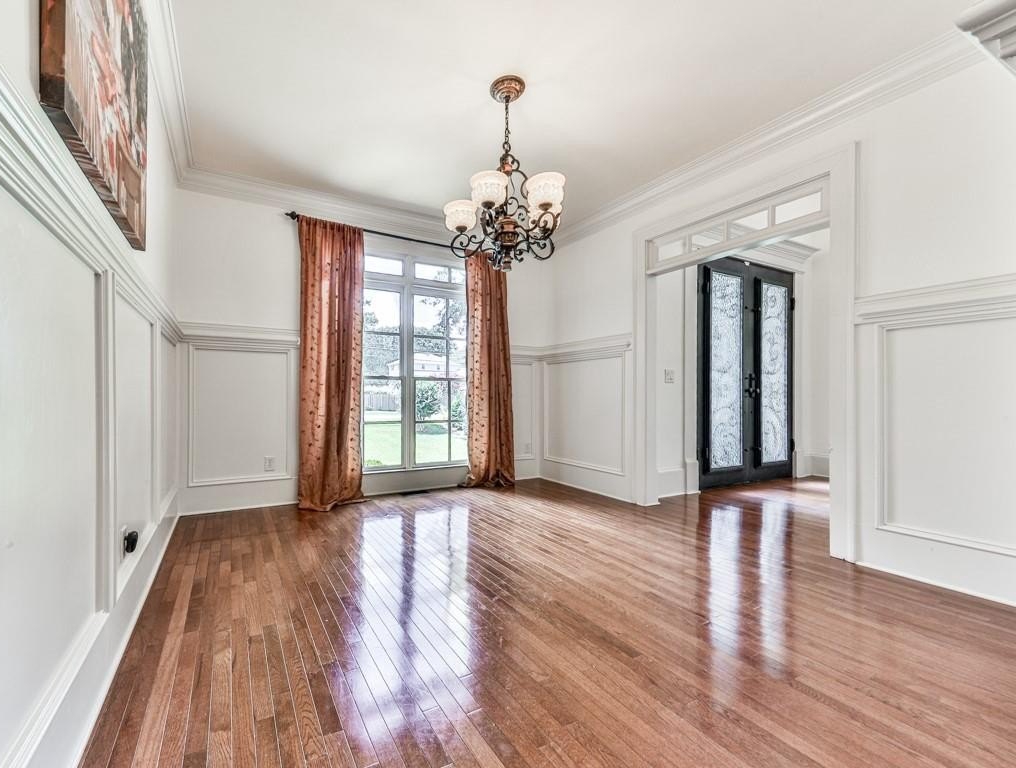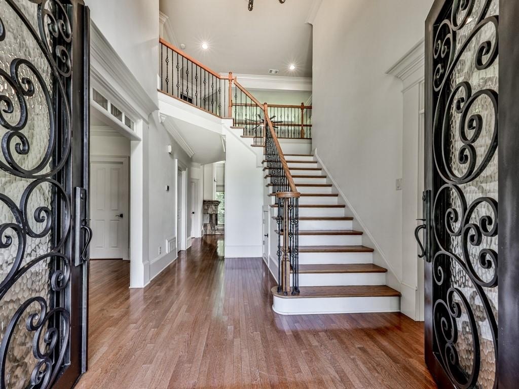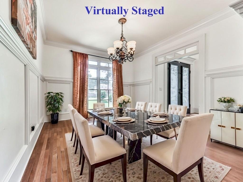 Stepping inside the Gothic-Looking, Ornamental Double-Steel & Glass Doors, you're greeted by a 2-Story Foyer with overhead chandelier, dual staircase leading to the upper level. and lovely 3/4 inch Solid Hardwood Floors which grace the ENTIRE Main and Upper Floors (save for Tiled Floors in the Bathrooms and Laundries). On your right is the spacious Dining Room with hallway access to the Kitchen, Sunny Windows overlooking the front lawn and Crown Molding finishes.