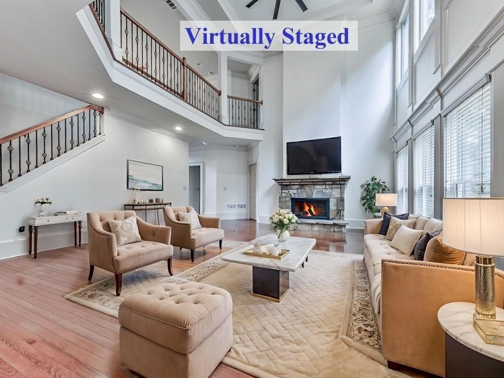 To the left of the Foyer is the 2nd Bedroom, which conveniently is located on the Main Level with direct Access to a Full Bathroom with Tub/Shower Combo, and access also to the hallway. This room would require an closet to be used as a Bedroom. Next is the MASSIVE Open-Plan Living Room with 2 Story-Ceiling, Huge Daylight Windows, Double-Sided Fireplace, French Doors to the Deck, and View to the Kitchen. The Kitchen features Stainless Steel Appliances with Wall-Oven and Microwave Oven, 5-Burner Gas Cook-Top, Granite Counters, Decorative Tiled Back-Splash, Oven Hood, Double-Door And Bottom-Draw Freezer/Fridge with Ice-Maker, Cherry-Colored Cabinets and Large Kitchen Island. Leading off from the Kitchen is the Main Laundry Room with Brand New Laundry Sink. There is also a spacious Walk-In Pantry Closet and 3-stepped access to the 3-Car Garage. Completing the Main Level is a Spacious 12' x 20' Deck overlooking the spacious, lawn backyard, as well as a Cozy Study featuring built-In Bookcases and the 2-Sided Fireplace.