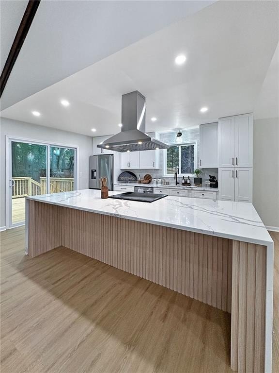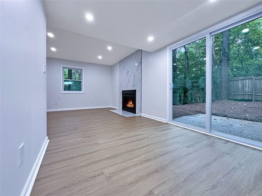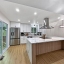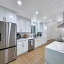 The spacious chef’s kitchen is a showstopper, featuring brand new solid wood shaker cabinets, quartz countertops, antique brass hardware, an oversized waterfall island with a floating hood vent and island cooktop, built-in microwave, and a suite of brand new Samsung stainless steel appliances. A tile fireplace adds warmth and elegance to the open living area, while three brand new sliding glass doors lead to beautifully built back decks and a private, professionally landscaped backyard surrounded by a new privacy fence.