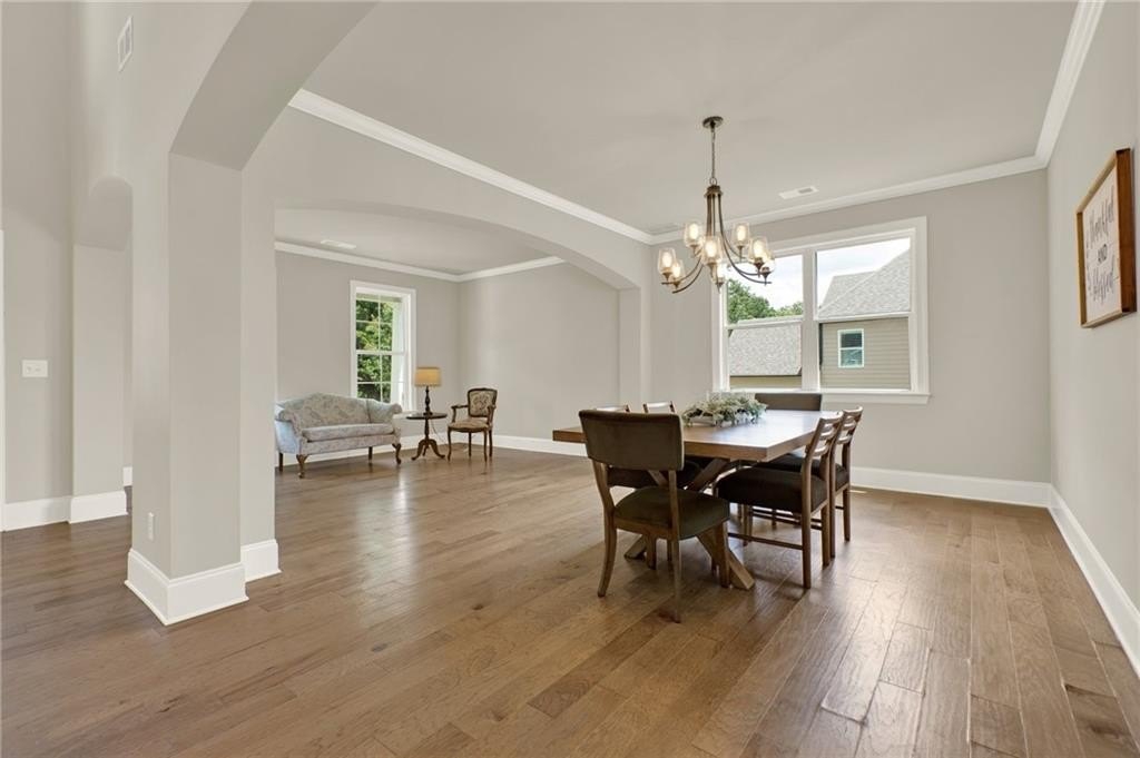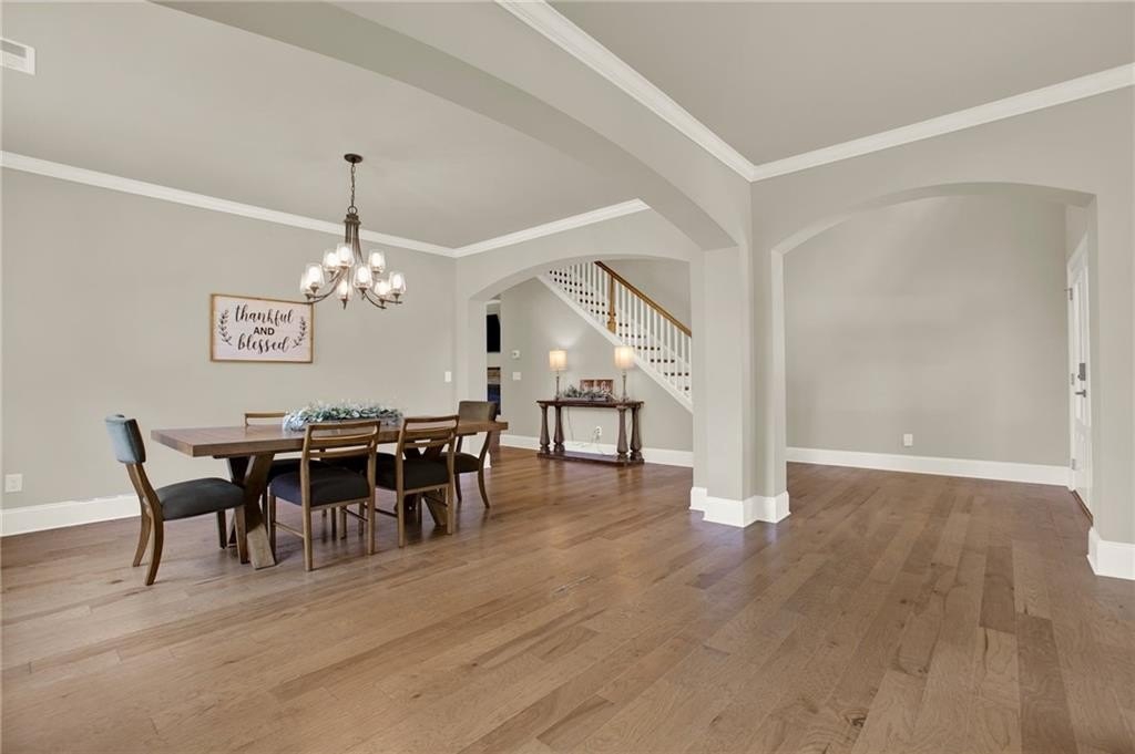 Step into the open foyer—offset to the formal dining room—and enjoy spacious living areas with hardwood floors, crown molding, and bay windows that fill the home with natural light. The formal dining room is set apart from the main living areas, creating a more defined and traditional entertaining space.