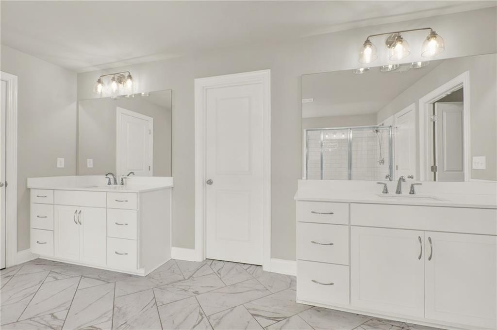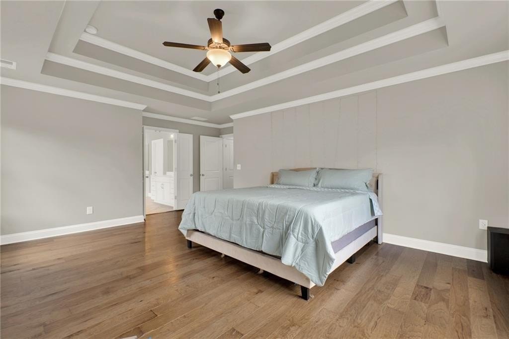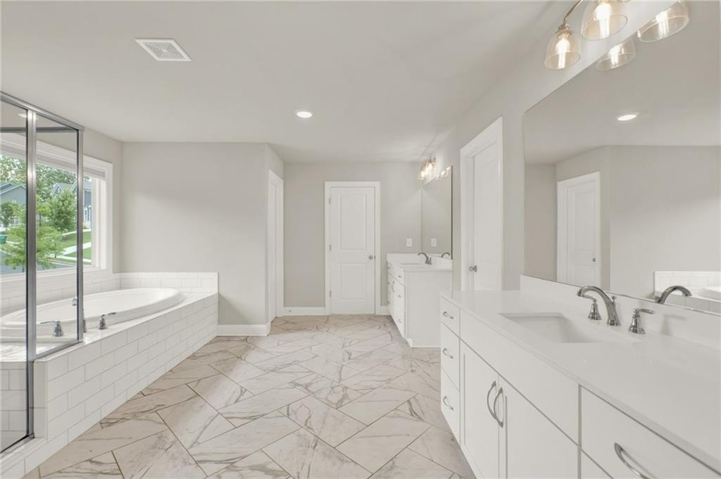 A bedroom with a full bath on the main level is perfect for guests or multi-generational living. Upstairs, a spacious bonus room adds flexibility, while a Jack and Jill bathroom with a double vanity connects two secondary bedrooms. The primary suite is a luxurious retreat with double tray ceilings and a spa-like en suite featuring a soaking tub, oversized tiled shower, double vanities, and enormous his-and-hers walk-in closets.
