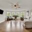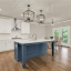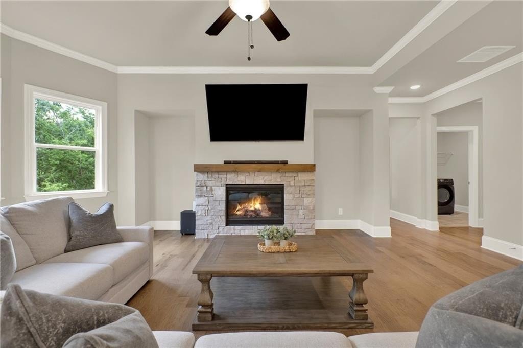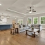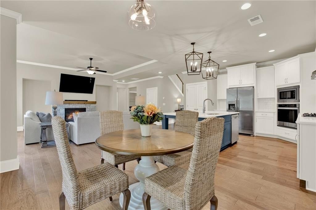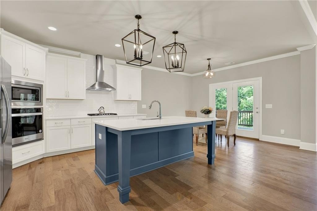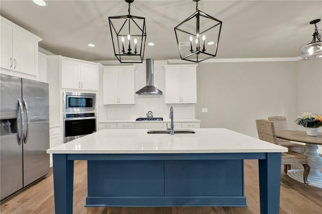 The white-on-white kitchen features quartz countertops, stainless steel appliances, and a large island, all opening to the bright and inviting living room and breakfast area.