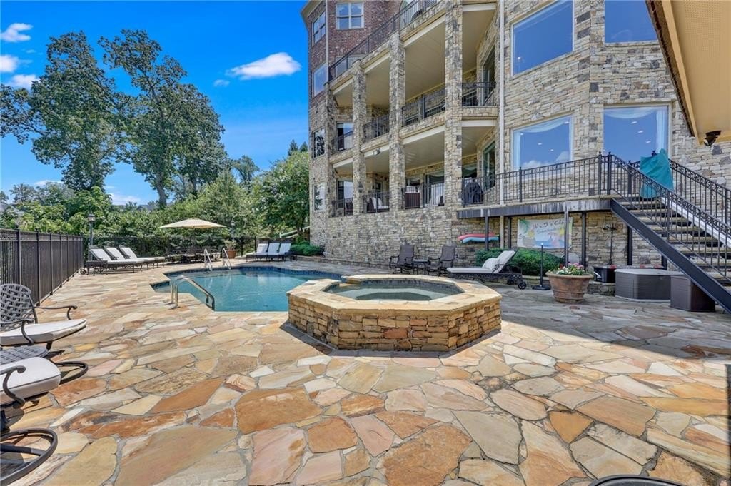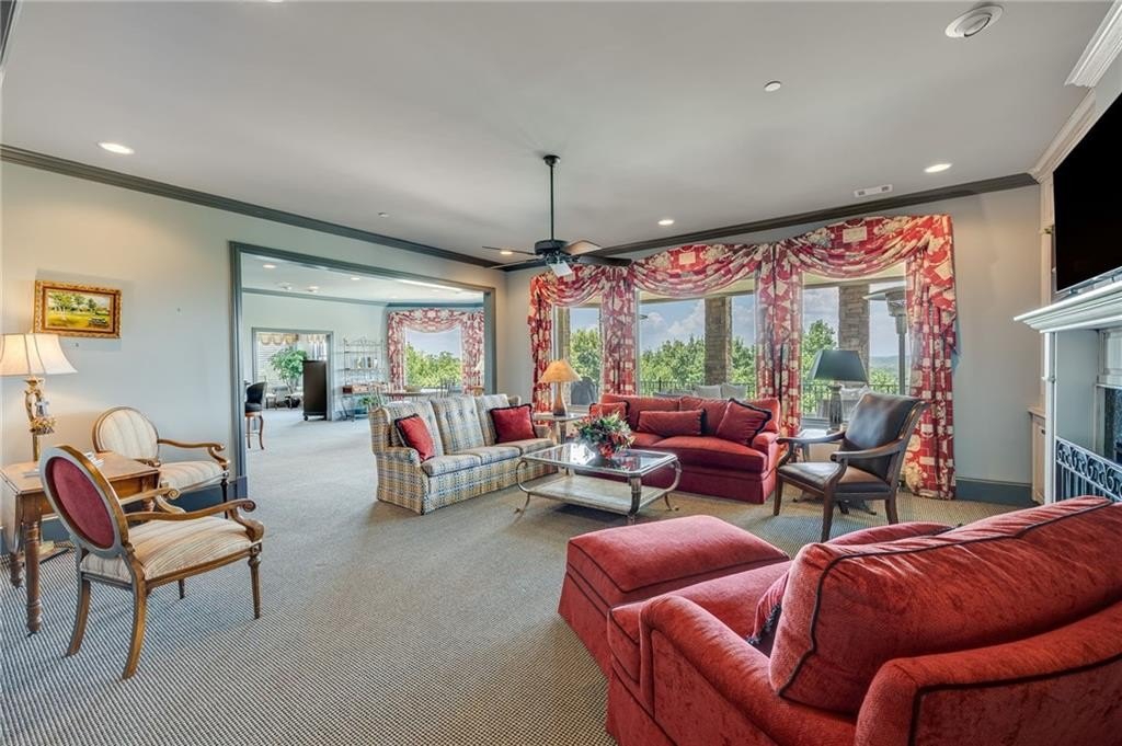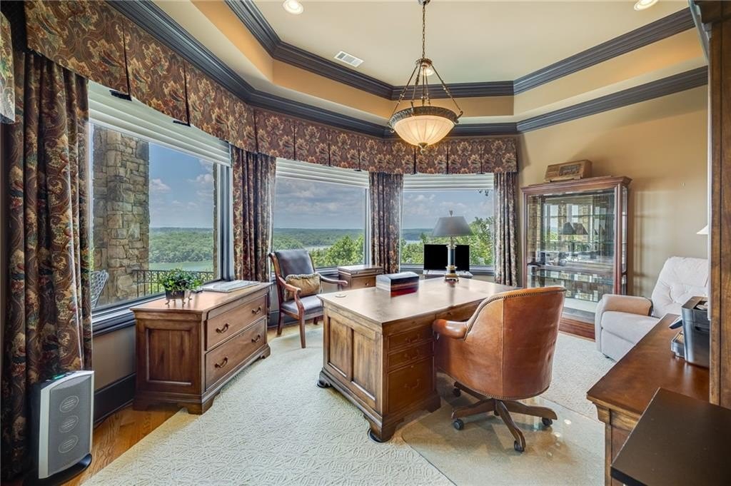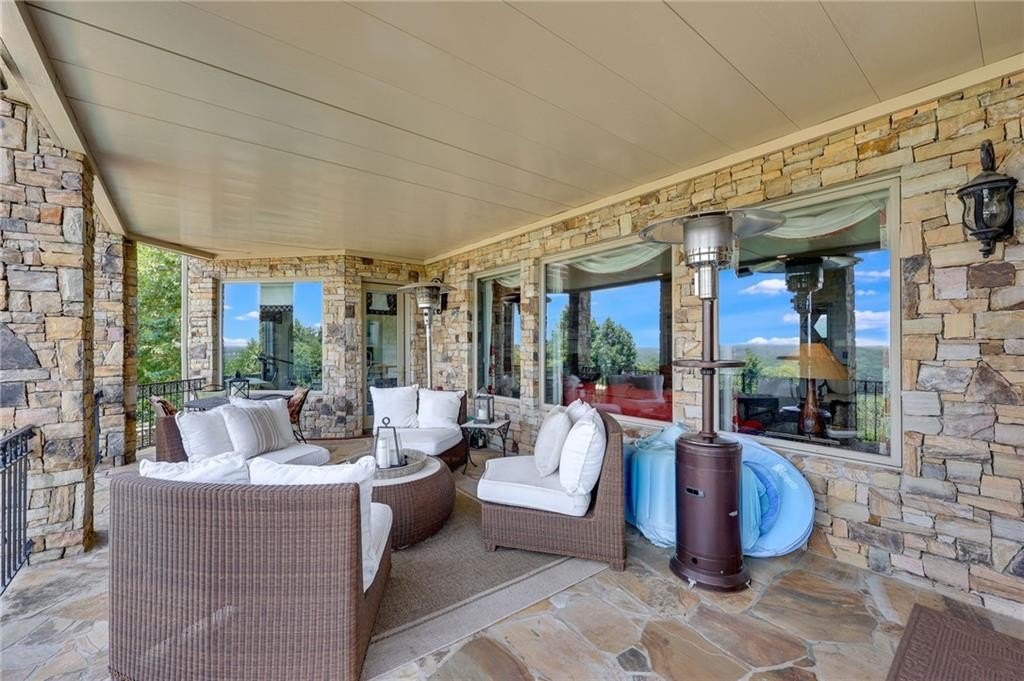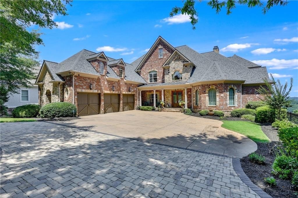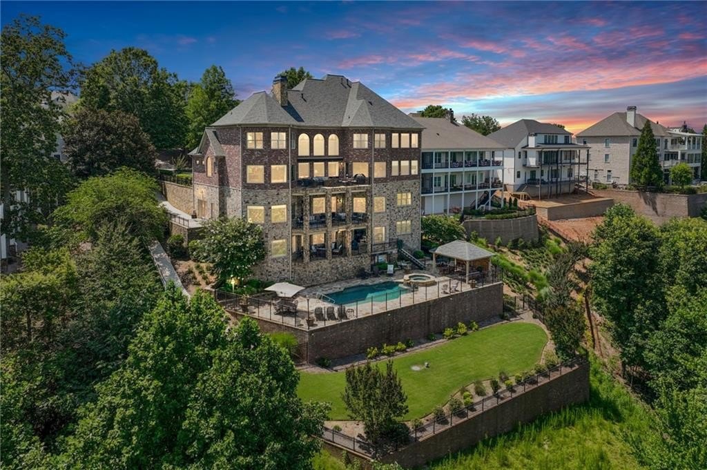 Harbour Point Yacht Club and Marina! A rare opportunity to own a truly exceptional Lake Lanier estate, offered fully furnished with elegant, high-end pieces and ideally positioned on one of the most desirable lots on the lake. Located within the prestigious, gated Harbour Point Yacht Club and Marina community, this custom-built home showcases sweeping sunset views over Lake Lanier and the Blue Ridge Mountains from three expansive verandas. Designed with both luxury and lifestyle in mind, this four-level estate features an elevator, two home offices, and a heated pool and spa. A deeded boat slip is included, offering seamless access to lakefront living. The main level welcomes you with a grand two-story foyer and living room, formal study, and refined dining room. A brand-new custom chef's kitchen is outfitted with a 60" Wolf range with double ovens, Sub-Zero refrigerator, Miele coffee station, and an oversized walk-in pantry. The cozy keeping room features a stone fireplace, and the spacious primary suite includes a spa-like bath and newly designed California Closets. The terrace level is an entertainer's dream, complete with a wine cellar and tasting room, full kitchen and bar, gathering room with fireplace, 10-seat home theater, steam shower, sauna, and private guest suite. The lower poolside level adds even more space for entertaining with a second full kitchen, additional ensuite, gathering room, game room, and fitness room-all opening to the pool and landscaped, fenced backyard. Additional features include a three-car garage plus a dedicated Harley garage, a newly resurfaced pool with cabana, and numerous recent upgrades including a Crestron Smart Home system, updated irrigation, fire sprinkler and security systems, and tankless hot water.