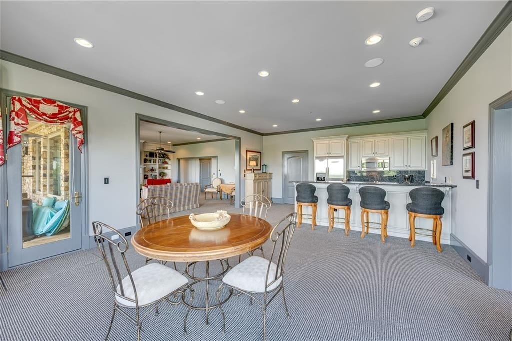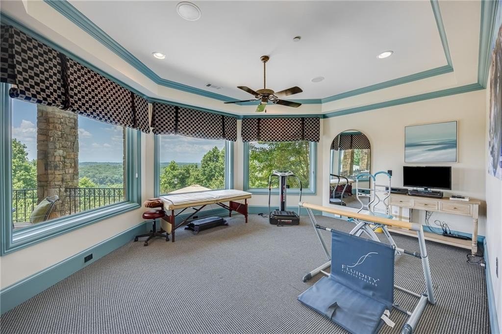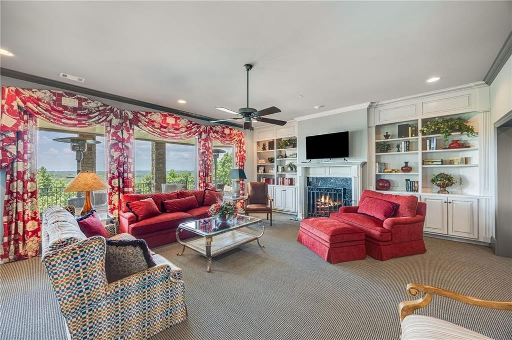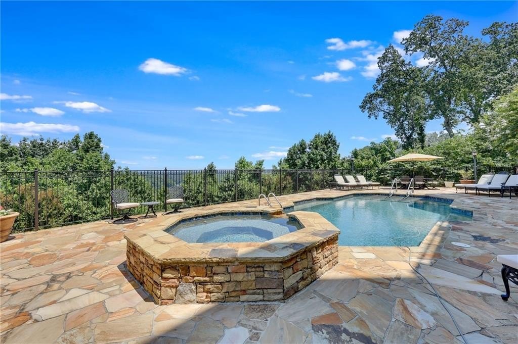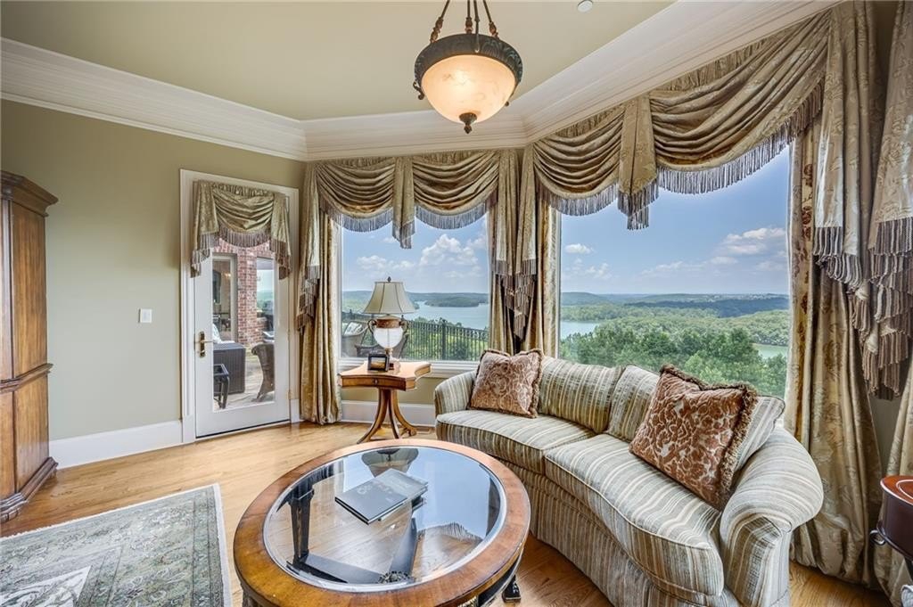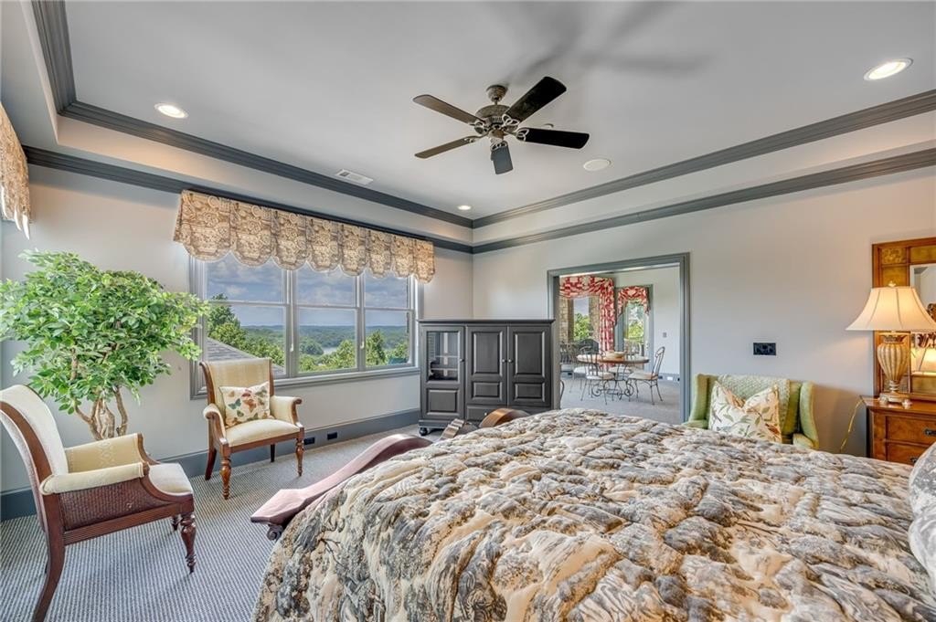 Harbour Point Yacht Club and Marina! A rare opportunity to own a truly exceptional Lake Lanier estate, offered fully furnished with elegant, high-end pieces and ideally positioned on one of the most desirable lots on the lake. Located within the prestigious, gated Harbour Point Yacht Club and Marina community, this custom-built home showcases sweeping sunset views over Lake Lanier and the Blue Ridge Mountains from three expansive verandas. Designed with both luxury and lifestyle in mind, this four-level estate features an elevator, two home offices, and a heated pool and spa. A deeded boat slip is included, offering seamless access to lakefront living. The main level welcomes you with a grand two-story foyer and living room, formal study, and refined dining room. A brand-new custom chef's kitchen is outfitted with a 60" Wolf range with double ovens, Sub-Zero refrigerator, Miele coffee station, and an oversized walk-in pantry. The cozy keeping room features a stone fireplace, and the spacious primary suite includes a spa-like bath and newly designed California Closets. The terrace level is an entertainer's dream, complete with a wine cellar and tasting room, full kitchen and bar, gathering room with fireplace, 10-seat home theater, steam shower, sauna, and private guest suite. The lower poolside level adds even more space for entertaining with a second full kitchen, additional ensuite, gathering room, game room, and fitness room-all opening to the pool and landscaped, fenced backyard. Additional features include a three-car garage plus a dedicated Harley garage, a newly resurfaced pool with cabana, and numerous recent upgrades including a Crestron Smart Home system, updated irrigation, fire sprinkler and security systems, and tankless hot water.