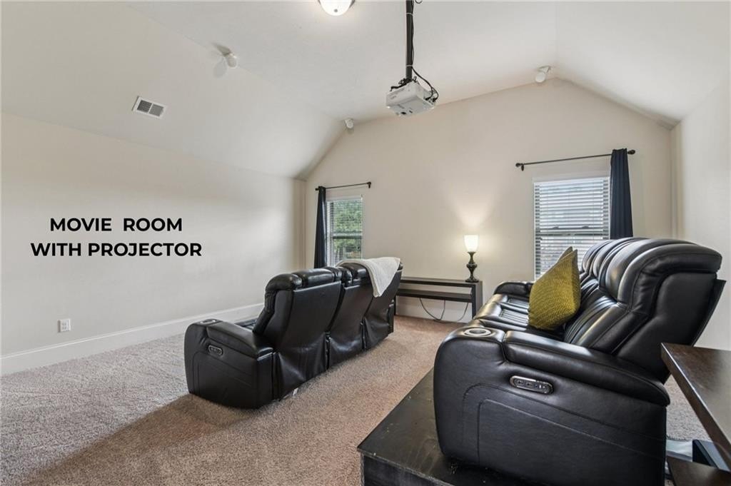 A guest bedroom and full bath on the main level provide added flexibility. Upstairs, the oversized primary suite features vaulted ceilings, a large walk-in closet, and a spa-like bath with dual vanities, a soaking tub, and walk-in shower. There are three additional bedrooms upstairs—two share a Jack-and-Jill bath, while the third has its own private ensuite. Enjoy cinematic evenings in the upstairs movie room, where the included projector remains with the home—perfect for entertaining guests or relaxing with family. Additional features include a whole-home water filtration system, reverse osmosis drinking water system, and a 3-camera security system for added comfort and peace of mind. The backyard is spacious and pool-ready, making it ideal for outdoor enjoyment.