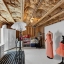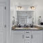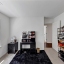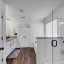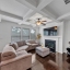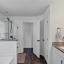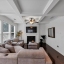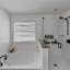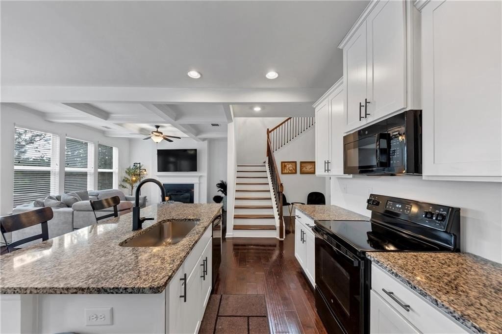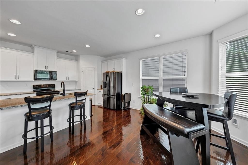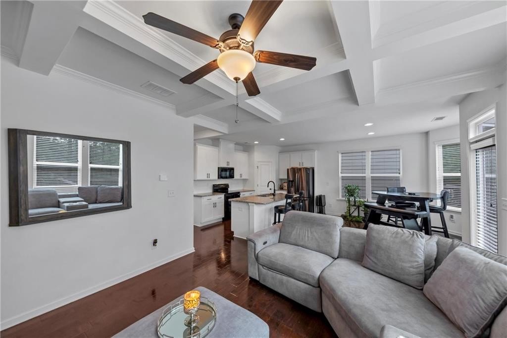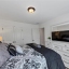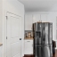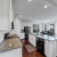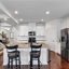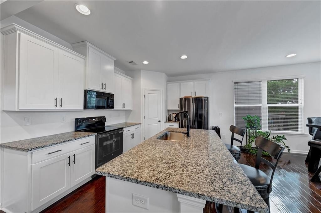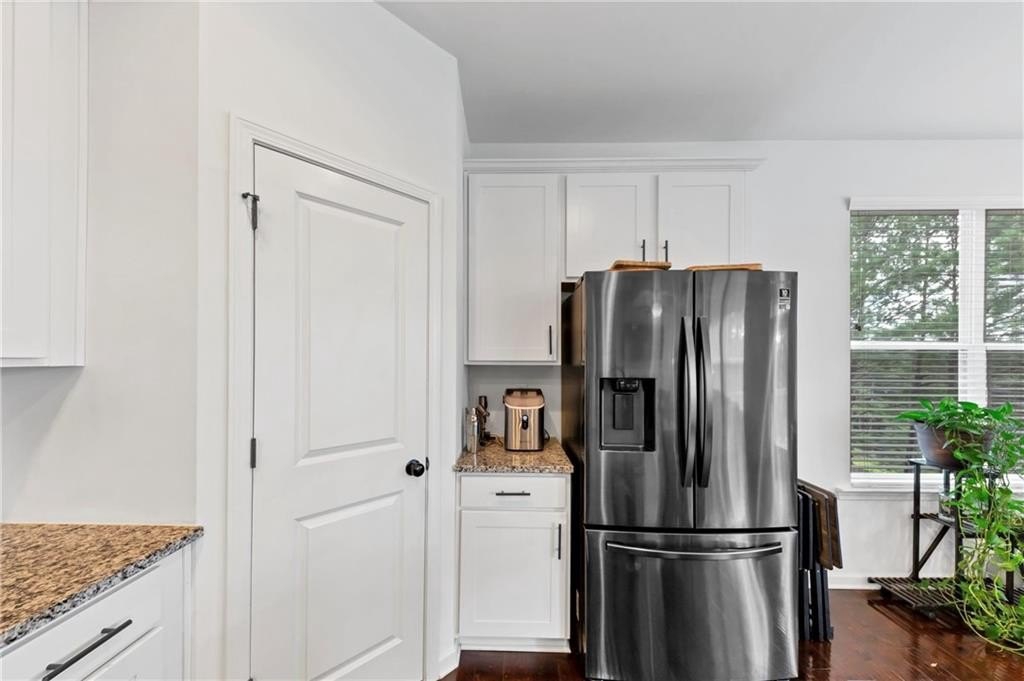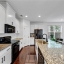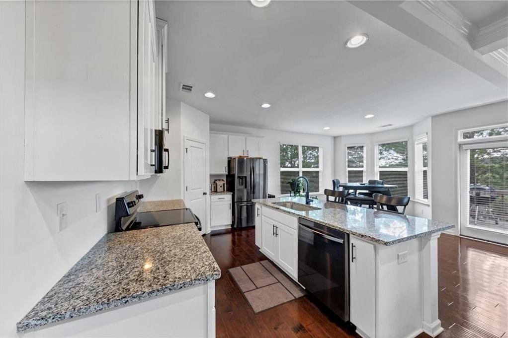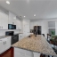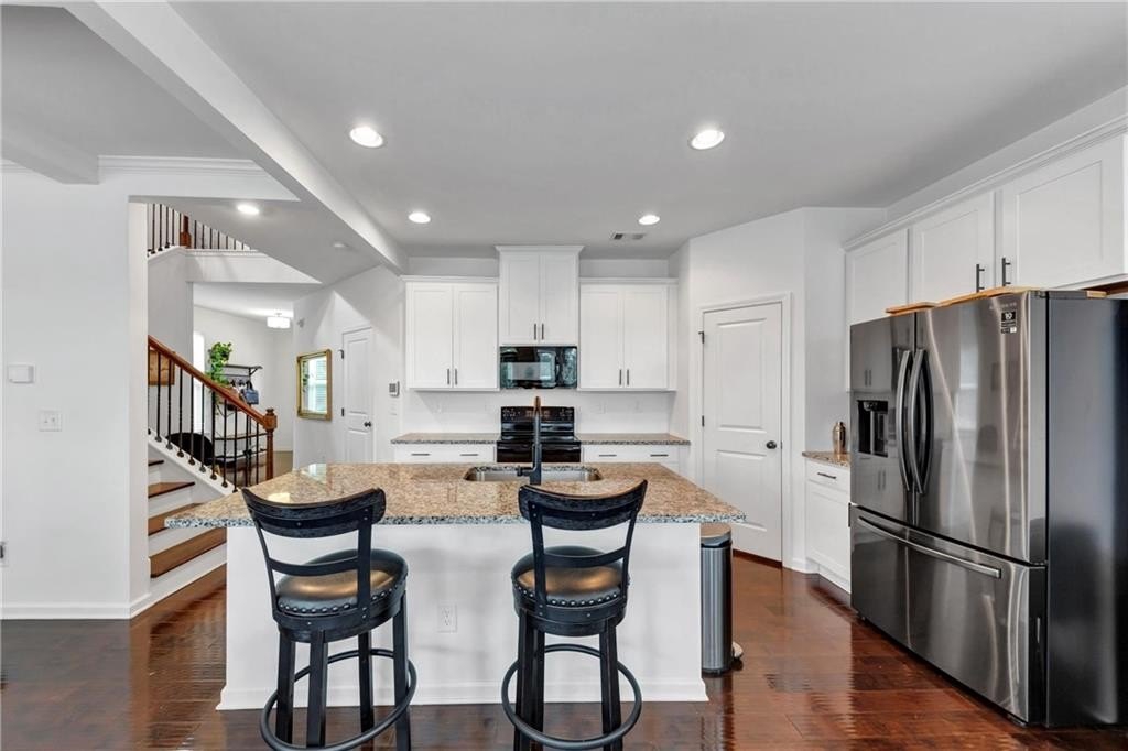 The kitchen is equipped with stainless steel appliances, including a refrigerator, and features beautiful white kitchen cabinets in combination with a spacious island with quartz countertops.