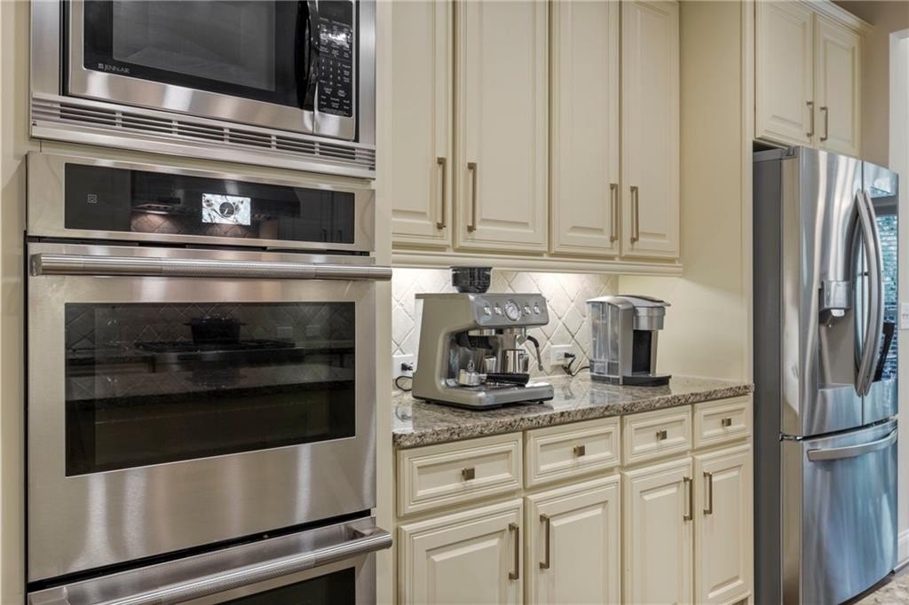 ***A CHEF's KITCHEN. All stainless steel Jenn-Air appliances. Double convection oven. 6-eye gas cooktop. Oversized range hood. Center Island is perfect for preparing and serving guests. Lots of counter space. Tons of recently updated cabinets with champagne gold fixtures and under cabinet lighting. An abundance of cabinet storage surrounds the kitchen. Granite countertops with tile backsplash. Champagne gold water fixture. Breakfast area for 4-6 people and breakfast bar that seats 3-4 people. If all the cabinets are not enough storage, there is a walk-in pantry for large appliances and food storage. From the pantry is the laundry room on the main level located at the garage door and the side exterior door.