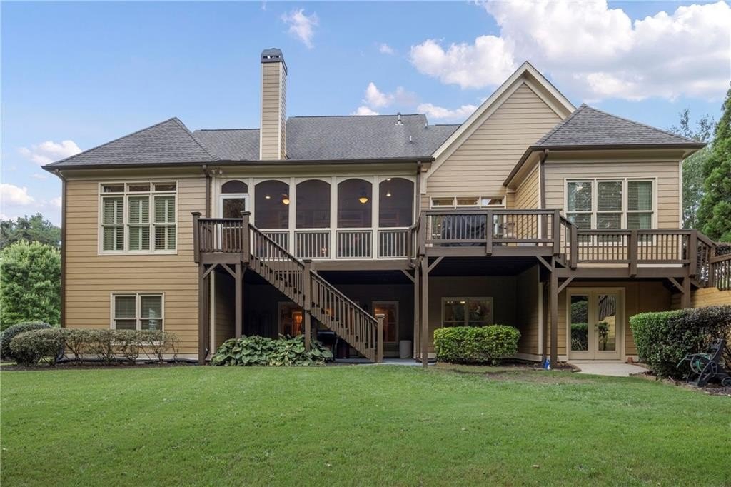 Enter this home through a 8-ft tall solid wood door into the grand 2 story foyer large enough to be a room of its own. HARDWOOD FLOORING throughout the main level except the bedrooms. To the right and left of the foyer is a very spacious dining room, large enough for a 10 seat dining table, and the living room with COFFERED CEILING. Can be used as an office. Both rooms have large blade SHUTTERS and get great sunlight. ALSO ON THE MAIN LEVEL ARE THE PRIMARY SUITE AND JR. PRIMARY SUITE. 2 BRs ON THE MAIN LEVEL!!!! Perfect for guests and in-laws. The Primary suite bath has been recently updated with modern SPA features. The Jr primary suite has a trey ceiling, garden tub and separate shower bath. The open 2- story family room features bookshelves, storage, and a masonry FIREPLACE with gas starter for beautiful fire lit nights watching a movie. The family room leads out to the screened enclosed deck with enough sitting room for outside entertaining (cable outlet), and the uncovered deck.