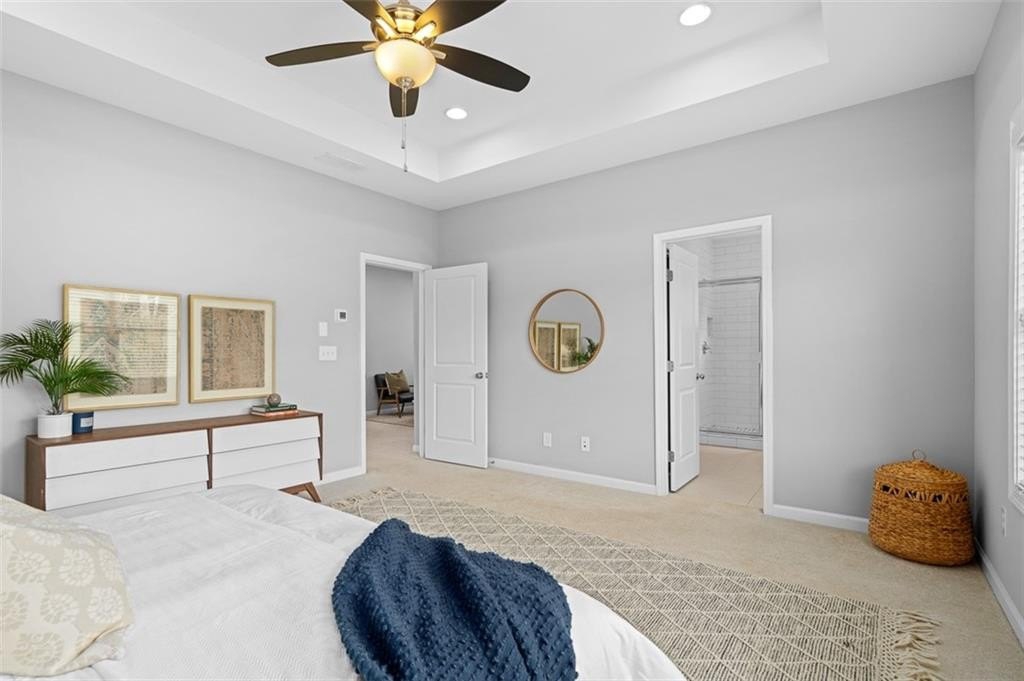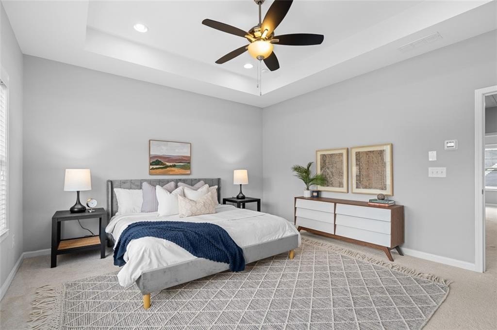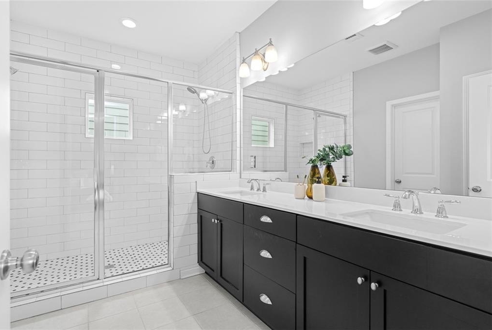 Upstairs, unwind in the generous owner’s suite with tray ceilings, a dual-entry walk-in closet, and a spacious en-suite bathroom complete with double vanities and a large tiled walk-in shower. Two additional secondary bedrooms offer ample space for family, guests, or remote work, and share a full bath with modern finishes. The upstairs laundry room adds convenience to daily living.