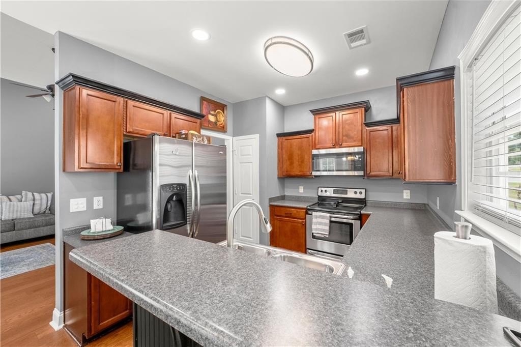 Beautifully maintained 3 bed, 2 bath ranch in a prime Lawrenceville location with NO HOA—perfect for first-time buyers, downsizers, or investors! This move-in-ready home features vaulted ceilings, recessed lighting, and a popular roommate-style floor plan. The open concept layout includes 10+ ft ceilings and seamless flow from the kitchen to the living and dining areas, ideal for entertaining. The private owner’s suite offers a walk-in closet and full bath, while two secondary bedrooms are positioned on the opposite side for added privacy. Sitting on a spacious 0.31-acre level lot, this home offers generous front and back yards—perfect for outdoor entertaining, gardening, or future expansion. Includes a 2-car garage and extended driveway. Conveniently located minutes to Downtown Lawrenceville, Sugarloaf Pkwy, Hwy 316, GA-20, parks, shopping, dining, and top-rated Gwinnett schools.