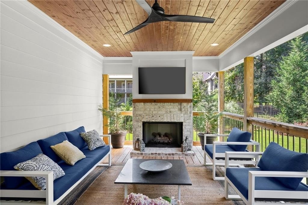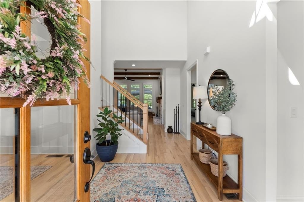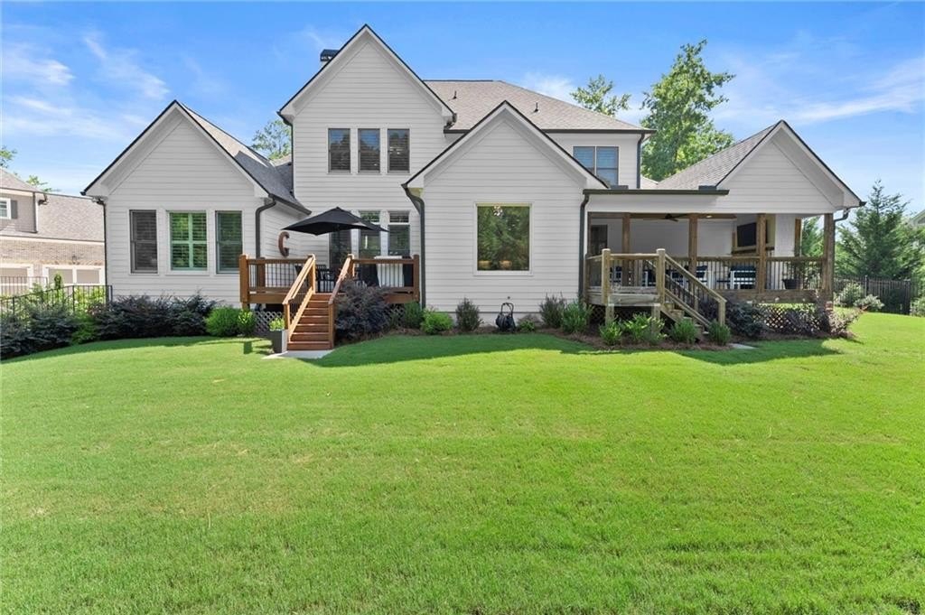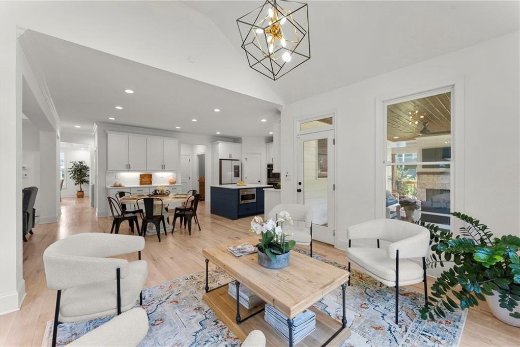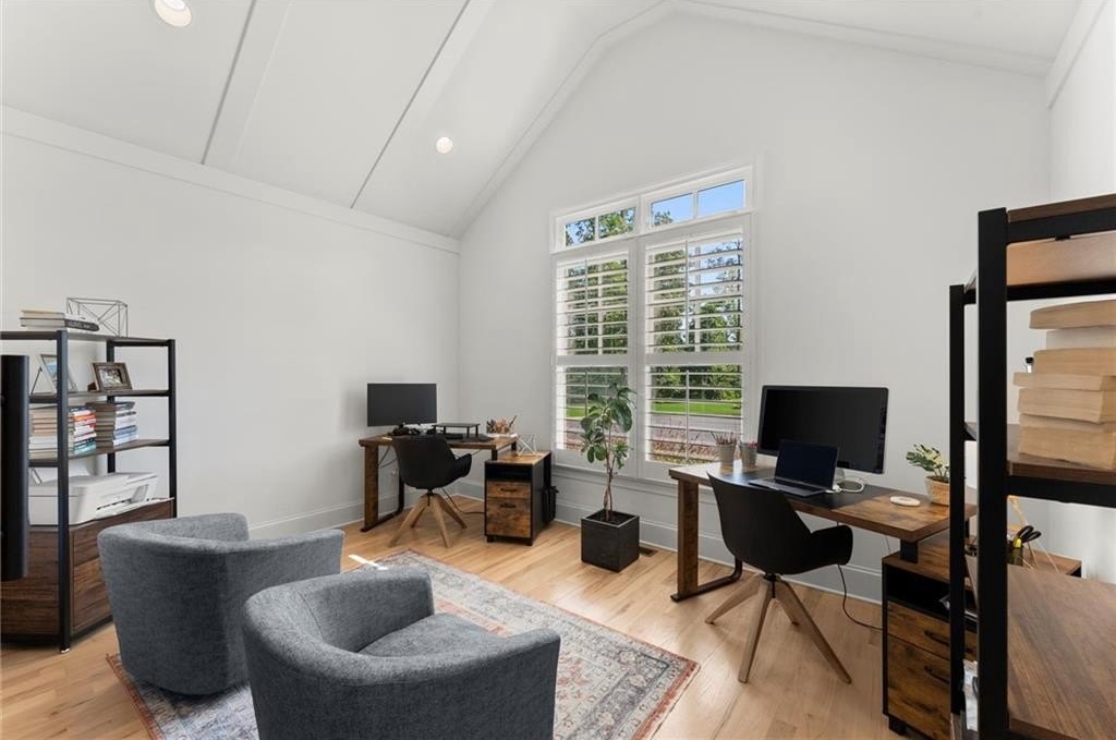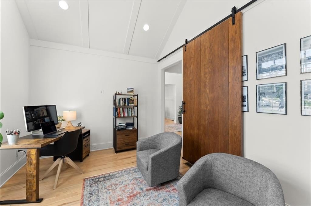 Enjoy a spacious layout that includes a main-floor primary suite, a beautiful home office with soaring ceilings and a handcrafted wood barn door, and a chef-inspired kitchen that opens seamlessly into the living space. From the main living area, walk out onto two oversized decks—just 4–5 steps from the ground—making them perfect for entertaining, relaxing, or watching kids or pets play. This home features beautiful plantation shutters on every window, adding timeless elegance and effortless natural light control.