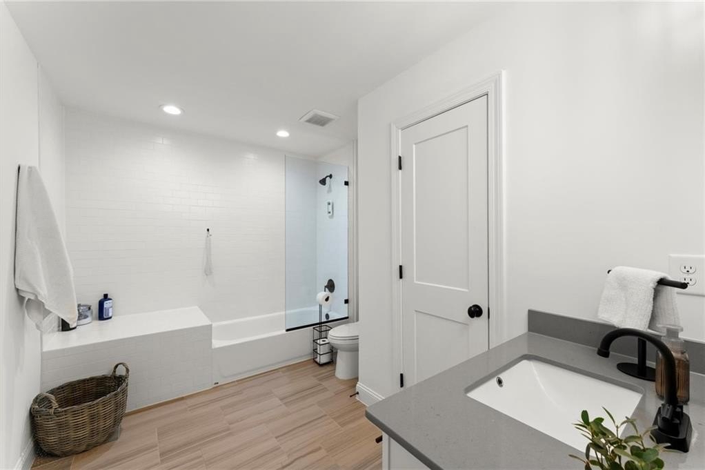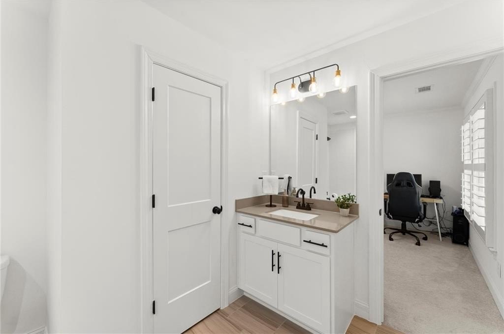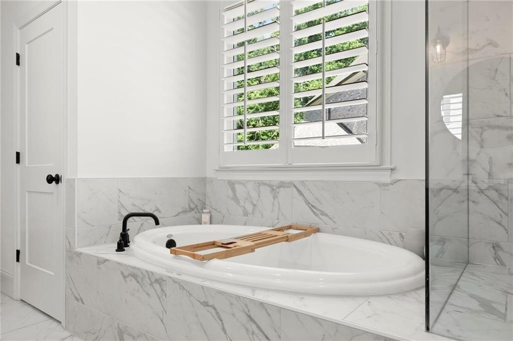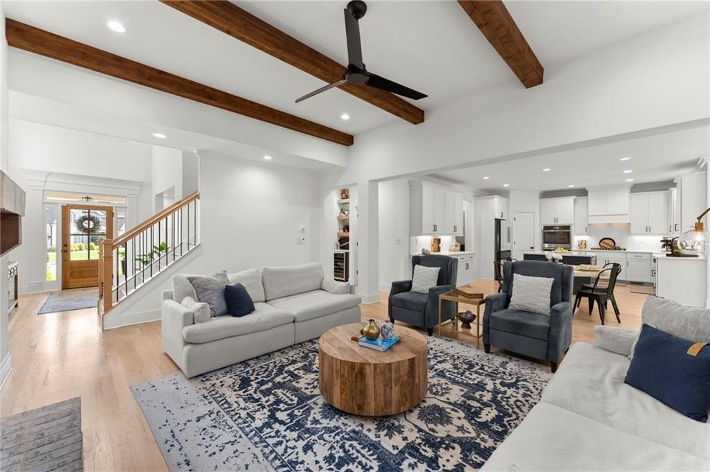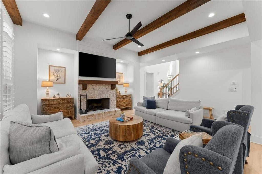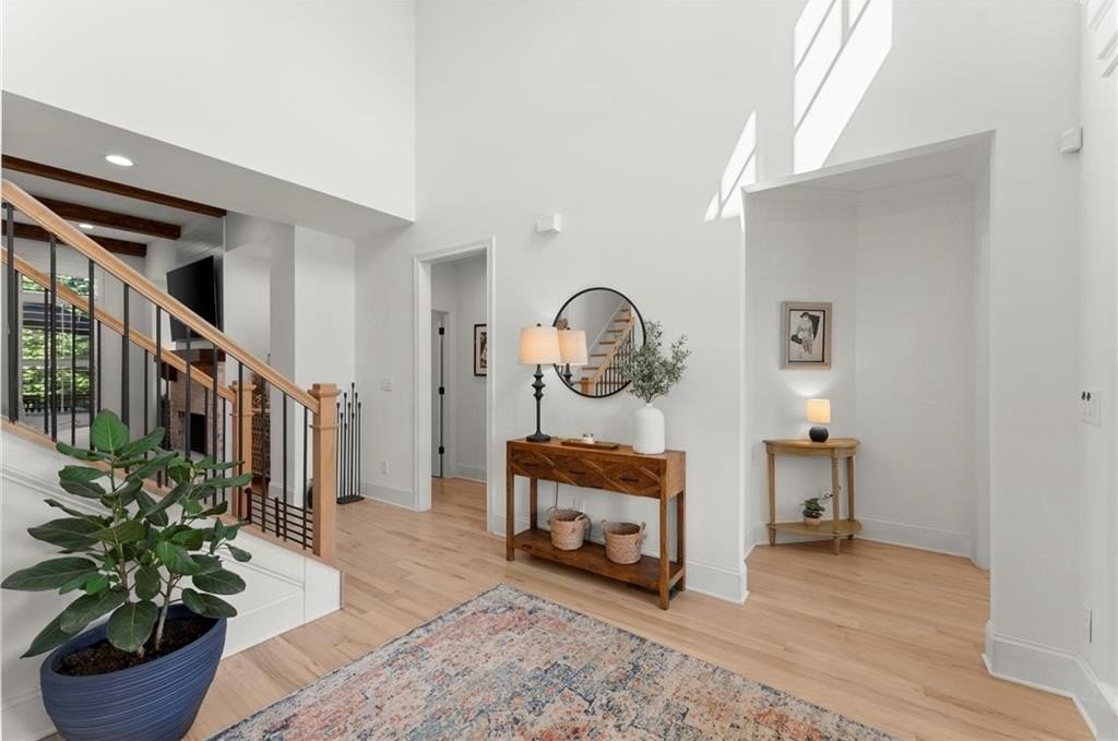 Enjoy a spacious layout that includes a main-floor primary suite, a beautiful home office with soaring ceilings and a handcrafted wood barn door, and a chef-inspired kitchen that opens seamlessly into the living space. From the main living area, walk out onto two oversized decks—just 4–5 steps from the ground—making them perfect for entertaining, relaxing, or watching kids or pets play. This home features beautiful plantation shutters on every window, adding timeless elegance and effortless natural light control.
