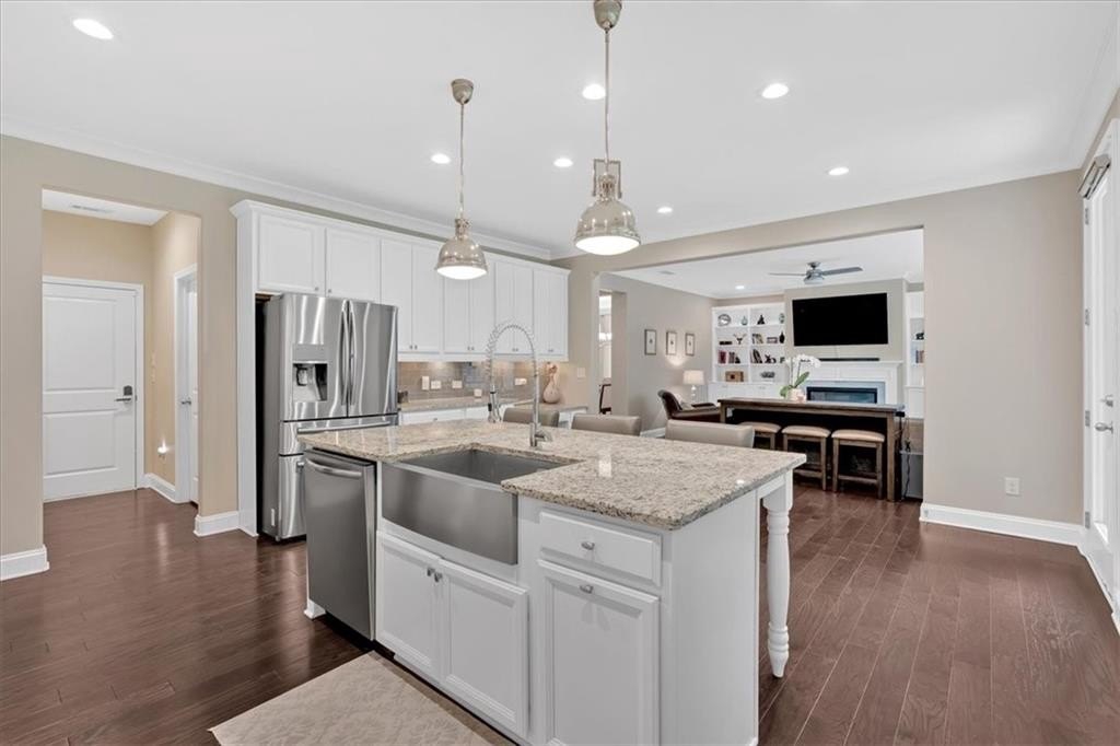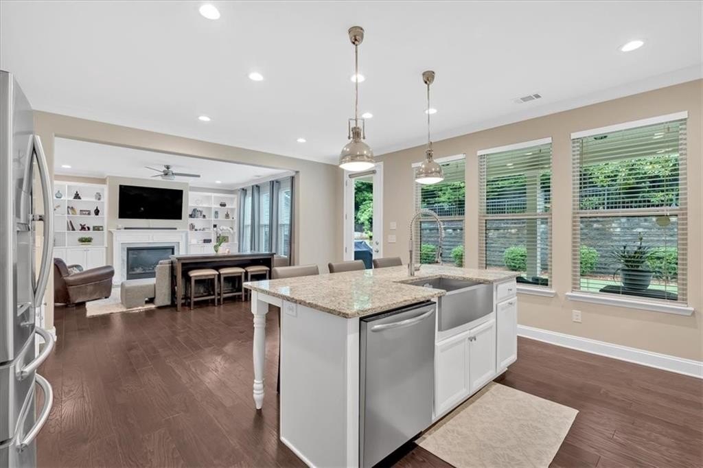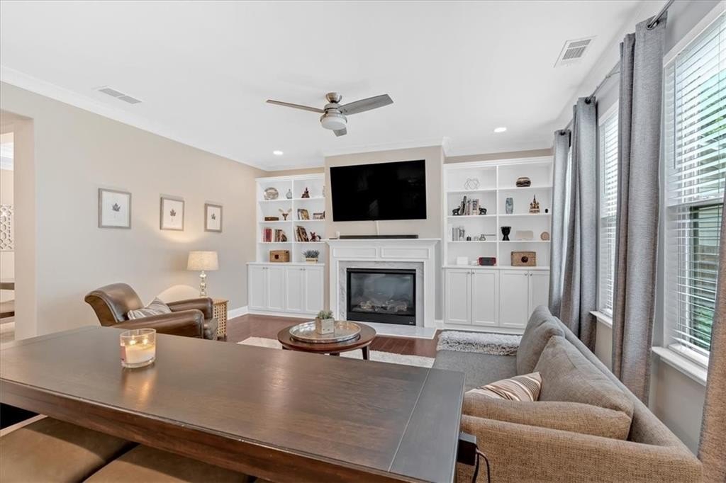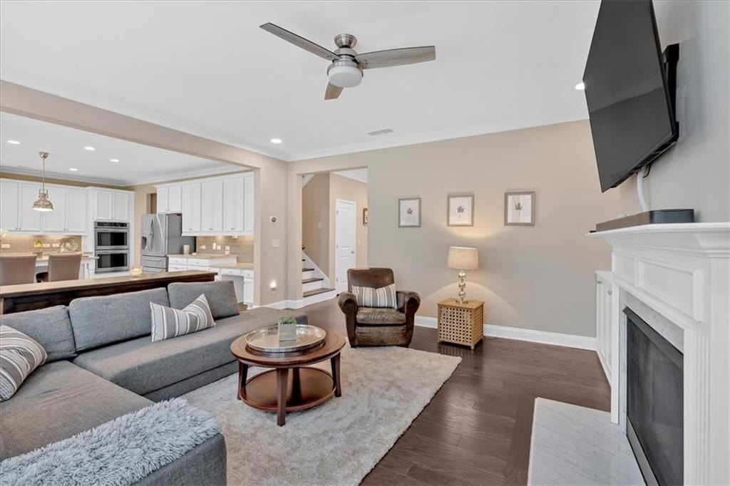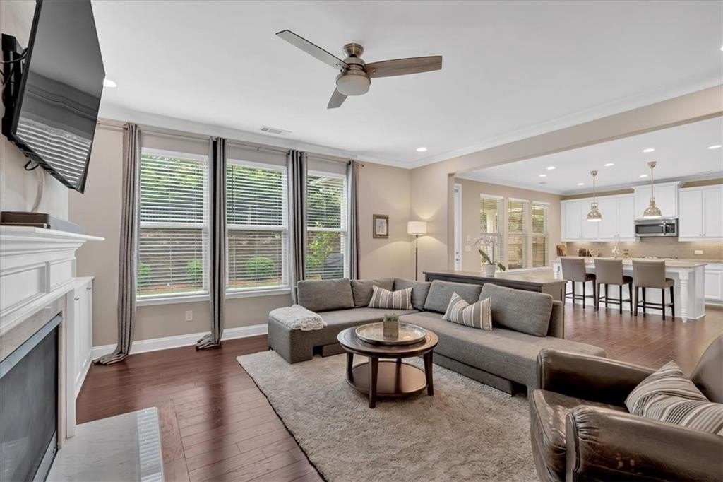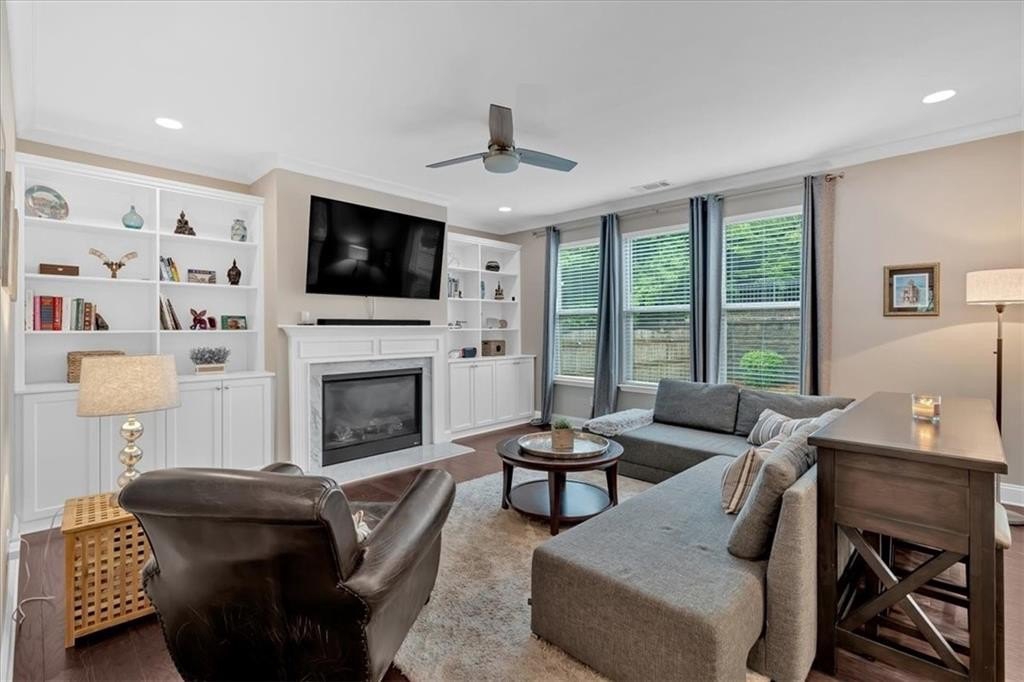 MOVE-IN READY… Freshly painted with new carpet! Located just a short walk to Roswell Town Square, local coffee shops, and excellent restaurants, you are sure to love this exceptional home in the heart of Roswell. As you enter this open floor plan, you will find a family room with a gas fireplace and custom-built bookshelves that flow seamlessly into a spacious kitchen featuring 42” cabinets, a stainless-steel gas cooktop, double ovens, a charming farmhouse sink, and a large island perfect for entertaining. A walk-in pantry adds extra convenience. There’s a full bedroom and bathroom on the main level, ideal for guests, a home office, or a playroom. Upstairs, you'll love the primary suite, which offers a well-appointed space featuring hardwood floors, a spa-like bathroom, and an oversized walk-in closet with built-in shelves and ample storage. There's also a loft area that provides additional space for a game room, lounge, or creative area, along with two more bedrooms featuring brand-new carpet and a shared hall bath. In the garage, you'll find an EV charger and plenty of room for storage. Good news—the HOA covers lawn care and irrigation for the entire community. You’re sure to love this friendly, social community where neighbors know each other's names and friendships come easily. Call today to schedule an easy appointment!