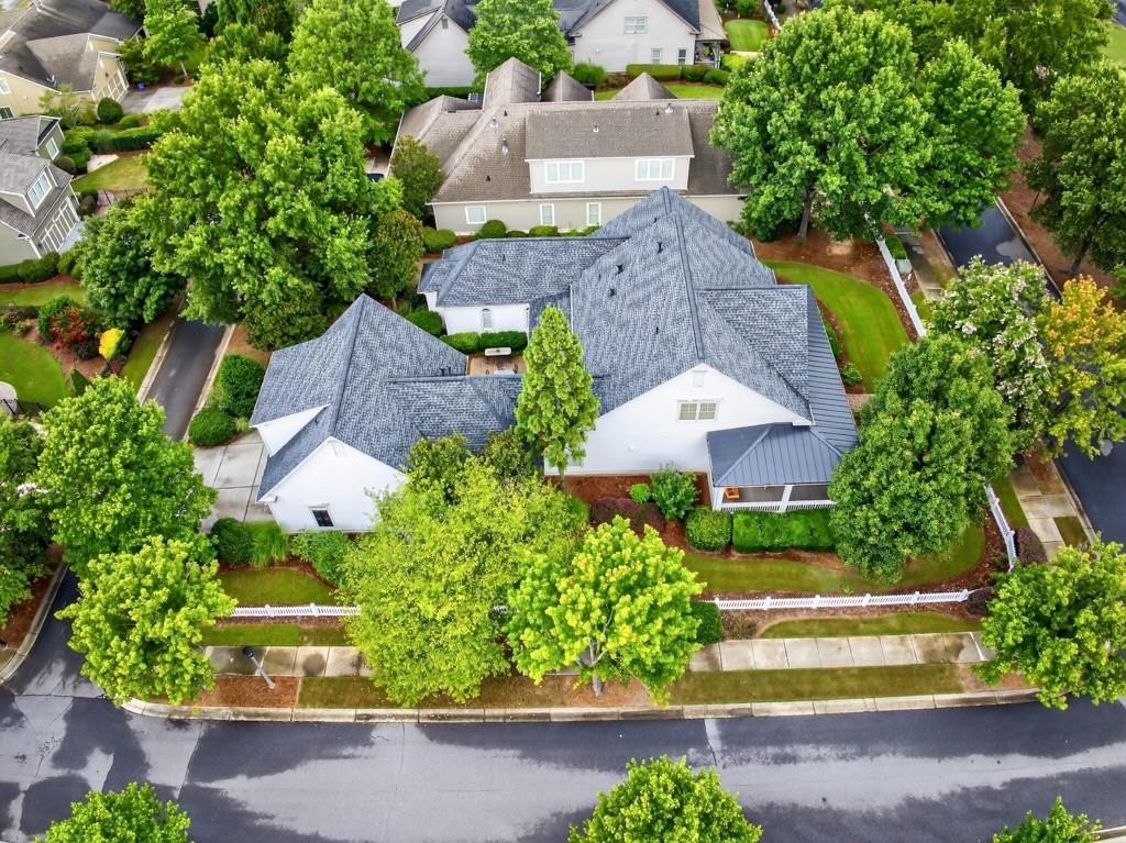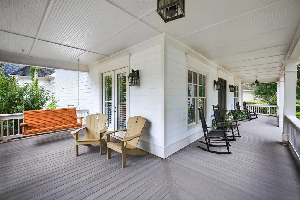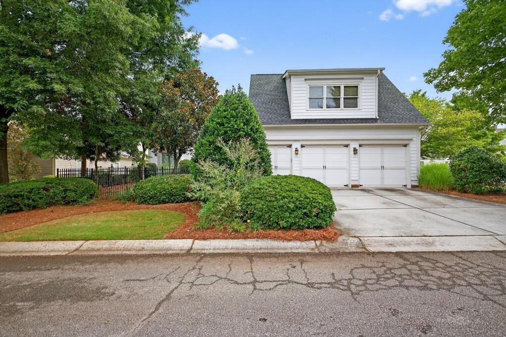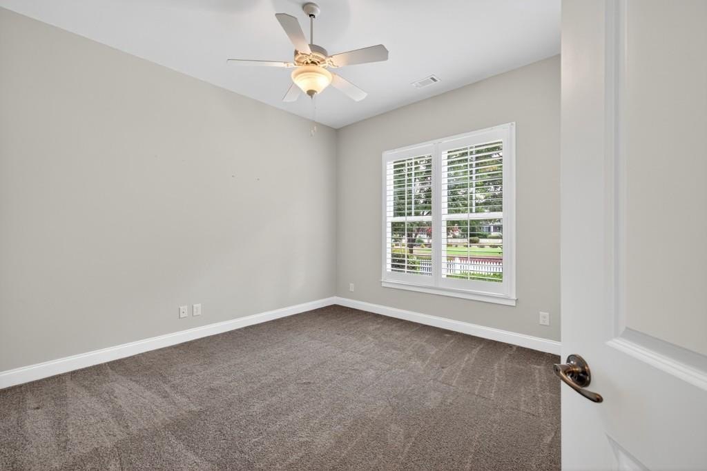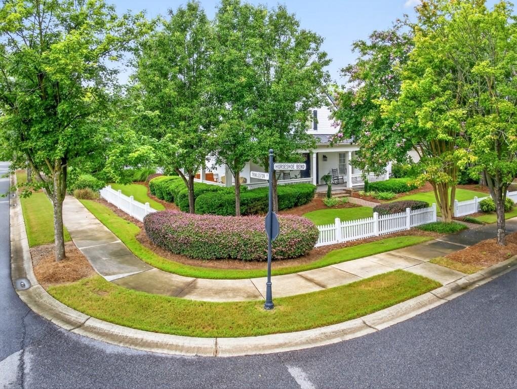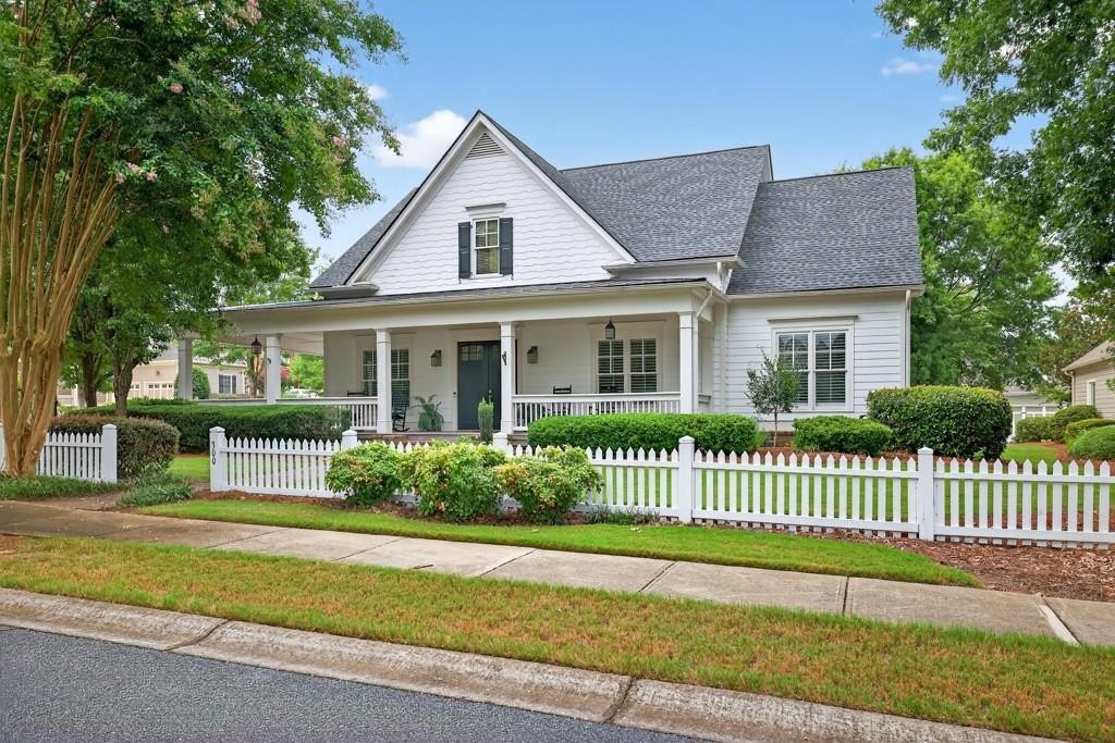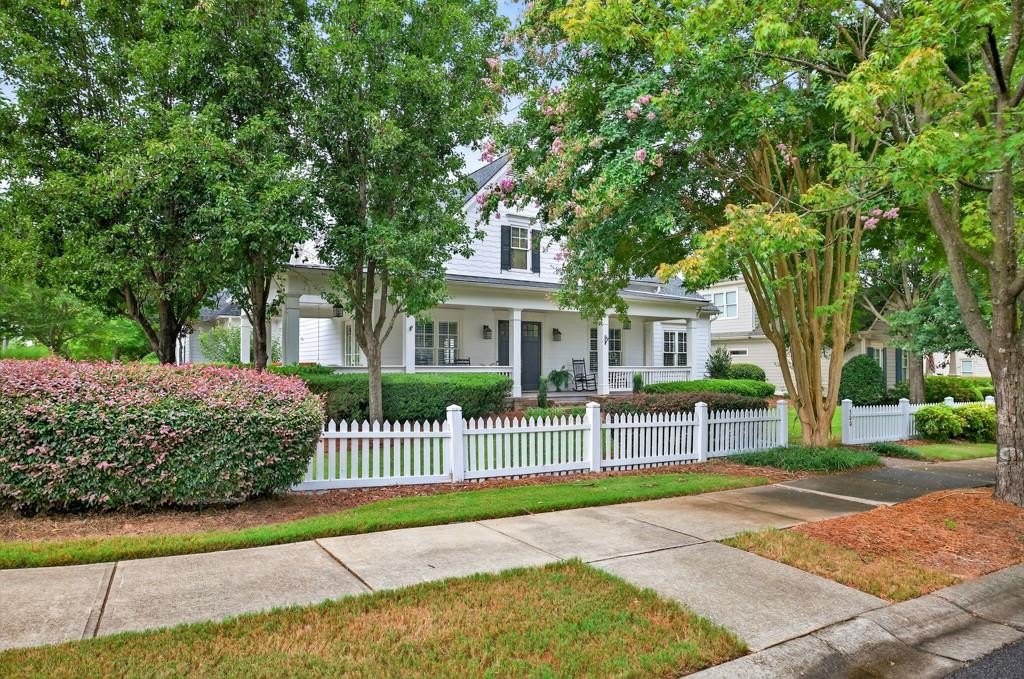 Welcome to this luxuriously upgraded 5-bedroom, 4-bathroom home in the highly sought-after Georgia Club, a gated golf course community known for its Southern charm and resort-style amenities. Situated on a premium corner lot, this beautifully maintained home features a white picket fence, a charming wraparound front porch, and a rear-entry garage, all adding to its curb appeal. Inside, enjoy new flooring, fresh interior and exterior paint, and thoughtful architectural details throughout. The spacious living room features a coffered ceiling, creating a sophisticated and inviting space for gatherings. The kitchen is accented with brick details, blending rustic warmth with modern utility. Perfect for remote work or study, the private office includes custom-built-in shelving. The oversized primary suite is a true retreat, featuring two large custom walk-in closets and a spa-inspired en suite bathroom with a large walk-in shower, double vanities, and elegant finishes. Enjoy year-round efficiency with a solar energy system and keep your landscaping lush with the automated sprinkler system. Located in The Georgia Club, residents have access to world-class amenities: golf, pools, tennis courts, clubhouse, fitness center, and walking trails. This home offers a rare combination of classic Southern charm and modern luxury in one of Georgia's most desirable communities.