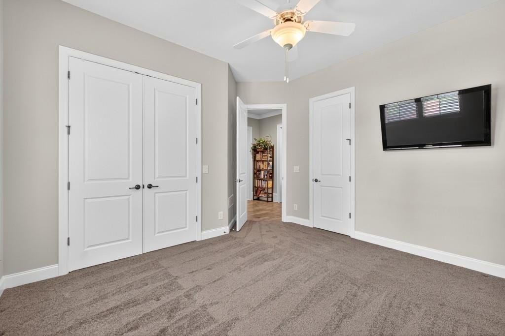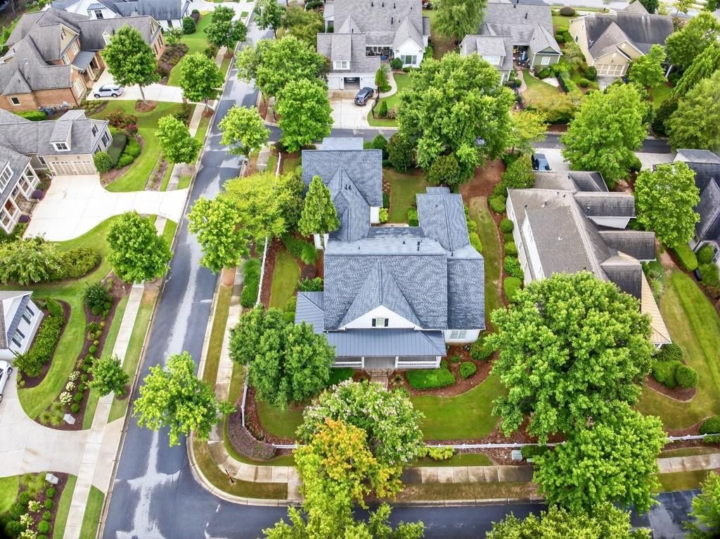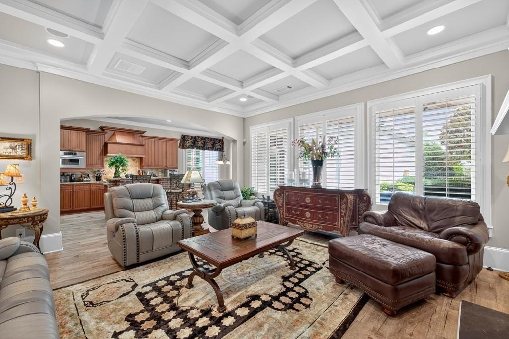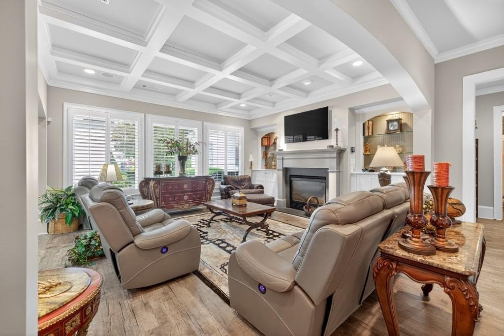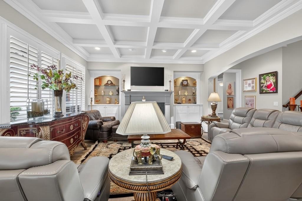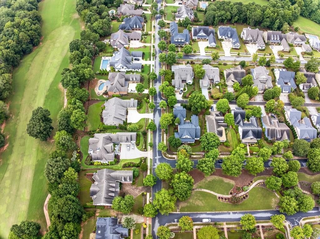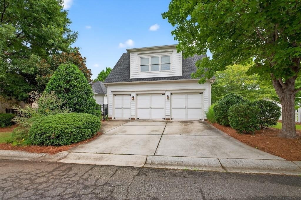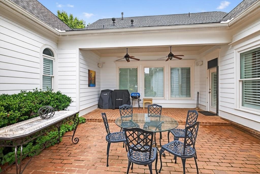 Welcome to this luxuriously upgraded 5-bedroom, 4-bathroom home in the highly sought-after Georgia Club, a gated golf course community known for its Southern charm and resort-style amenities. Situated on a premium corner lot, this beautifully maintained home features a white picket fence, a charming wraparound front porch, and a rear-entry garage, all adding to its curb appeal. Inside, enjoy new flooring, fresh interior and exterior paint, and thoughtful architectural details throughout. The spacious living room features a coffered ceiling, creating a sophisticated and inviting space for gatherings. The kitchen is accented with brick details, blending rustic warmth with modern utility. Perfect for remote work or study, the private office includes custom-built-in shelving. The oversized primary suite is a true retreat, featuring two large custom walk-in closets and a spa-inspired en suite bathroom with a large walk-in shower, double vanities, and elegant finishes. Enjoy year-round efficiency with a solar energy system and keep your landscaping lush with the automated sprinkler system. Located in The Georgia Club, residents have access to world-class amenities: golf, pools, tennis courts, clubhouse, fitness center, and walking trails. This home offers a rare combination of classic Southern charm and modern luxury in one of Georgia's most desirable communities.
