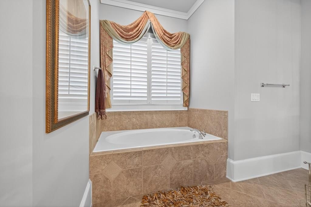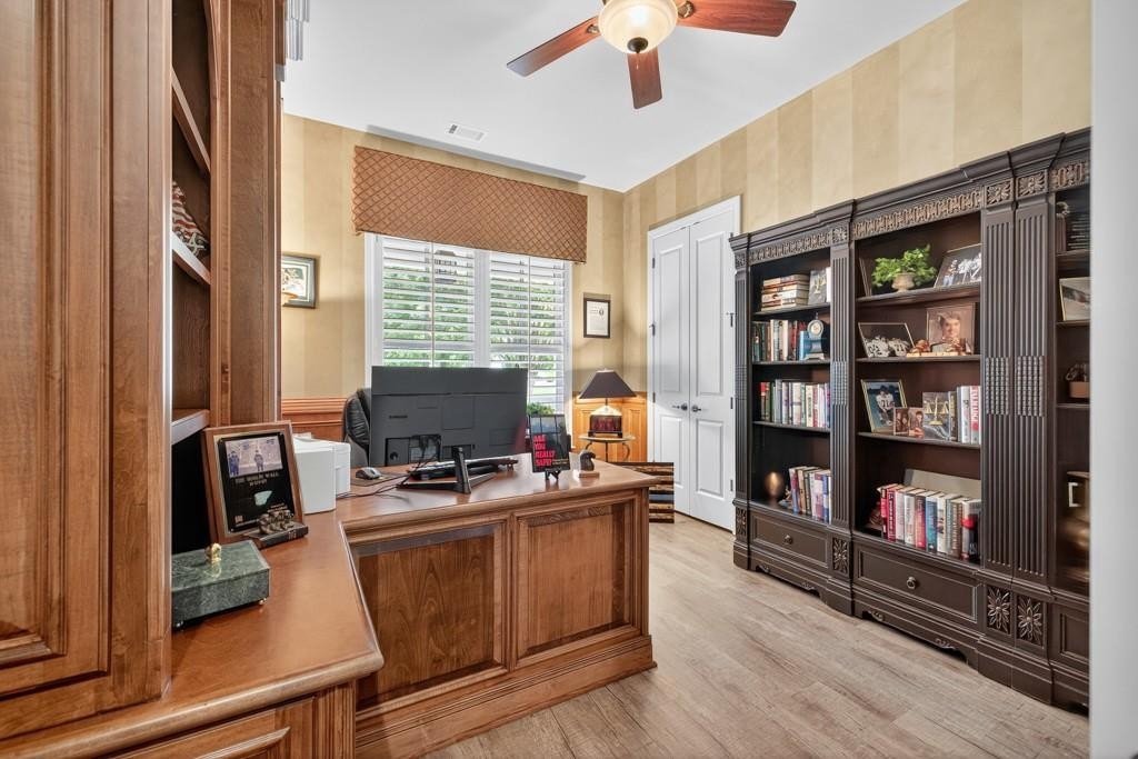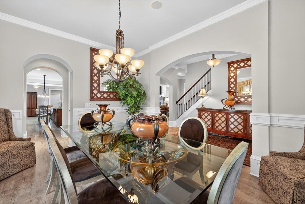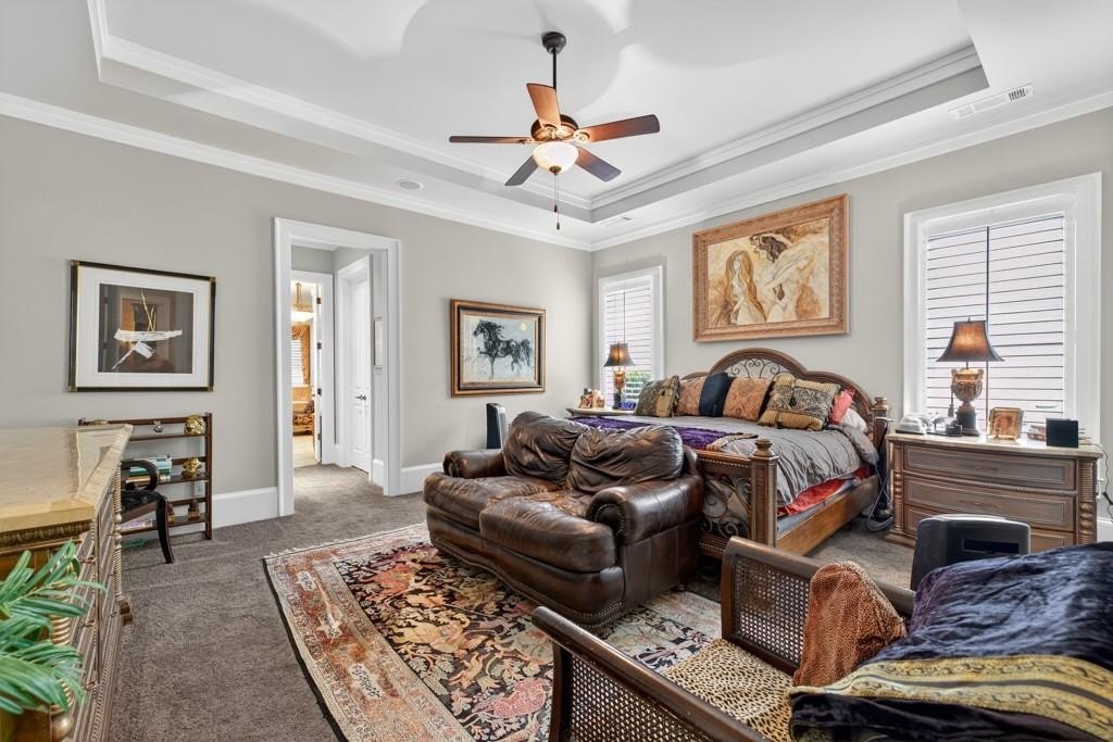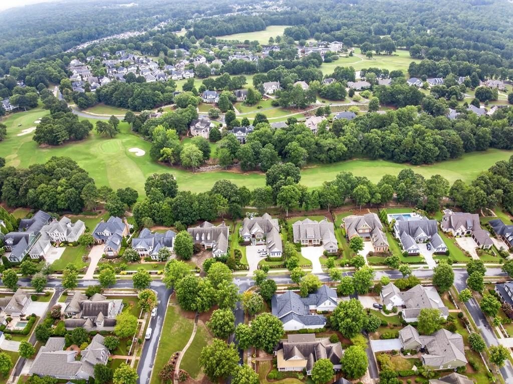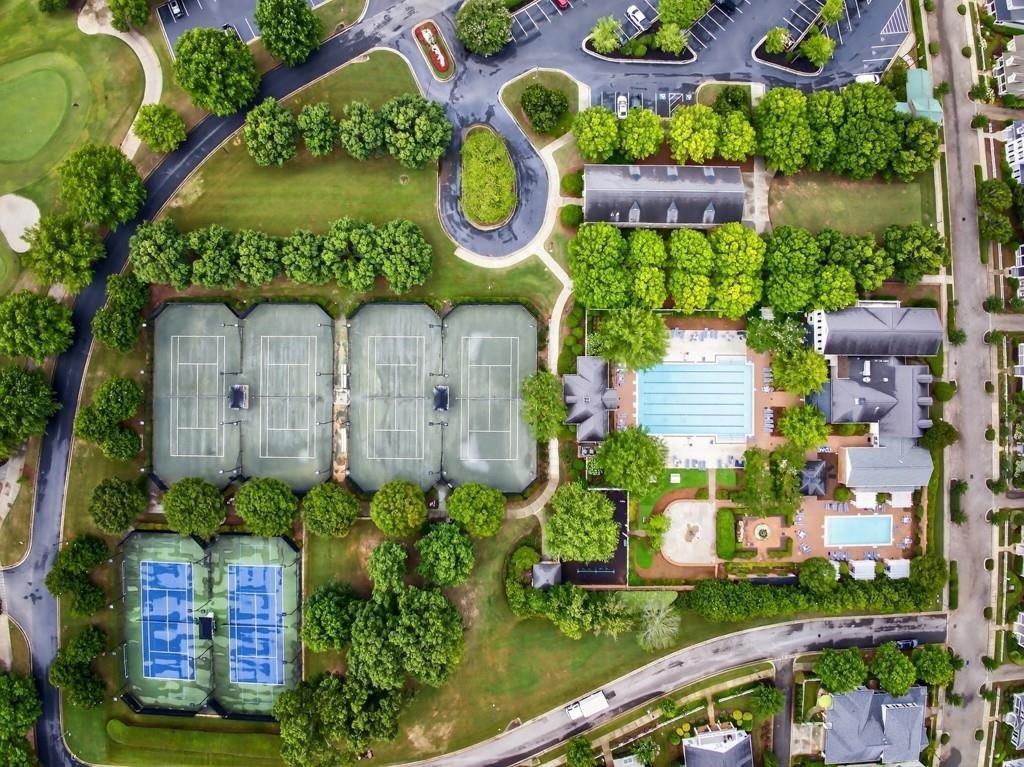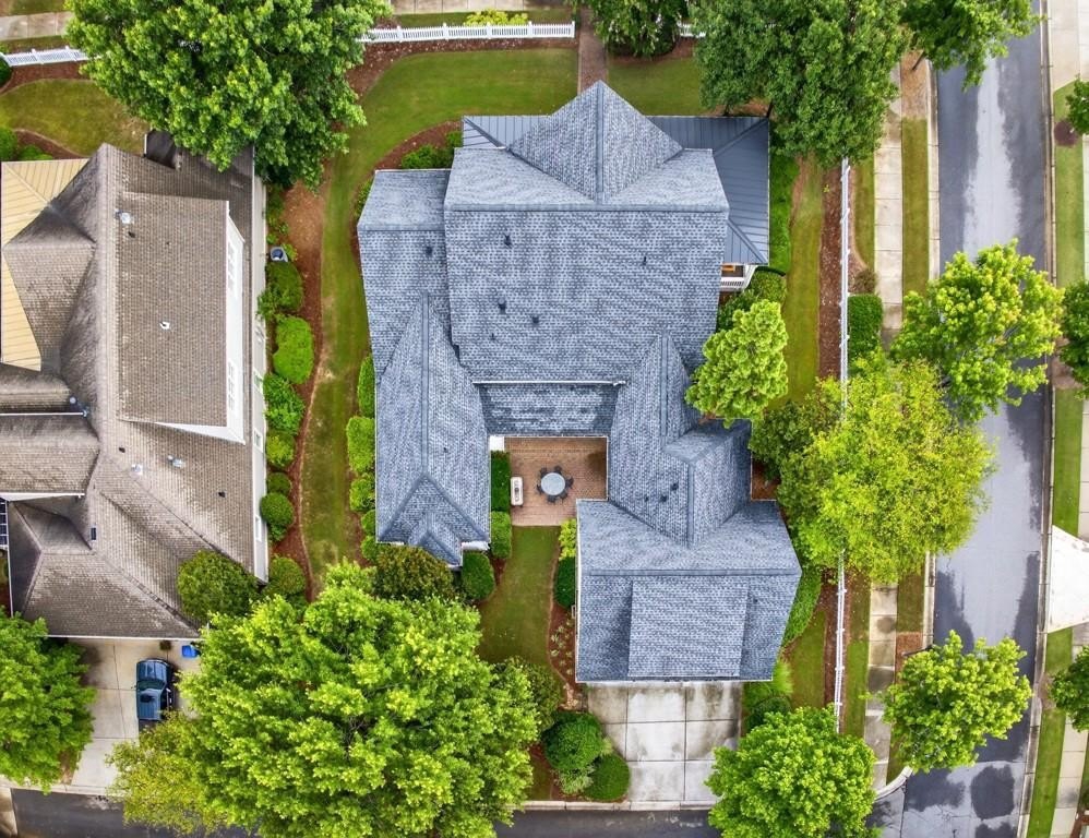 Welcome to this luxuriously upgraded 5-bedroom, 4-bathroom home in the highly sought-after Georgia Club, a gated golf course community known for its Southern charm and resort-style amenities. Situated on a premium corner lot, this beautifully maintained home features a white picket fence, a charming wraparound front porch, and a rear-entry garage, all adding to its curb appeal. Inside, enjoy new flooring, fresh interior and exterior paint, and thoughtful architectural details throughout. The spacious living room features a coffered ceiling, creating a sophisticated and inviting space for gatherings. The kitchen is accented with brick details, blending rustic warmth with modern utility. Perfect for remote work or study, the private office includes custom-built-in shelving. The oversized primary suite is a true retreat, featuring two large custom walk-in closets and a spa-inspired en suite bathroom with a large walk-in shower, double vanities, and elegant finishes. Enjoy year-round efficiency with a solar energy system and keep your landscaping lush with the automated sprinkler system. Located in The Georgia Club, residents have access to world-class amenities: golf, pools, tennis courts, clubhouse, fitness center, and walking trails. This home offers a rare combination of classic Southern charm and modern luxury in one of Georgia's most desirable communities.
