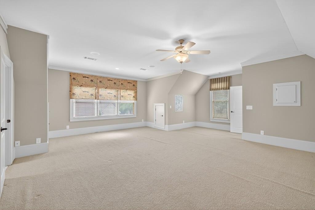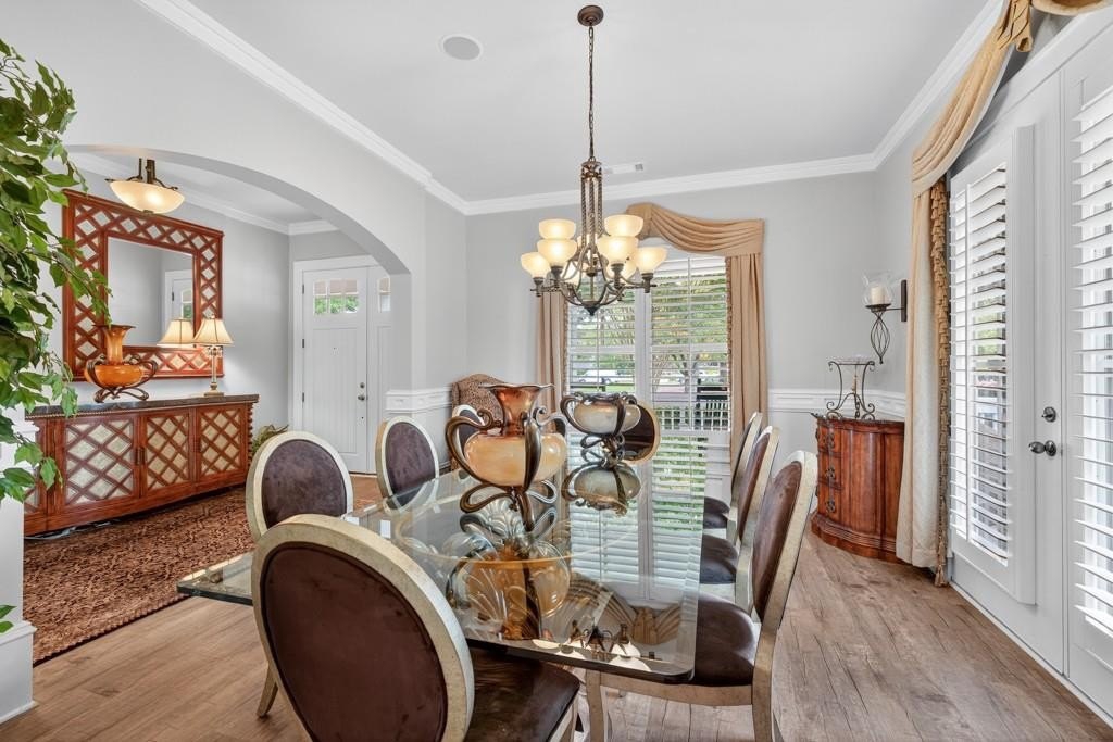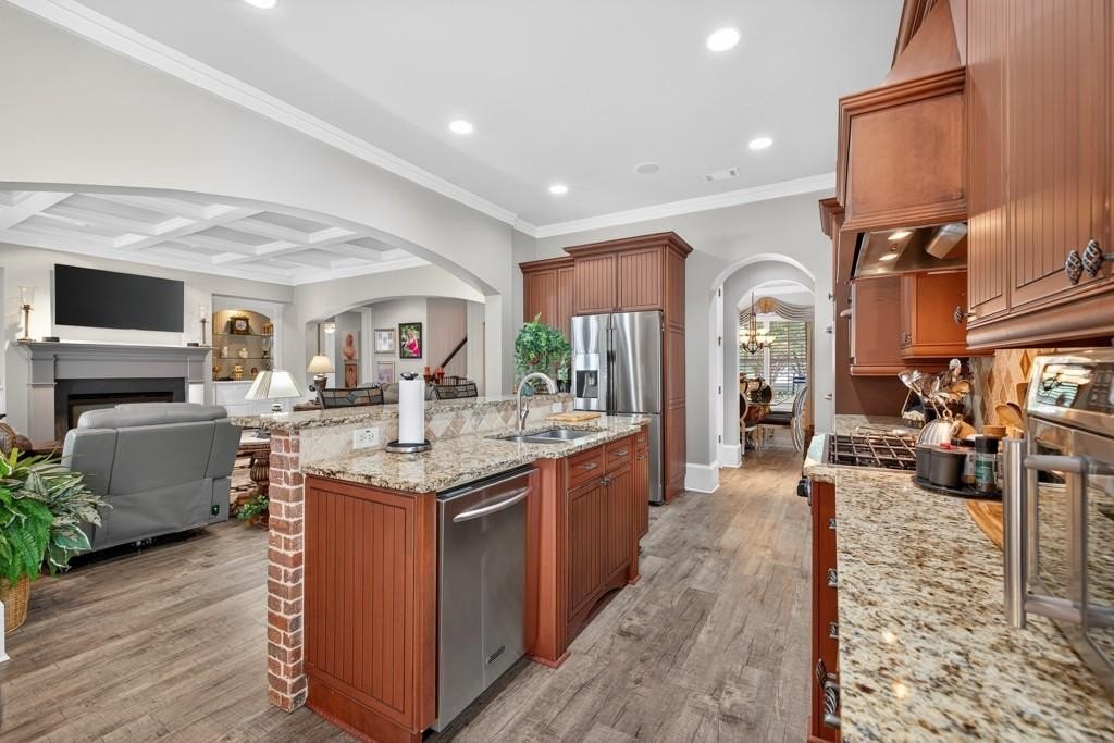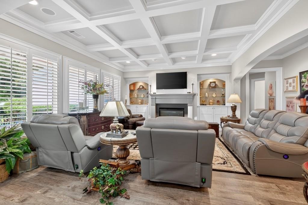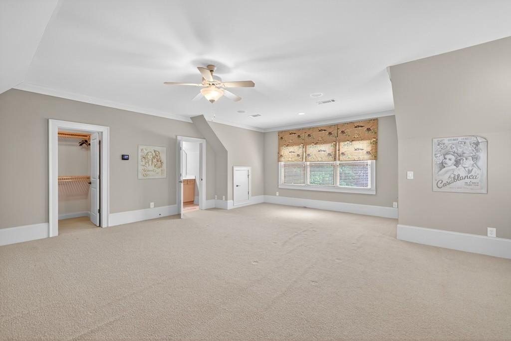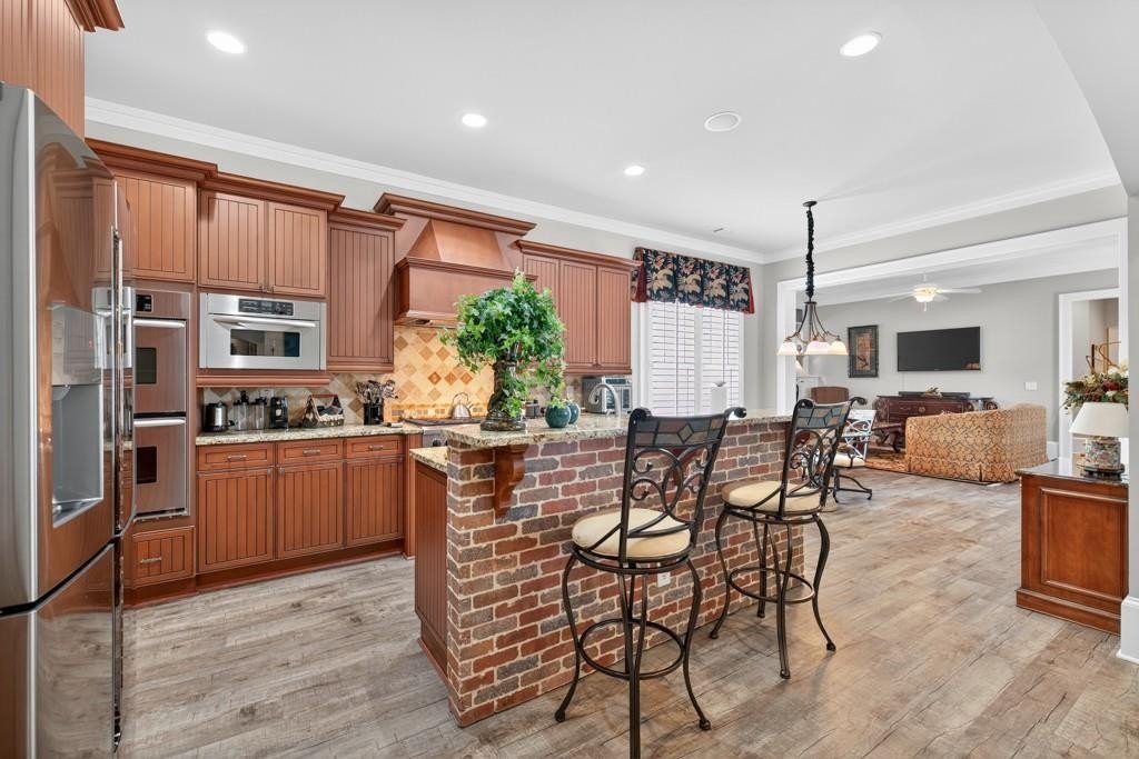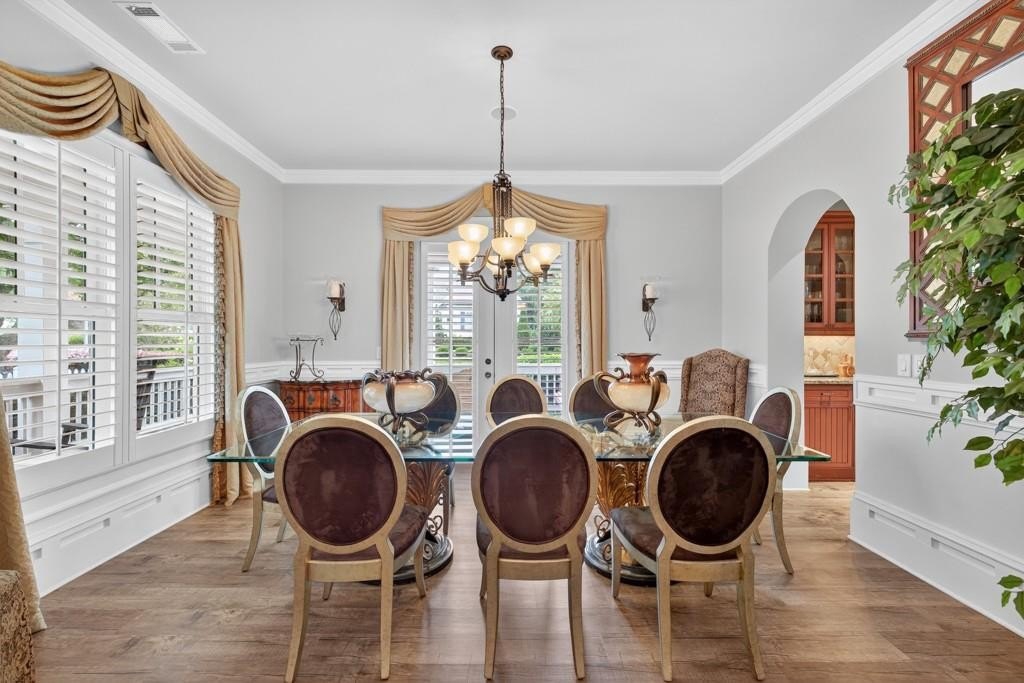 Welcome to this luxuriously upgraded 5-bedroom, 4-bathroom home in the highly sought-after Georgia Club, a gated golf course community known for its Southern charm and resort-style amenities. Situated on a premium corner lot, this beautifully maintained home features a white picket fence, a charming wraparound front porch, and a rear-entry garage, all adding to its curb appeal. Inside, enjoy new flooring, fresh interior and exterior paint, and thoughtful architectural details throughout. The spacious living room features a coffered ceiling, creating a sophisticated and inviting space for gatherings. The kitchen is accented with brick details, blending rustic warmth with modern utility. Perfect for remote work or study, the private office includes custom-built-in shelving. The oversized primary suite is a true retreat, featuring two large custom walk-in closets and a spa-inspired en suite bathroom with a large walk-in shower, double vanities, and elegant finishes. Enjoy year-round efficiency with a solar energy system and keep your landscaping lush with the automated sprinkler system. Located in The Georgia Club, residents have access to world-class amenities: golf, pools, tennis courts, clubhouse, fitness center, and walking trails. This home offers a rare combination of classic Southern charm and modern luxury in one of Georgia's most desirable communities.