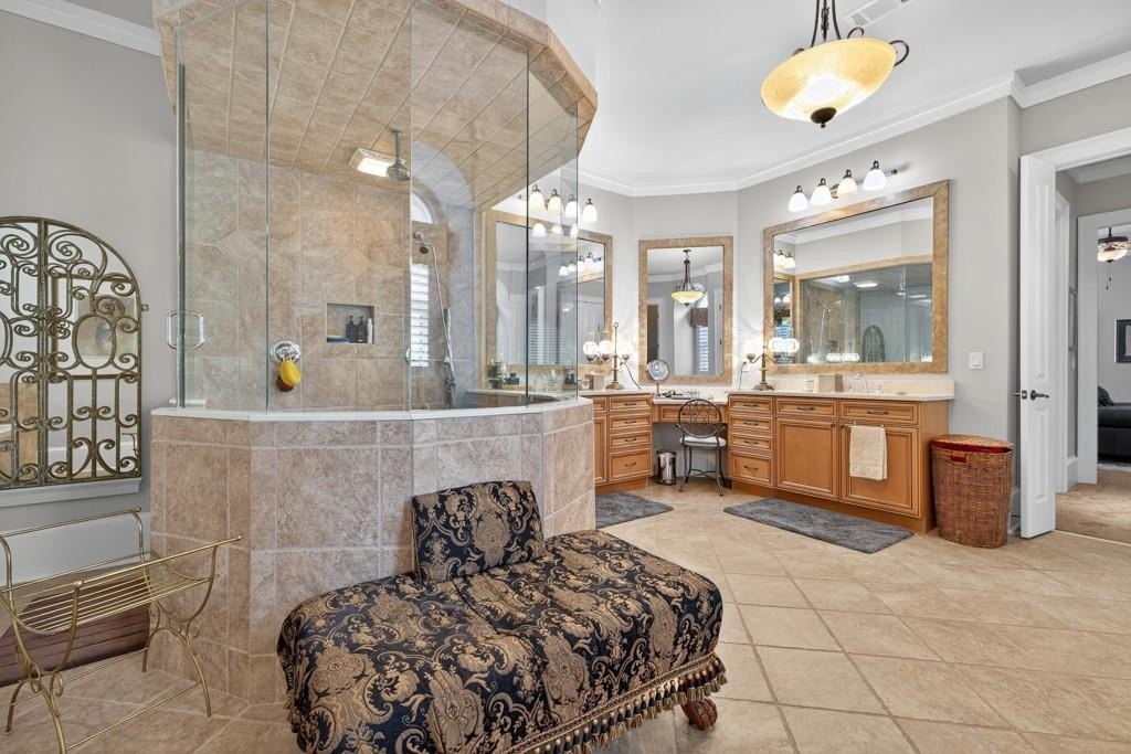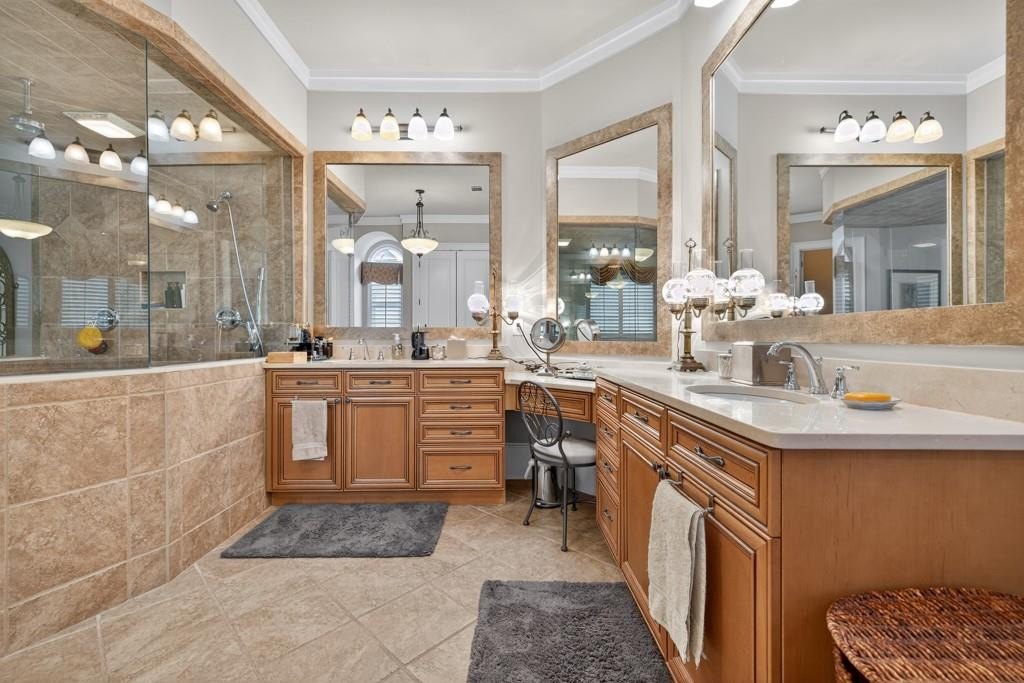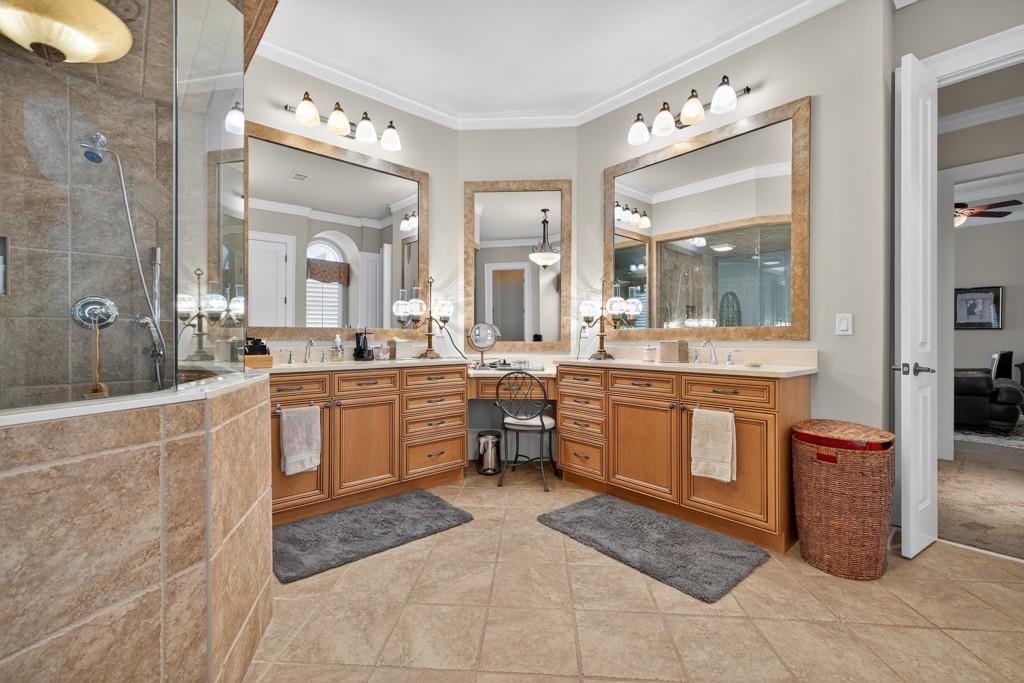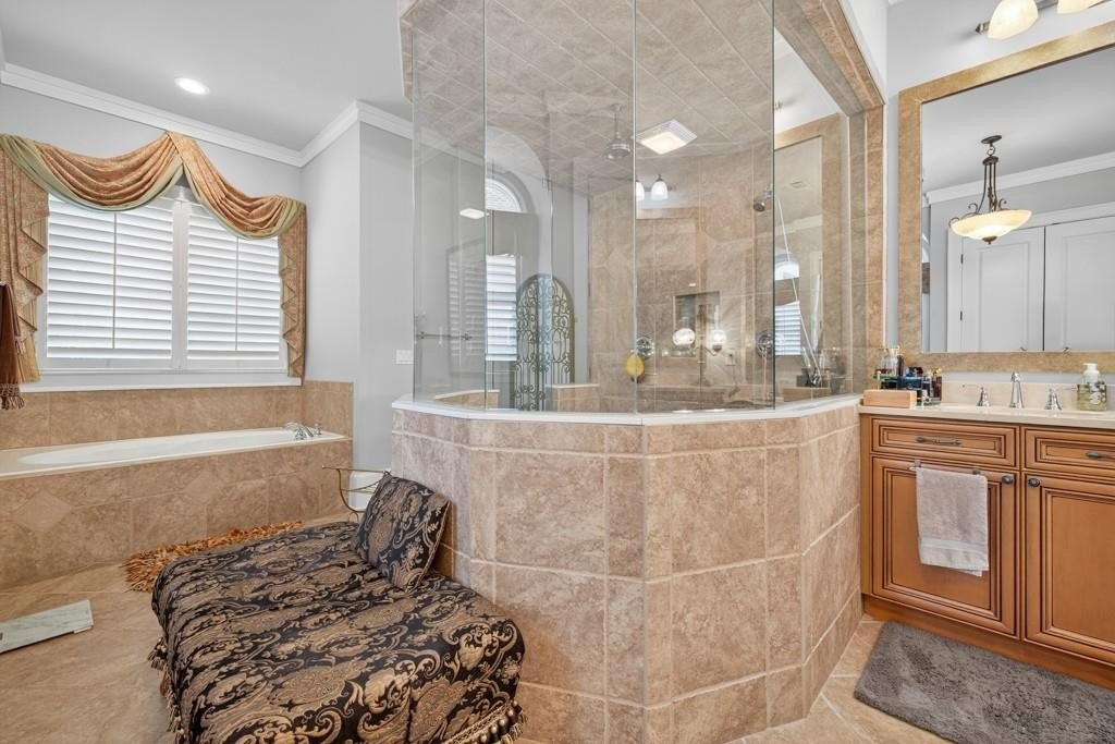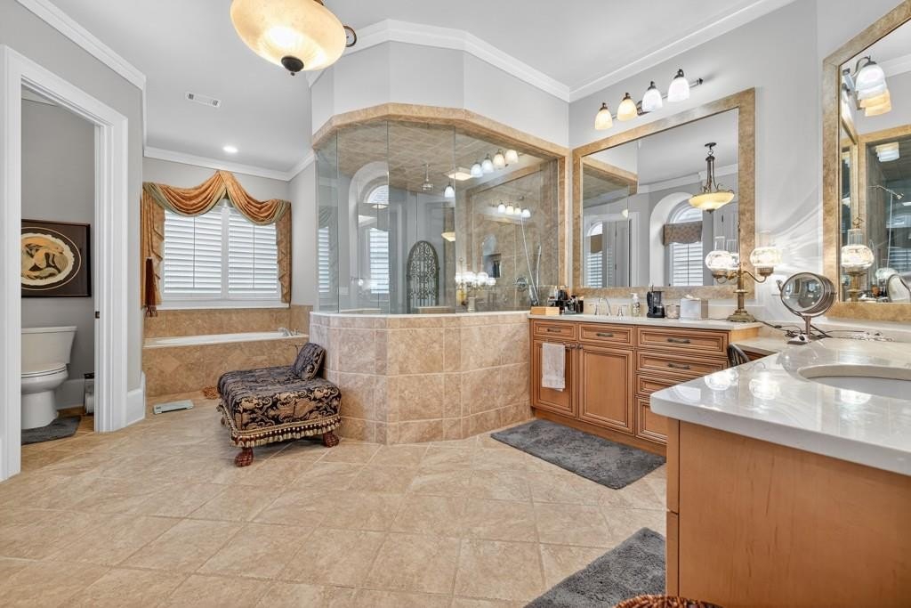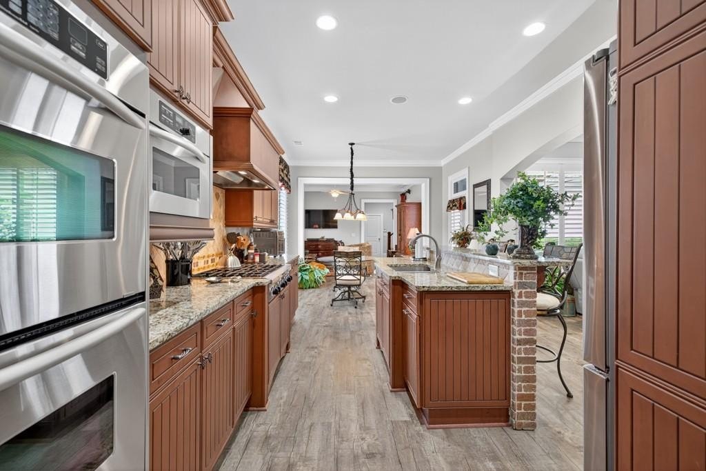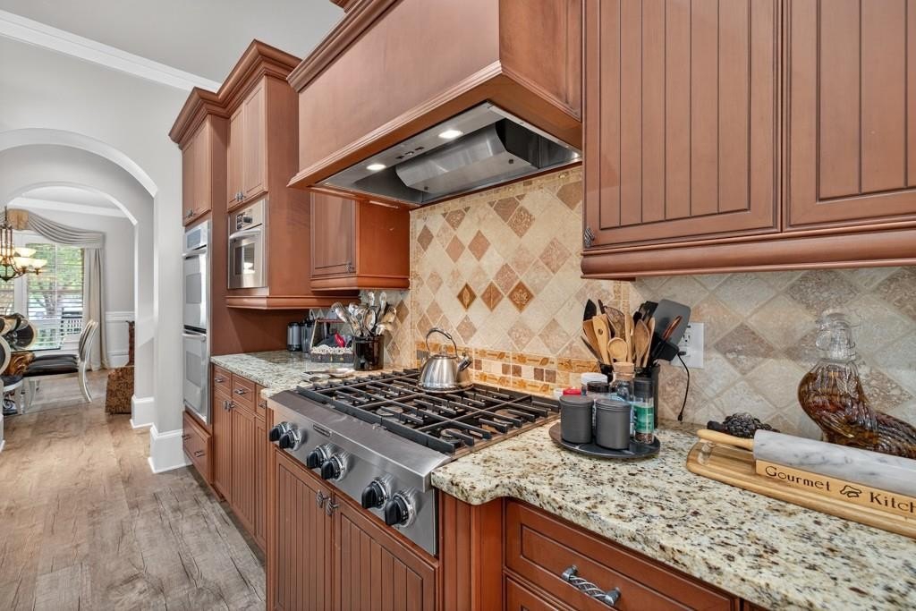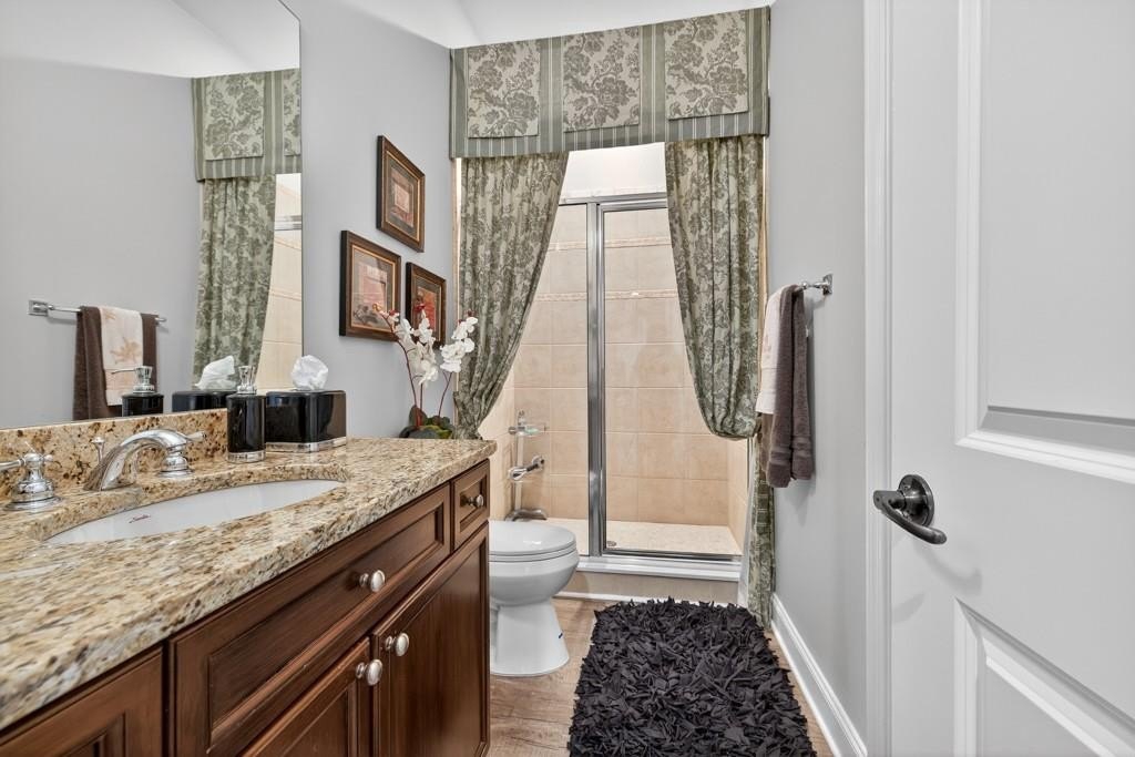 Welcome to this luxuriously upgraded 5-bedroom, 4-bathroom home in the highly sought-after Georgia Club, a gated golf course community known for its Southern charm and resort-style amenities. Situated on a premium corner lot, this beautifully maintained home features a white picket fence, a charming wraparound front porch, and a rear-entry garage, all adding to its curb appeal. Inside, enjoy new flooring, fresh interior and exterior paint, and thoughtful architectural details throughout. The spacious living room features a coffered ceiling, creating a sophisticated and inviting space for gatherings. The kitchen is accented with brick details, blending rustic warmth with modern utility. Perfect for remote work or study, the private office includes custom-built-in shelving. The oversized primary suite is a true retreat, featuring two large custom walk-in closets and a spa-inspired en suite bathroom with a large walk-in shower, double vanities, and elegant finishes. Enjoy year-round efficiency with a solar energy system and keep your landscaping lush with the automated sprinkler system. Located in The Georgia Club, residents have access to world-class amenities: golf, pools, tennis courts, clubhouse, fitness center, and walking trails. This home offers a rare combination of classic Southern charm and modern luxury in one of Georgia's most desirable communities.