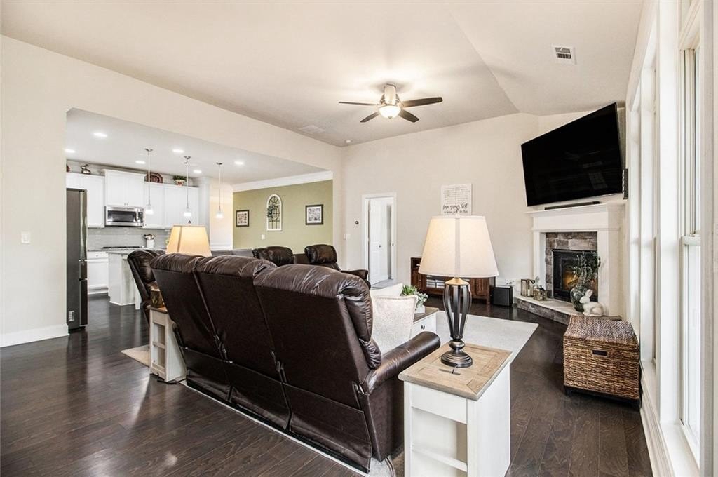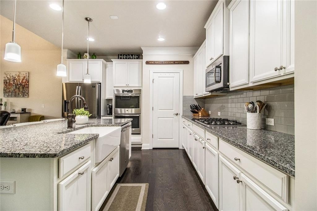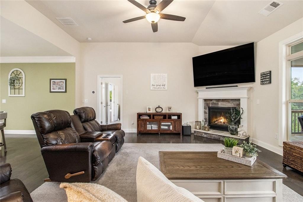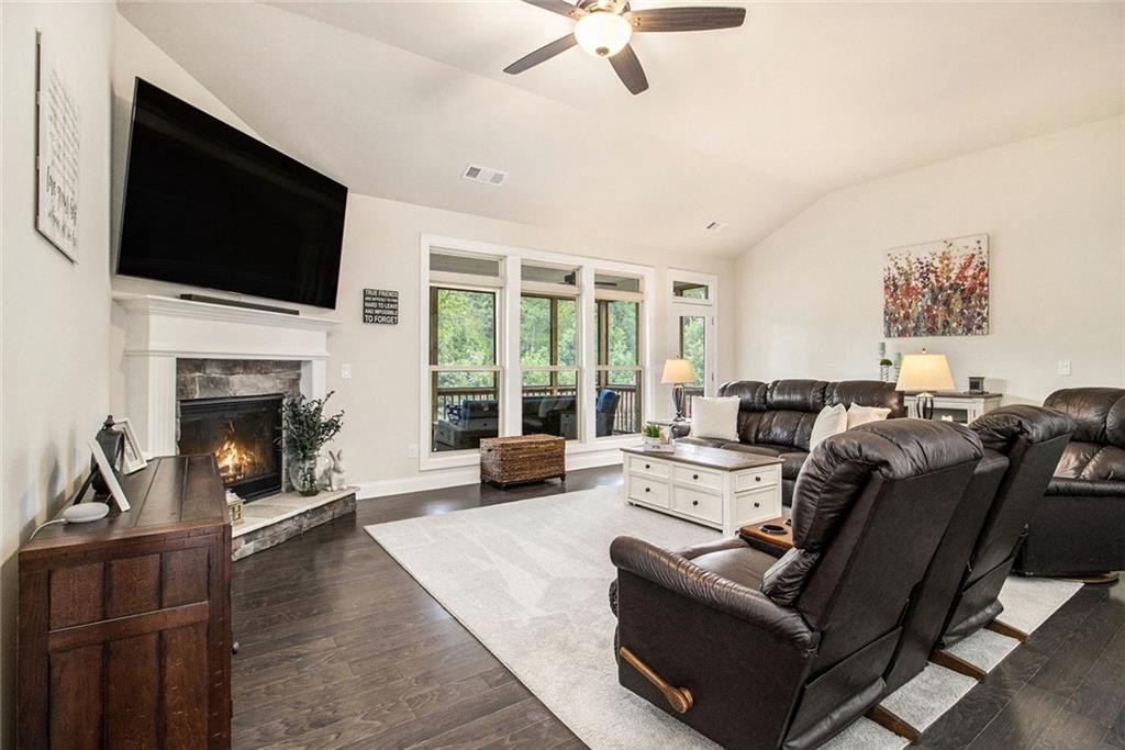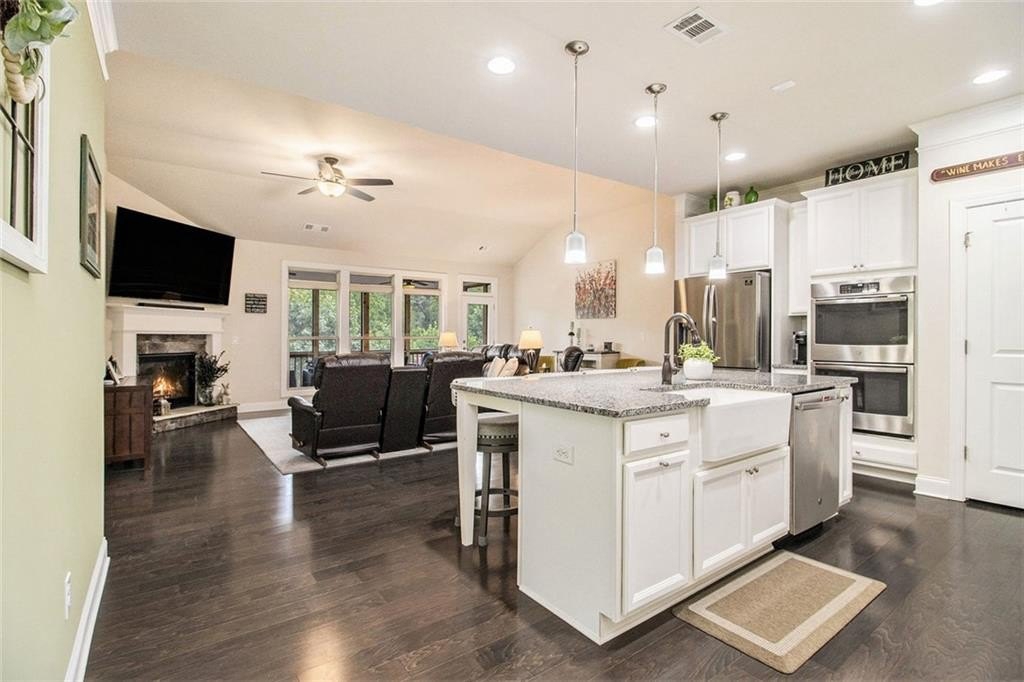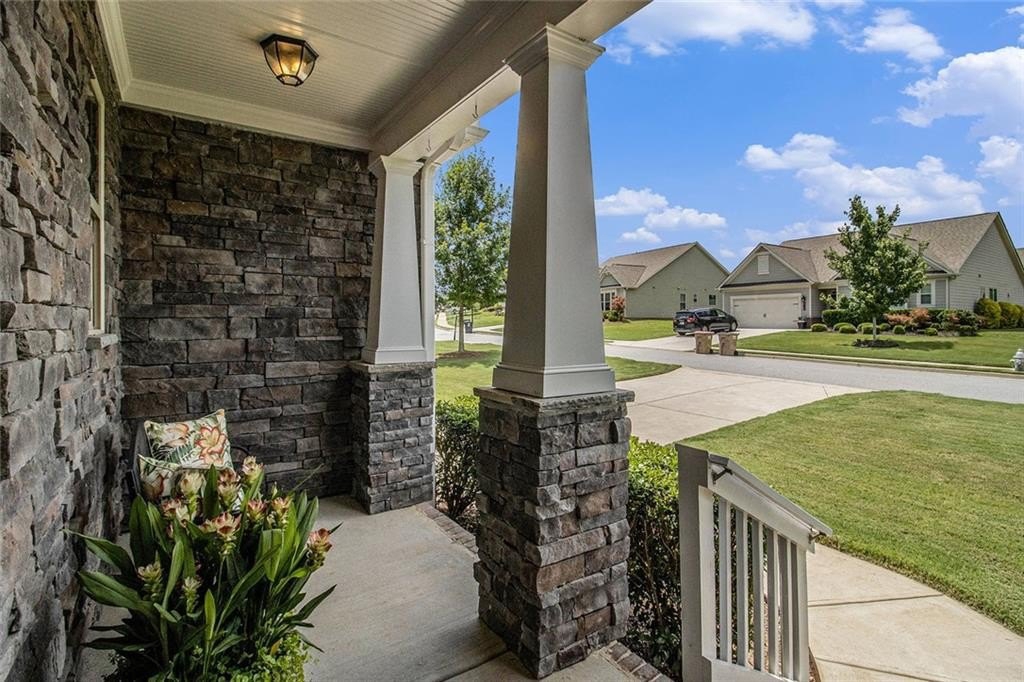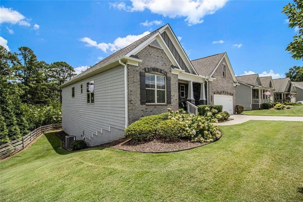 One level living on a full unfinished walk-out basement. This is a well appointed and well maintained home with many Owner upgrades. The home is sited on .41 acre lot that backs up to a wooded area to provide ample privacy. From the stacked stone accents on the front porch to the trey ceiling in the foyer, the quality and luxury you find upon entering the home continues throughout. The home features hardwood flooring in all the main areas and new carpet in the primary bedroom. The open kitchen features double ovens, a farmhouse sink, large kitchen island with pendent lighting, hidden trash receptacles, stainless steel appliances, granite countertops and recessed lighting. The separate dining room seats 12 and has plenty of room for your dinning hutch. It has huge windows with a private view and trey ceiling. All the bathrooms have tiled flooring, tiled baths and showers and and granite countertops. Besides double fans on the screened in porch and a fan in the Great Room, all bedrooms have ceiling fans. The large laundry room features a window, utility sink and cabinets. Outside you can choose to relax on the upstairs screened in porch or the open deck below accessible from the basement. Build out the space you want in the full walk-out daylight basement, stubbed for a full bathroom and still have plenty of storage left over.