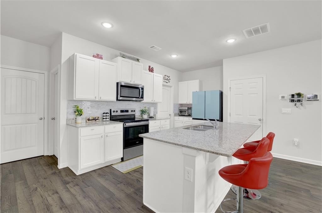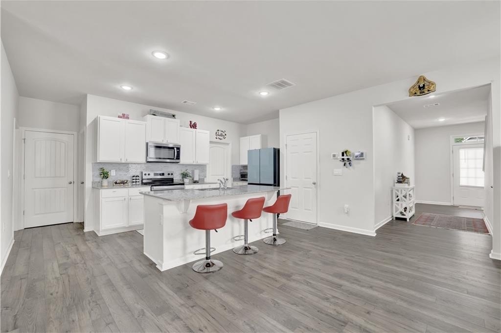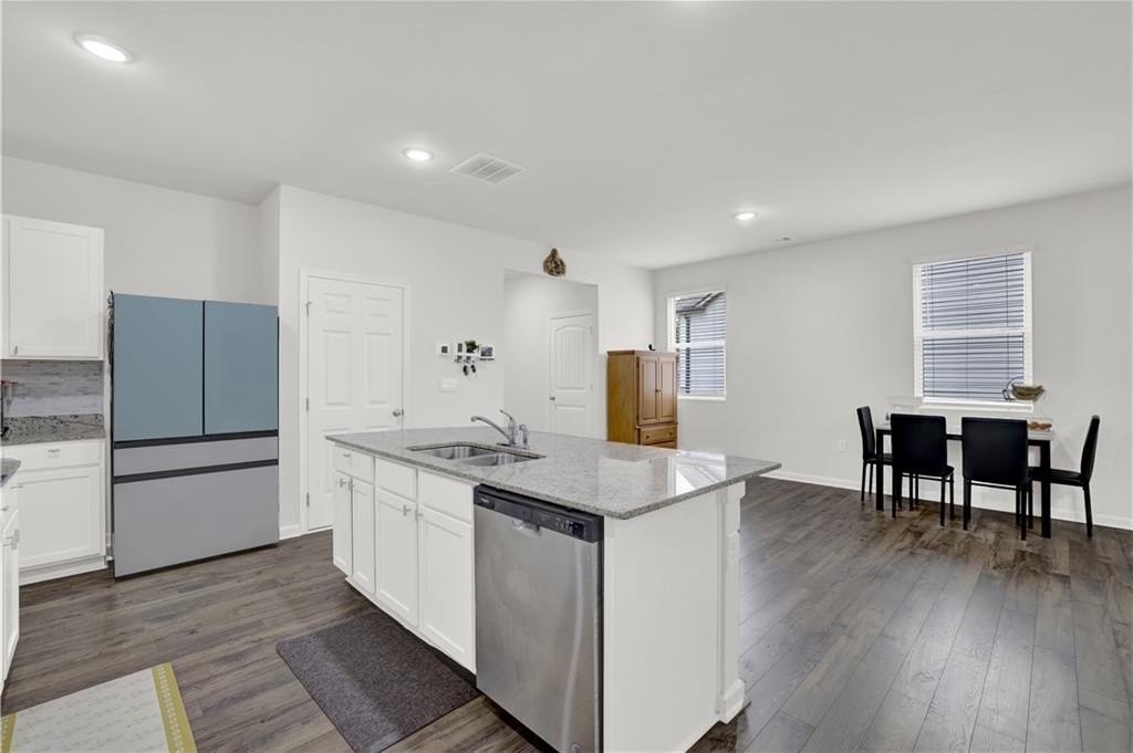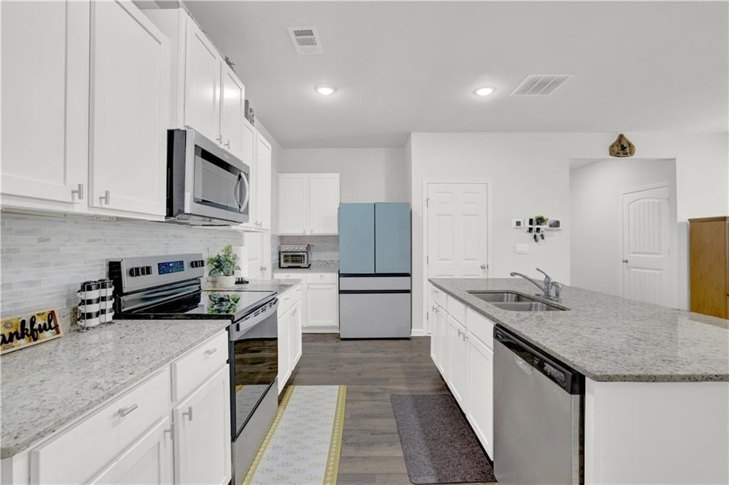 Step inside to a designer kitchen featuring white shaker-style cabinetry with soft-close doors, granite countertops, stainless steel appliances, and a walk-in pantry. The large chef’s island overlooks a spacious open-concept great room, ideal for entertaining or everyday living. RevWood laminate flooring on the main level (excluding bedrooms) ensures style and durability with low maintenance.