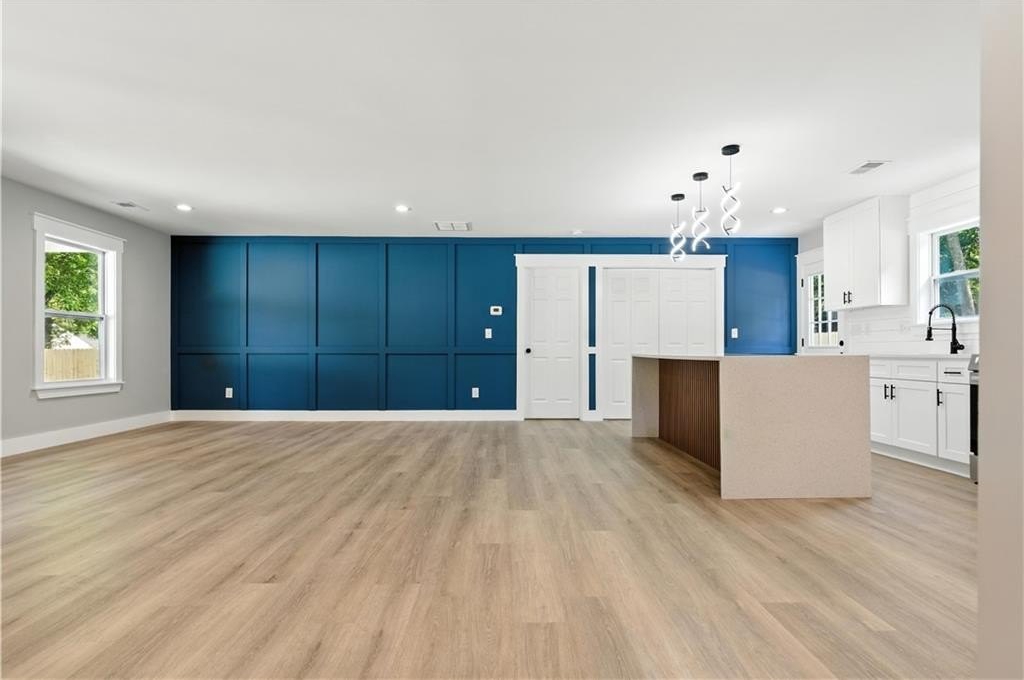 As you cross the threshold, you’re welcomed by clean lines, elevated finishes, and a seamless open floor plan. The heart of the home is the breathtaking kitchen — a true showstopper — featuring a quartz waterfall island with natural wood detail, statement pendant lighting, sleek white cabinetry, and stainless steel appliances. It’s the kind of kitchen that invites conversations, morning coffees, and memorable dinners.