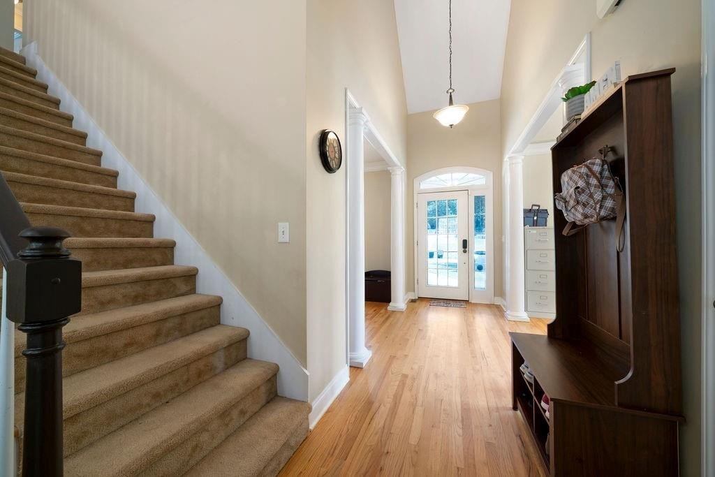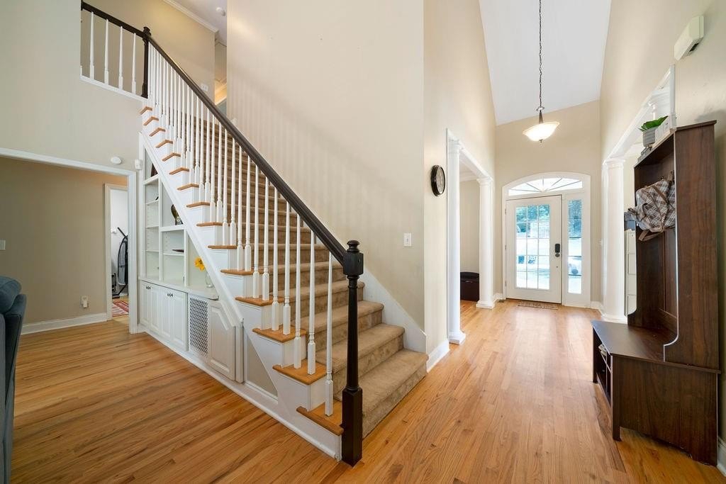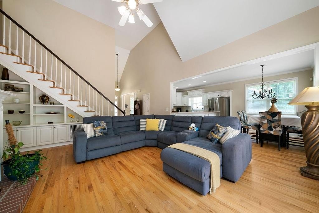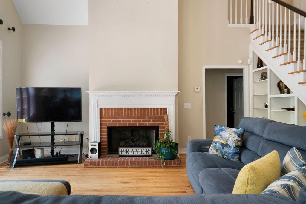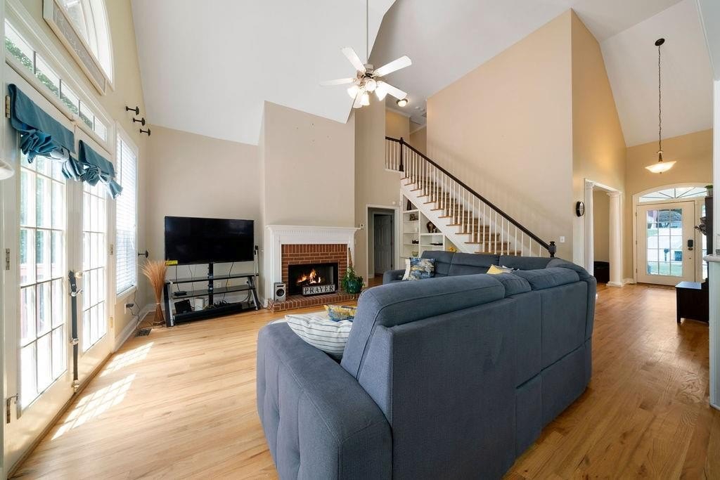 Real hardwood floors with a natural finish flow throughout the main level, while the upper level boasts freshly cleaned plush carpeting. Entertain with ease in the formal Living and Dining rooms, both filled with natural light from oversized windows. The bright and open Kitchen includes ample white cabinetry, stainless steel appliances, and a bar-height counter that opens to a sun-drenched breakfast nook—perfect for enjoying peaceful mornings. The vaulted Family Room is a true showstopper, offering a beautiful brick fireplace, dramatic ceilings, and beautifully crafted built-in shelving. The spacious Laundry Room provides practical storage and hanging space, and the two-car garage comes complete with custom cabinets for additional organization.