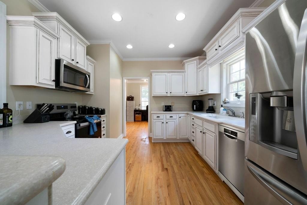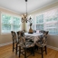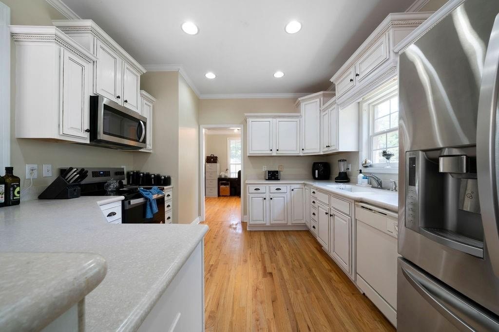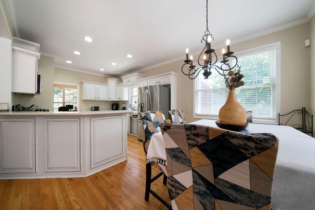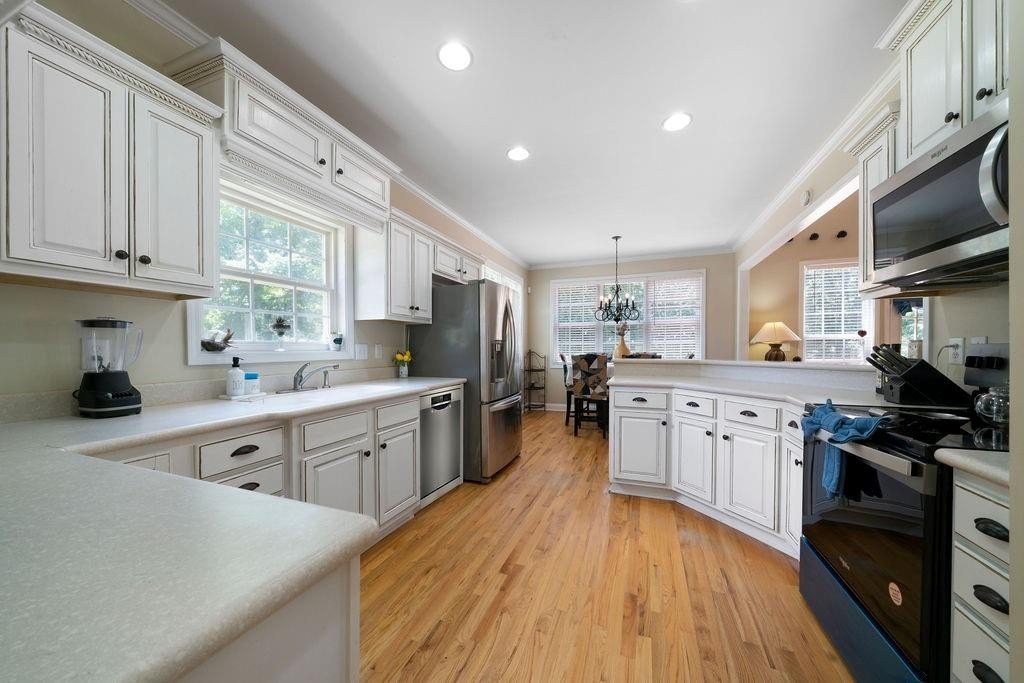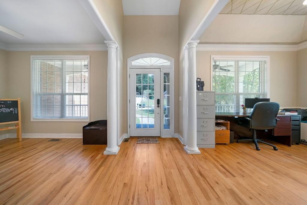 Real hardwood floors with a natural finish flow throughout the main level, while the upper level boasts freshly cleaned plush carpeting. Entertain with ease in the formal Living and Dining rooms, both filled with natural light from oversized windows. The bright and open Kitchen includes ample white cabinetry, stainless steel appliances, and a bar-height counter that opens to a sun-drenched breakfast nook—perfect for enjoying peaceful mornings. The vaulted Family Room is a true showstopper, offering a beautiful brick fireplace, dramatic ceilings, and beautifully crafted built-in shelving. The spacious Laundry Room provides practical storage and hanging space, and the two-car garage comes complete with custom cabinets for additional organization.